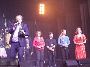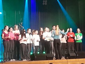Danach präsentierten die musikalischen Ensembles und AGs aus allen Jahrgangsstufen ein frühlingsbuntes Programm von Klassik bis Pop. Dabei waren ein Streicher- und Flötenensemble (Bautz/ Rehren/ Köchlin), das teils zusammen mit dem GyRaChœur (Kemper) einen Bogen von der „Ode an die Freude“ bis zu „Yellow submarine“ schlug, die Beatboxing-AG (Tambke), noch mehr Streicher (Streichan/ Pavlicenco) mit „Open String Samba“ und „Drunken Sailor“, das 5er-Instrumentalensemble (Kemper/ v. Hopffgarten) mit dem „Can Can“ von Offenbach und dem „Cordoba Swing“, die Tanz-AG (Helia), der 5er Chor (Krösser), der ein „Ein Hoch auf uns“ und zusammen mit der Unterstufenband (Tolmacov) „Komet“ anstimmte, der Oberstufenchor (Kemper), der die von der Chorleiterin eigens arrangierten Stücke „Jamaica farewell“ und „Vem kan segla“ zum Besten gab, und nach der Mittelstufenband (Lahann) mit „Don’t stop believing“ und „Kiss me“ schließlich als gelungener Abschluss die Oberstufenband (Lahann), die mit „Be my baby“ und „Yellow“ das Programm abrundete und dabei durch mutige Schülerinnen unterstützt wurde, welche die erkrankte Sängerin des letzten Stückes ersetzten. Mit viel Einsatz haben die SchülerInnen und LehrerInnen des GyRa einen wunderschönen musikalischen Frühlingsstrauß gezaubert, der viele Zuhörer nach dem schon traditionellen gemeinsamen Stühlestapeln mit einem zufriedenen Lächeln in den lauen Frühlingsabend auf den Heimweg schickte.