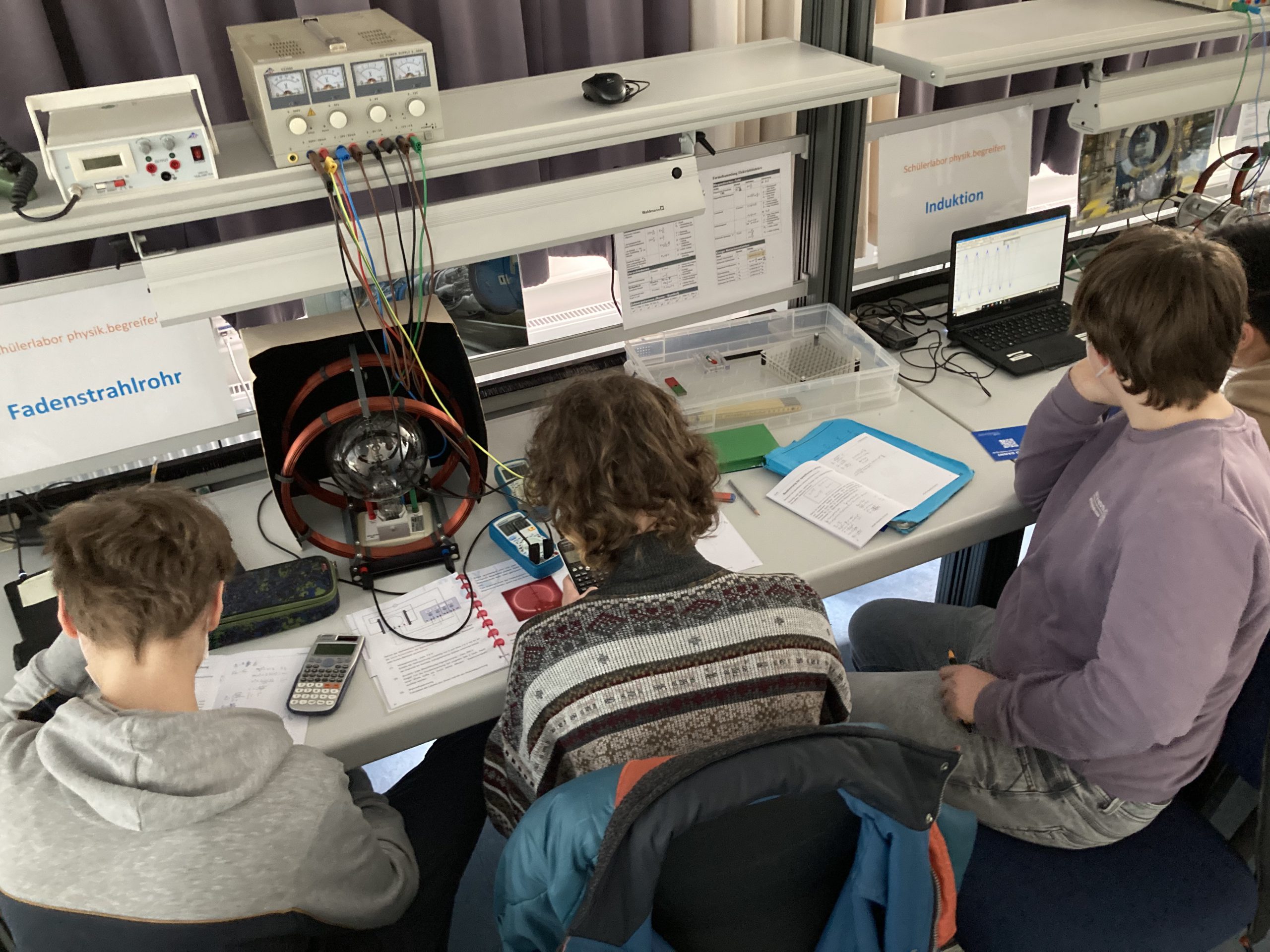Am Mittwoch, den 15.02.23 haben die Schüler*innen des S2-Oberstufenprofils “Technik im Fokus” Experimente im Elektronenlabor am DESY durchgeführt und ausgewertet. Unter anderem wurden Lissajous-Figuren an einer Elektronenstrahlröhre dargestellt, um ein besseres Verständnis für die Funktion von Quadrupolmagneten zu erlangen, welche im Anschluss zum Einsatz kamen, um die Stärke des Erdmagnetfeldes zu messen. Solche Magnete werden in Teilchenbeschleunigern wie dem Large Hadron Collider am CERN eingesetzt, um den Teilchenstrahl zu fokussieren. Aber es wurden auch Myonen untersucht, die „großen Geschwister“ des Elektrons, welche durch Wechselwirkungen kosmischer Strahlung mit den Atomen unserer Erdatmosphäre entstehen. Obwohl diese in 10km Höhe erzeugt werden, und nach ca. 2,2 Mikrosekunden in andere Teilchen zerfallen, können Sie trotzdem auf der Erdoberfläche nachgewiesen werden – ein Phänomen, welches mit der speziellen Relativitätstheorie erklärt werden kann. Darüber hinaus wurden Spannungen mit einer Drehspule erzeugt, Elektronen beschleunigt und auf Kreisbahnen geschickt, sowie die Bahnen von radioaktiver Strahlung in einem Magnetfeld untersucht, welche Anhand der Krümmung einen Aufschluss über die Art der Teilchen geben. Außerdem haben die Schüler*innen einen Blick auf die große Nebelkammer werfen dürfen, in welcher die Spuren radioaktiver Teilchen sichtbar gemacht wurden.