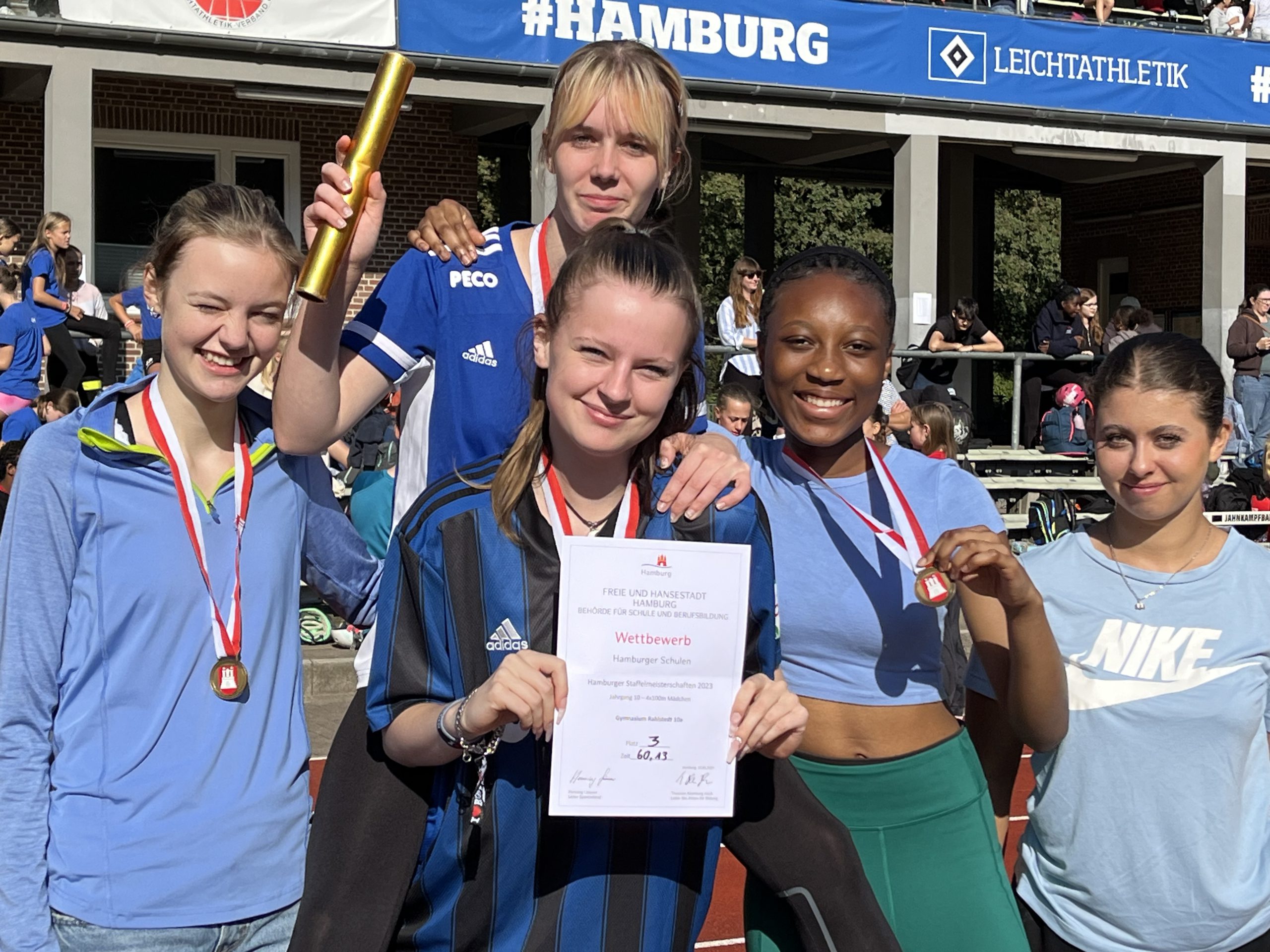 Am 15.9.2023 trafen sich die schnellsten Staffeln der Hamburger Schulen bei den Hamburger Meisterschaften im Staffellauf. Das Gymnasium Rahlstedt wurde durch die schnellen Läuferinnen und Läufer der Klasse 10a vertreten. Die 4 x 100m Mädchenstaffel erreichte mit schnellen 60,1 Sek. einen tollen dritten Platz und freute sich somit über die Bronze-Medaille. Die Jungen holten bei den Wandsbeker Meisterschaften Gold (50,5 Sek.) und belegten bei den Hamburger Meisterschaften einen guten Platz 4. Herzlichen Glückwunsch zu diesen tollen Leistungen!
