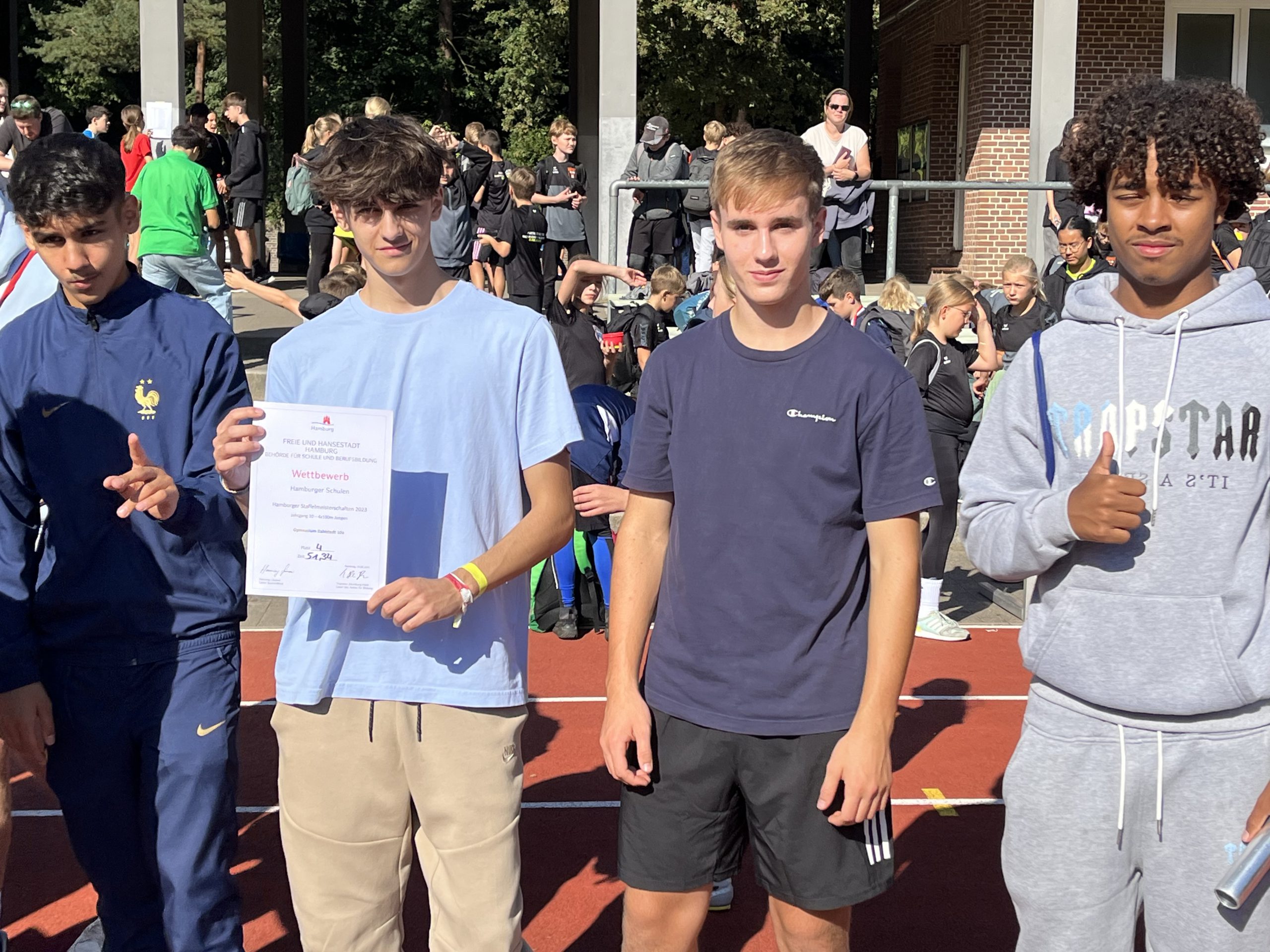 Am 15.9.2023 trafen sich die schnellsten Staffeln der Hamburger Schulen bei den Hamburger Meisterschaften im Staffellauf. Das Gymnasium Rahlstedt wurde durch die schnellen Läuferinnen und Läufer der Klasse 10a vertreten. Die 4 x 100m Mädchenstaffel erreichte mit schnellen 60,1 Sek. einen tollen dritten Platz und freute sich somit über die Bronze-Medaille. Die Jungen holten bei den Wandsbeker Meisterschaften Gold (50,5 Sek.) und belegten bei den Hamburger Meisterschaften einen guten Platz 4. Herzlichen Glückwunsch zu diesen tollen Leistungen!
