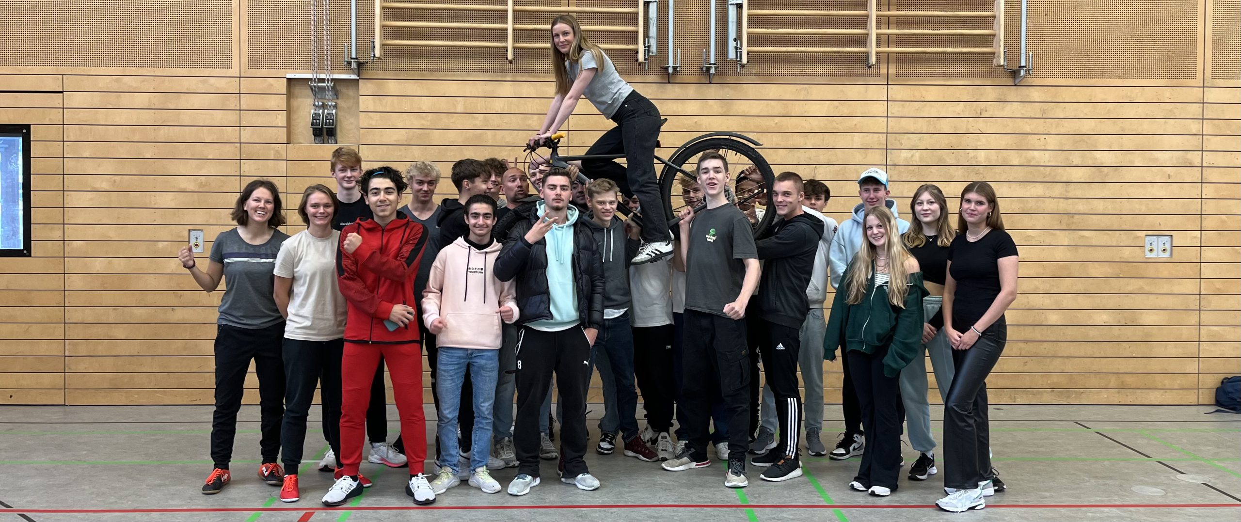 Gruppe von Jugendlichen, die in einer Halle zusammenstehen. Einige Personen posieren lächelnd, während eine Person auf einer anderen steht. Die Umgebung ist mit Holzpaneelen gestaltet, und im Hintergrund sind Sportgeräte sichtbar.
