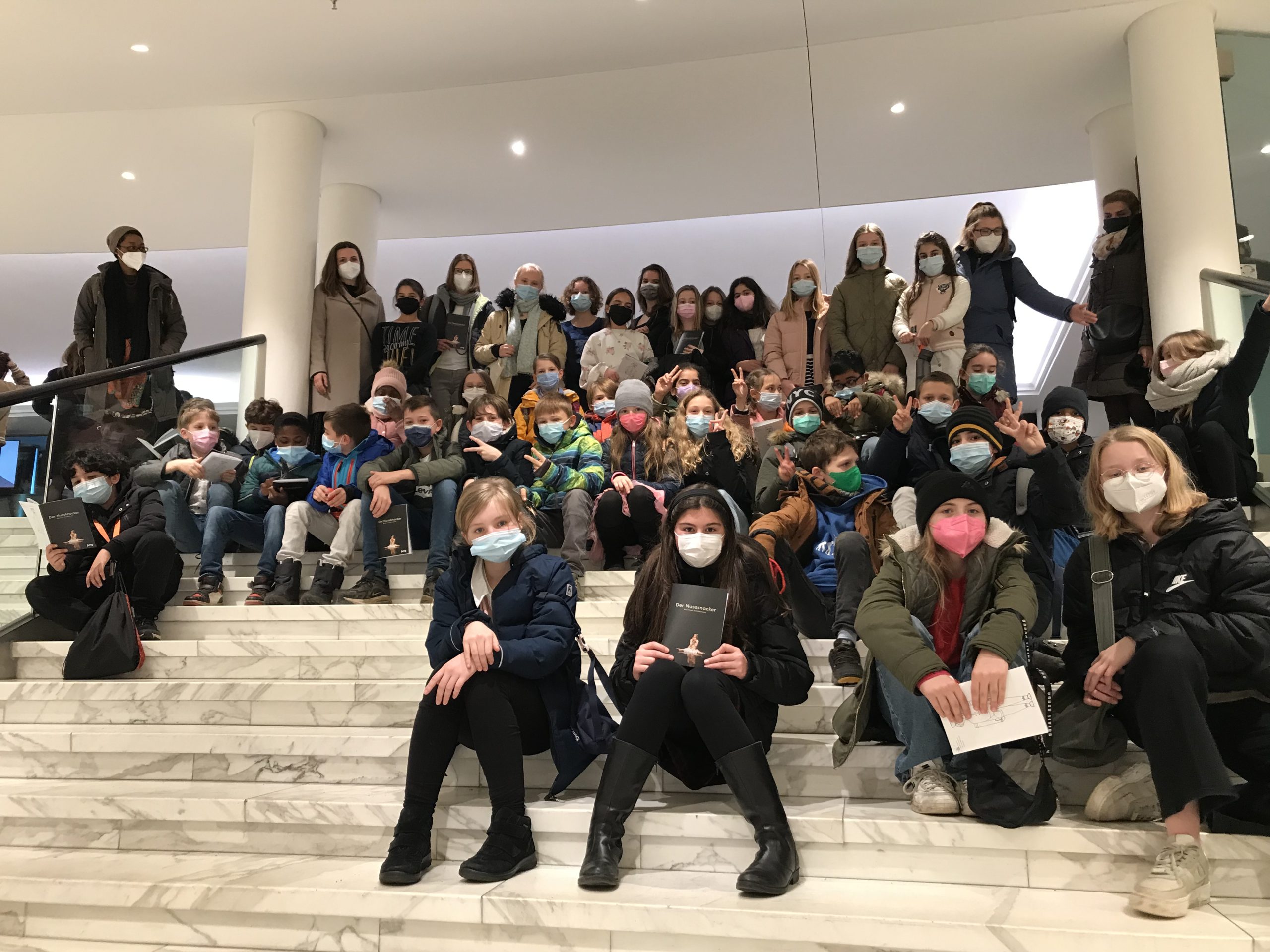 Eine große Gruppe von Menschen sitzt und steht auf einer Treppe in einem hellen, modernen Gebäude. Alle tragen Masken. Die Gruppe besteht aus Kindern und Erwachsenen, die in verschiedenen Positionen und Posen angeordnet sind. Einige Personen sitzen auf den Stufen, während andere im Hintergrund stehen.
