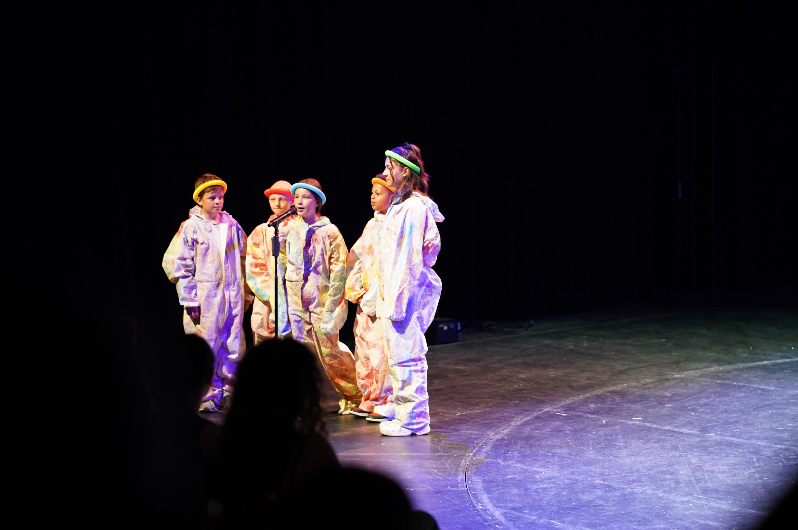 Eine Gruppe von Kindern in bunten Overalls steht auf einer Bühne. Die Kinder tragen Overalls in verschiedenen Farben, darunter Orange, Rot, Grün und Blau. Sie scheinen sich zu unterhalten und miteinander zu interagieren. Der Hintergrund der Bühne ist in dunklen Farben gehalten und zeigt eine gestreifte Beleuchtung. Tanzende Personen in bunten, leuchtenden Kostümen bewegen sich auf einer dunklen Bühne. Die Kostüme reflektieren verschiedene Farben und Muster, was eine dynamische und festliche Atmosphäre schafft. Sechs Personen auf einer Bühne tragen leuchtend orangefarbene und grüne Overalls. Sie stehen Rücken zur Kamera und zeigen mit dem Finger in verschiedene Richtungen. Die Bühne ist schwach beleuchtet, und der Hintergrund besteht aus horizontalen blauen Lichtstreifen. Das Bild vermittelt eine dynamische und aufgeregte Atmosphäre. Fünf Tänzer in bunten Kostümen stehen auf einer Bühne. Sie beugen sich nach hinten, während sie in einer Reihe angeordnet sind. Im Hintergrund ist ein Mikrofon sichtbar und die Bühnenbeleuchtung sorgt für eine lebendige Atmosphäre. Eine Gruppe von Tänzern in bunten, weiten Outfits führt eine choreografierte Tanzaufführung auf einer Bühne durch. Die Tänzer stehen in verschiedenen Posen und zeigen dynamische Bewegungen. Der Hintergrund ist in sanften Farben gehalten, die die Performance betonen. Fünf Personen in bunten Hüten und weißen Overalls stehen auf einer Bühne. Sie scheinen sich zu unterhalten oder zu interagieren, während das Licht sanft auf sie fällt. Im Hintergrund ist eine dunkle Kulisse zu sehen, die die Aufmerksamkeit auf die Darsteller lenkt. Zwei Kinder in farbigen Overalls stehen auf einer Bühne. Das erste Kind trägt einen grauen Overall und reicht dem anderen Kind, das einen roten Overall trägt, einen bunten Gegenstand. Die Bühne ist beleuchtet und hat eine farbige Hintergrundbeleuchtung. Fünf Kinder stehen auf einer Bühne. Sie tragen bunte Kostüme, zwei in gelb und einer in grün, während die anderen zwei ebenfalls in gelben Kostümen gekleidet sind. Ein Mikrofon steht vor ihnen. Die Kinder scheinen in einer Aufführung oder einem Theaterstück zu sein. Der Hintergrund der Bühne ist dunkel und schlicht. Eine Gruppe von sieben Kindern steht auf einer Bühne. Sie tragen blaue Overalls und stehen in einem Halbkreis um einen einzelnen Jungen, der ein Mikrofon in der Hand hält. Die Szene ist gut beleuchtet, und der Hintergrund ist dunkel. Die Kinder scheinen aufmerksam zuzuhören und miteinander zu interagieren. Eine Gruppe von Kindern in bunten Overalls (orange, gelb, grün und rot) steht auf einer Bühne. Sie sind um ein Mikrofon versammelt und scheinen an einer Aufführung teilzunehmen. Der Hintergrund ist farblich gestreift und sorgt für eine lebendige Atmosphäre. Eine Gruppe von Kindern steht auf einer Bühne in bunten Overalls. Die Overalls sind in den Farben orange, gelb, rot und grün. Die Kinder sind in einer Reihe aufgestellt, einige schauen nach vorne, andere zur Seite. Im Hintergrund sind bunte Streifen zu sehen, die die Bühne dekorieren. Ein Mikrofon steht links auf der Bühne. Eine Gruppe von Menschen in bunten Overalls steht eng zusammen auf einer Bühne. Sie sind in einem Kreis angeordnet und scheinen sich zu umarmen oder zu besprechen. Der Hintergrund der Bühne ist farbig beleuchtet. Eine Gruppe von Kindern in bunten Overalls steht auf einer Bühne. Die Kinder interagieren miteinander, während sie fröhlich lachen und sich bewegen. Die Bühne ist mit einem farbigen Hintergrund beleuchtet, der eine lebendige Atmosphäre schafft. Gruppentanzaufführung auf einer Bühne mit mehreren Tänzern in bunten Overalls (rot, gelb, blau und lila), die in verschiedenen Posen und Bewegungen interagieren. Der Hintergrund ist dunkel und die Bühne ist gut beleuchtet. Sechs Kinder in bunten Kostümen und Hüten stehen auf einer Bühne und wirken, als ob sie eine Aufführung haben. Die Bühne ist schwach beleuchtet und der Hintergrund ist schwarz. Einige Zuschauer sind im Vordergrund sichtbar. Vier Personen stehen auf einer Bühne in einem Theater mit roten Sitzen im Hintergrund. Sie halten bunte Blumensträuße und lächeln. Die Atmosphäre wirkt festlich und freundlich. Eine Gruppe von Menschen in bunten Kostümen steht auf einer Bühne und applaudiert. Die Kostüme sind in verschiedenen Farben gehalten, darunter grün, gelb, blau, rot und orange. Im Vordergrund sind einige Zuschauer zu sehen, die ebenfalls applaudieren. Die Szene vermittelt eine festliche Atmosphäre. Eine Gruppe von Tänzern in bunten Kostümen führt auf einer Theaterbühne eine dynamische Tanzperformance auf. Der Bühnenboden ist beleuchtet und die Zuschauer im Vordergrund sind teilweise sichtbar. Eine Gruppe von Personen führt auf einer Bühne eine Aufführung auf. Einige Darsteller tragen bunte Kostüme in verschiedenen Farben, während andere eine Mischung aus auffälligen Outfits zeigen. Im Vordergrund sind Zuschauer zu sehen, die die Aufführung beobachten. Die Bühne ist schwach beleuchtet und die Atmosphäre wirkt lebhaft und fröhlich. Eine Gruppe von Kindern in bunten Overalls steht auf einer Bühne. Einige Kinder tragen grüne Overalls mit Blättern, während andere in gelben und orangefarbenen Overalls gekleidet sind. Sie bewegen sich und interagieren miteinander, auf einem dunklen Bühnenhintergrund. Sechs Kinder in bunten Overalls und Hüten stehen auf einer Bühne. Sie sind in einer Gruppe versammelt und schauen nach vorne, während ein Mikrofon vor ihnen steht. Die Beleuchtung ist farbig und erzeugt eine lebendige Atmosphäre. Im Hintergrund sind unscharfe Silhouetten von Zuschauern zu sehen.
