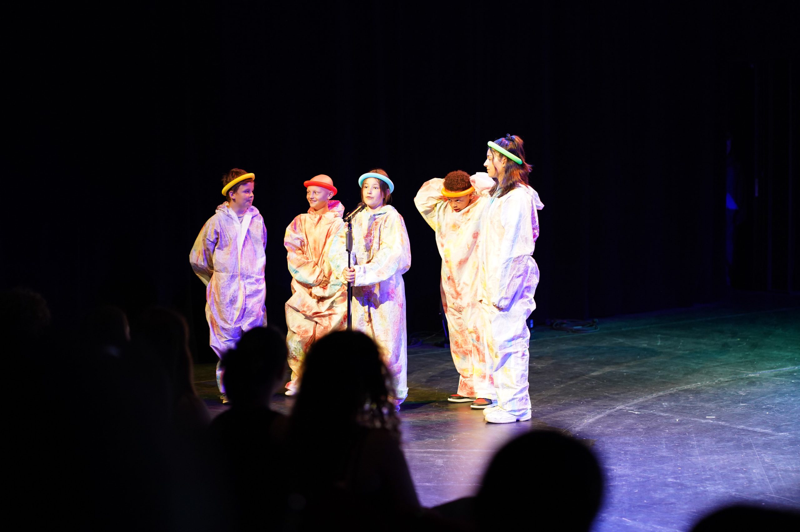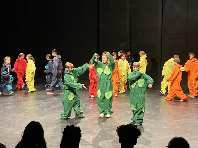 Eine Gruppe von Kindern in bunten Overalls steht auf einer Bühne. Die Kinder tragen Overalls in verschiedenen Farben, darunter Orange, Rot, Grün und Blau. Sie scheinen sich zu unterhalten und miteinander zu interagieren. Der Hintergrund der Bühne ist in dunklen Farben gehalten und zeigt eine gestreifte Beleuchtung. Tanzende Personen in bunten, leuchtenden Kostümen bewegen sich auf einer dunklen Bühne. Die Kostüme reflektieren verschiedene Farben und Muster, was eine dynamische und festliche Atmosphäre schafft. Sechs Personen auf einer Bühne tragen leuchtend orangefarbene und grüne Overalls. Sie stehen Rücken zur Kamera und zeigen mit dem Finger in verschiedene Richtungen. Die Bühne ist schwach beleuchtet, und der Hintergrund besteht aus horizontalen blauen Lichtstreifen. Das Bild vermittelt eine dynamische und aufgeregte Atmosphäre. Fünf Tänzer in bunten Kostümen stehen auf einer Bühne. Sie beugen sich nach hinten, während sie in einer Reihe angeordnet sind. Im Hintergrund ist ein Mikrofon sichtbar und die Bühnenbeleuchtung sorgt für eine lebendige Atmosphäre. Eine Gruppe von Tänzern in bunten, weiten Outfits führt eine choreografierte Tanzaufführung auf einer Bühne durch. Die Tänzer stehen in verschiedenen Posen und zeigen dynamische Bewegungen. Der Hintergrund ist in sanften Farben gehalten, die die Performance betonen. Fünf Personen in bunten Hüten und weißen Overalls stehen auf einer Bühne. Sie scheinen sich zu unterhalten oder zu interagieren, während das Licht sanft auf sie fällt. Im Hintergrund ist eine dunkle Kulisse zu sehen, die die Aufmerksamkeit auf die Darsteller lenkt. Zwei Kinder in farbigen Overalls stehen auf einer Bühne. Das erste Kind trägt einen grauen Overall und reicht dem anderen Kind, das einen roten Overall trägt, einen bunten Gegenstand. Die Bühne ist beleuchtet und hat eine farbige Hintergrundbeleuchtung. Fünf Kinder stehen auf einer Bühne. Sie tragen bunte Kostüme, zwei in gelb und einer in grün, während die anderen zwei ebenfalls in gelben Kostümen gekleidet sind. Ein Mikrofon steht vor ihnen. Die Kinder scheinen in einer Aufführung oder einem Theaterstück zu sein. Der Hintergrund der Bühne ist dunkel und schlicht. Eine Gruppe von sieben Kindern steht auf einer Bühne. Sie tragen blaue Overalls und stehen in einem Halbkreis um einen einzelnen Jungen, der ein Mikrofon in der Hand hält. Die Szene ist gut beleuchtet, und der Hintergrund ist dunkel. Die Kinder scheinen aufmerksam zuzuhören und miteinander zu interagieren. Eine Gruppe von Kindern in bunten Overalls (orange, gelb, grün und rot) steht auf einer Bühne. Sie sind um ein Mikrofon versammelt und scheinen an einer Aufführung teilzunehmen. Der Hintergrund ist farblich gestreift und sorgt für eine lebendige Atmosphäre. Eine Gruppe von Kindern steht auf einer Bühne in bunten Overalls. Die Overalls sind in den Farben orange, gelb, rot und grün. Die Kinder sind in einer Reihe aufgestellt, einige schauen nach vorne, andere zur Seite. Im Hintergrund sind bunte Streifen zu sehen, die die Bühne dekorieren. Ein Mikrofon steht links auf der Bühne. Eine Gruppe von Menschen in bunten Overalls steht eng zusammen auf einer Bühne. Sie sind in einem Kreis angeordnet und scheinen sich zu umarmen oder zu besprechen. Der Hintergrund der Bühne ist farbig beleuchtet. Eine Gruppe von Kindern in bunten Overalls steht auf einer Bühne. Die Kinder interagieren miteinander, während sie fröhlich lachen und sich bewegen. Die Bühne ist mit einem farbigen Hintergrund beleuchtet, der eine lebendige Atmosphäre schafft. Gruppentanzaufführung auf einer Bühne mit mehreren Tänzern in bunten Overalls (rot, gelb, blau und lila), die in verschiedenen Posen und Bewegungen interagieren. Der Hintergrund ist dunkel und die Bühne ist gut beleuchtet. Sechs Kinder in bunten Kostümen und Hüten stehen auf einer Bühne und wirken, als ob sie eine Aufführung haben. Die Bühne ist schwach beleuchtet und der Hintergrund ist schwarz. Einige Zuschauer sind im Vordergrund sichtbar. Vier Personen stehen auf einer Bühne in einem Theater mit roten Sitzen im Hintergrund. Sie halten bunte Blumensträuße und lächeln. Die Atmosphäre wirkt festlich und freundlich. Eine Gruppe von Menschen in bunten Kostümen steht auf einer Bühne und applaudiert. Die Kostüme sind in verschiedenen Farben gehalten, darunter grün, gelb, blau, rot und orange. Im Vordergrund sind einige Zuschauer zu sehen, die ebenfalls applaudieren. Die Szene vermittelt eine festliche Atmosphäre. Eine Gruppe von Tänzern in bunten Kostümen führt auf einer Theaterbühne eine dynamische Tanzperformance auf. Der Bühnenboden ist beleuchtet und die Zuschauer im Vordergrund sind teilweise sichtbar. Eine Gruppe von Personen führt auf einer Bühne eine Aufführung auf. Einige Darsteller tragen bunte Kostüme in verschiedenen Farben, während andere eine Mischung aus auffälligen Outfits zeigen. Im Vordergrund sind Zuschauer zu sehen, die die Aufführung beobachten. Die Bühne ist schwach beleuchtet und die Atmosphäre wirkt lebhaft und fröhlich. Eine Gruppe von Kindern in bunten Overalls steht auf einer Bühne. Einige Kinder tragen grüne Overalls mit Blättern, während andere in gelben und orangefarbenen Overalls gekleidet sind. Sie bewegen sich und interagieren miteinander, auf einem dunklen Bühnenhintergrund. Sechs Kinder in bunten Overalls und Hüten stehen auf einer Bühne. Sie sind in einer Gruppe versammelt und schauen nach vorne, während ein Mikrofon vor ihnen steht. Die Beleuchtung ist farbig und erzeugt eine lebendige Atmosphäre. Im Hintergrund sind unscharfe Silhouetten von Zuschauern zu sehen.