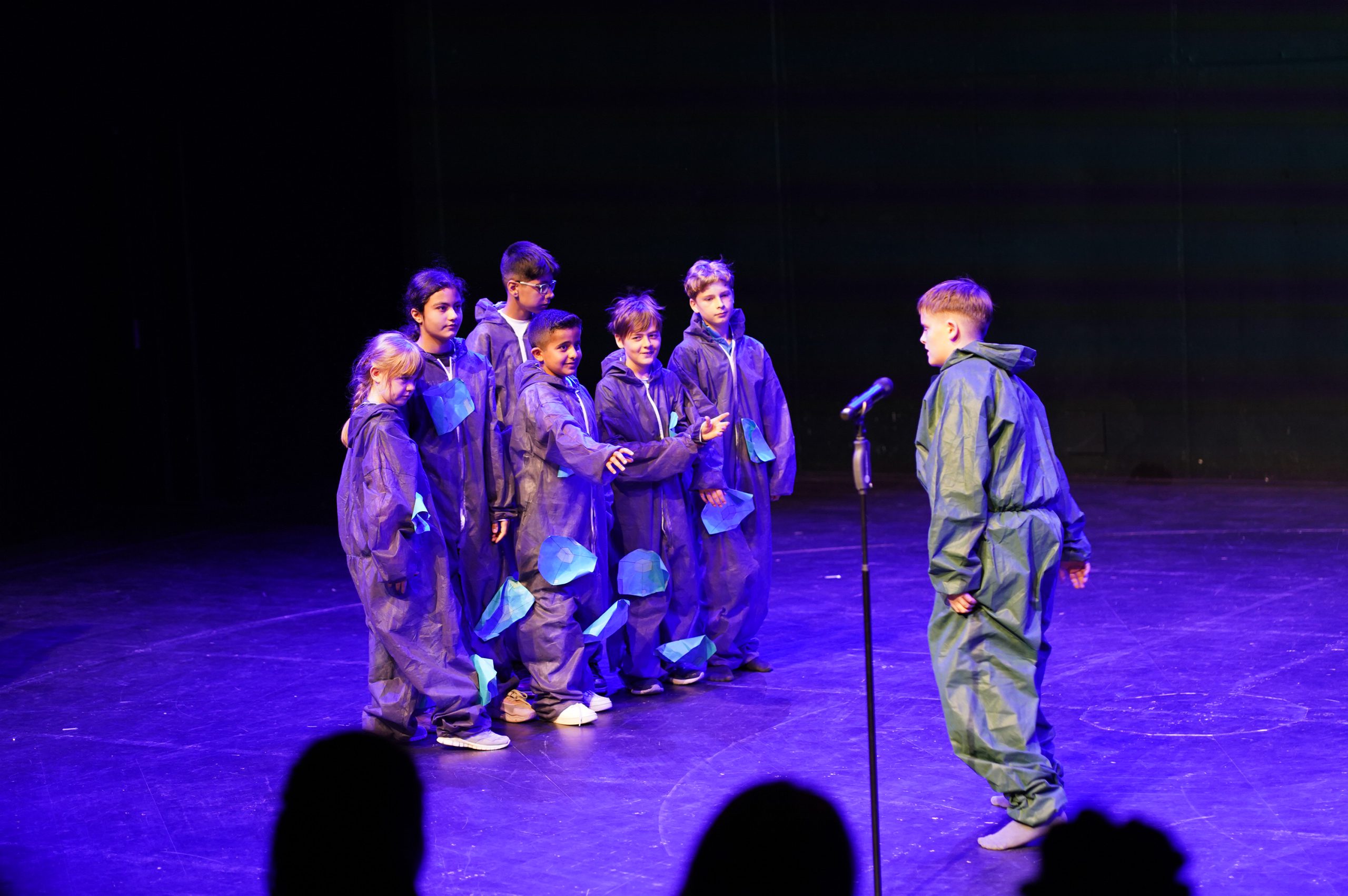 Eine Gruppe von Kindern in bunten Overalls steht auf einer Bühne. Die Kinder tragen Overalls in verschiedenen Farben, darunter Orange, Rot, Grün und Blau. Sie scheinen sich zu unterhalten und miteinander zu interagieren. Der Hintergrund der Bühne ist in dunklen Farben gehalten und zeigt eine gestreifte Beleuchtung. Tanzende Personen in bunten, leuchtenden Kostümen bewegen sich auf einer dunklen Bühne. Die Kostüme reflektieren verschiedene Farben und Muster, was eine dynamische und festliche Atmosphäre schafft. Sechs Personen auf einer Bühne tragen leuchtend orangefarbene und grüne Overalls. Sie stehen Rücken zur Kamera und zeigen mit dem Finger in verschiedene Richtungen. Die Bühne ist schwach beleuchtet, und der Hintergrund besteht aus horizontalen blauen Lichtstreifen. Das Bild vermittelt eine dynamische und aufgeregte Atmosphäre. Fünf Tänzer in bunten Kostümen stehen auf einer Bühne. Sie beugen sich nach hinten, während sie in einer Reihe angeordnet sind. Im Hintergrund ist ein Mikrofon sichtbar und die Bühnenbeleuchtung sorgt für eine lebendige Atmosphäre. Eine Gruppe von Tänzern in bunten, weiten Outfits führt eine choreografierte Tanzaufführung auf einer Bühne durch. Die Tänzer stehen in verschiedenen Posen und zeigen dynamische Bewegungen. Der Hintergrund ist in sanften Farben gehalten, die die Performance betonen. Fünf Personen in bunten Hüten und weißen Overalls stehen auf einer Bühne. Sie scheinen sich zu unterhalten oder zu interagieren, während das Licht sanft auf sie fällt. Im Hintergrund ist eine dunkle Kulisse zu sehen, die die Aufmerksamkeit auf die Darsteller lenkt. Zwei Kinder in farbigen Overalls stehen auf einer Bühne. Das erste Kind trägt einen grauen Overall und reicht dem anderen Kind, das einen roten Overall trägt, einen bunten Gegenstand. Die Bühne ist beleuchtet und hat eine farbige Hintergrundbeleuchtung. Fünf Kinder stehen auf einer Bühne. Sie tragen bunte Kostüme, zwei in gelb und einer in grün, während die anderen zwei ebenfalls in gelben Kostümen gekleidet sind. Ein Mikrofon steht vor ihnen. Die Kinder scheinen in einer Aufführung oder einem Theaterstück zu sein. Der Hintergrund der Bühne ist dunkel und schlicht. Eine Gruppe von sieben Kindern steht auf einer Bühne. Sie tragen blaue Overalls und stehen in einem Halbkreis um einen einzelnen Jungen, der ein Mikrofon in der Hand hält. Die Szene ist gut beleuchtet, und der Hintergrund ist dunkel. Die Kinder scheinen aufmerksam zuzuhören und miteinander zu interagieren. Eine Gruppe von Kindern in bunten Overalls (orange, gelb, grün und rot) steht auf einer Bühne. Sie sind um ein Mikrofon versammelt und scheinen an einer Aufführung teilzunehmen. Der Hintergrund ist farblich gestreift und sorgt für eine lebendige Atmosphäre. Eine Gruppe von Kindern steht auf einer Bühne in bunten Overalls. Die Overalls sind in den Farben orange, gelb, rot und grün. Die Kinder sind in einer Reihe aufgestellt, einige schauen nach vorne, andere zur Seite. Im Hintergrund sind bunte Streifen zu sehen, die die Bühne dekorieren. Ein Mikrofon steht links auf der Bühne. Eine Gruppe von Menschen in bunten Overalls steht eng zusammen auf einer Bühne. Sie sind in einem Kreis angeordnet und scheinen sich zu umarmen oder zu besprechen. Der Hintergrund der Bühne ist farbig beleuchtet. Eine Gruppe von Kindern in bunten Overalls steht auf einer Bühne. Die Kinder interagieren miteinander, während sie fröhlich lachen und sich bewegen. Die Bühne ist mit einem farbigen Hintergrund beleuchtet, der eine lebendige Atmosphäre schafft. Gruppentanzaufführung auf einer Bühne mit mehreren Tänzern in bunten Overalls (rot, gelb, blau und lila), die in verschiedenen Posen und Bewegungen interagieren. Der Hintergrund ist dunkel und die Bühne ist gut beleuchtet. Sechs Kinder in bunten Kostümen und Hüten stehen auf einer Bühne und wirken, als ob sie eine Aufführung haben. Die Bühne ist schwach beleuchtet und der Hintergrund ist schwarz. Einige Zuschauer sind im Vordergrund sichtbar. Vier Personen stehen auf einer Bühne in einem Theater mit roten Sitzen im Hintergrund. Sie halten bunte Blumensträuße und lächeln. Die Atmosphäre wirkt festlich und freundlich. Eine Gruppe von Menschen in bunten Kostümen steht auf einer Bühne und applaudiert. Die Kostüme sind in verschiedenen Farben gehalten, darunter grün, gelb, blau, rot und orange. Im Vordergrund sind einige Zuschauer zu sehen, die ebenfalls applaudieren. Die Szene vermittelt eine festliche Atmosphäre. Eine Gruppe von Tänzern in bunten Kostümen führt auf einer Theaterbühne eine dynamische Tanzperformance auf. Der Bühnenboden ist beleuchtet und die Zuschauer im Vordergrund sind teilweise sichtbar. Eine Gruppe von Personen führt auf einer Bühne eine Aufführung auf. Einige Darsteller tragen bunte Kostüme in verschiedenen Farben, während andere eine Mischung aus auffälligen Outfits zeigen. Im Vordergrund sind Zuschauer zu sehen, die die Aufführung beobachten. Die Bühne ist schwach beleuchtet und die Atmosphäre wirkt lebhaft und fröhlich. Eine Gruppe von Kindern in bunten Overalls steht auf einer Bühne. Einige Kinder tragen grüne Overalls mit Blättern, während andere in gelben und orangefarbenen Overalls gekleidet sind. Sie bewegen sich und interagieren miteinander, auf einem dunklen Bühnenhintergrund. Sechs Kinder in bunten Overalls und Hüten stehen auf einer Bühne. Sie sind in einer Gruppe versammelt und schauen nach vorne, während ein Mikrofon vor ihnen steht. Die Beleuchtung ist farbig und erzeugt eine lebendige Atmosphäre. Im Hintergrund sind unscharfe Silhouetten von Zuschauern zu sehen.