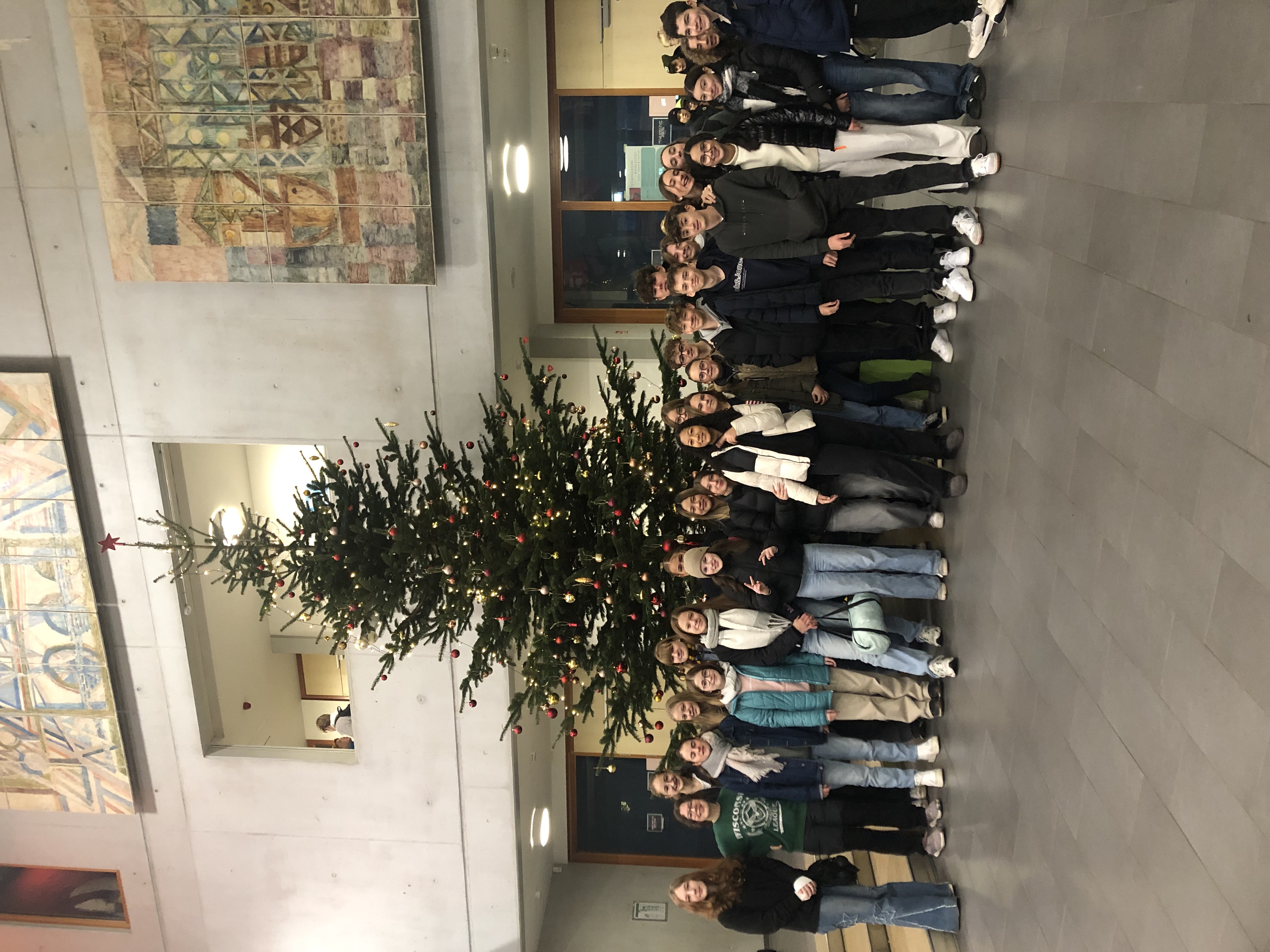 Gruppe von Jugendlichen und jungen Erwachsenen, die vor einem Weihnachtsbaum stehen. Sie lächeln und posieren gemeinsam für das Foto. Im Hintergrund sind weihnachtliche Dekorationen und eine Innenraumumgebung zu erkennen.