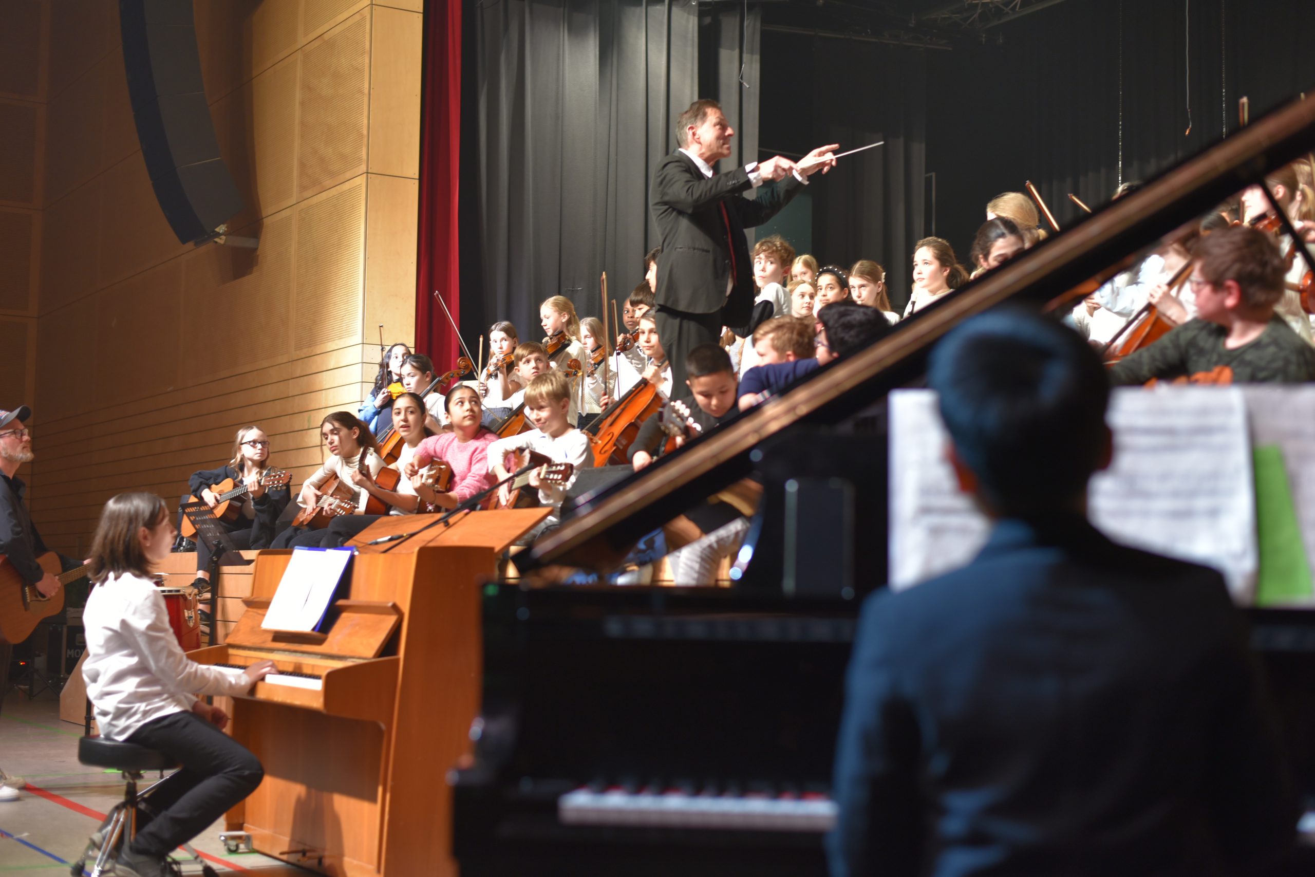 Eine Gruppe von Kindern spielt ein Konzert auf der Bühne. Einige Kinder stehen und spielen Geige, während andere im Sitzen Cello spielen. Die Musiker tragen weiße Hemden und sind konzentriert in ihre Aufführung vertieft. Im Hintergrund ist ein Dirigent zu sehen, der die Musiker anleitet. Zwei Männer in Anzügen stehen auf einer Bühnenfläche, die von blauen Lichtern beleuchtet wird. Im Hintergrund sind Musikinstrumente wie Schlagzeug und Congas sichtbar. Die Atmosphäre wirkt festlich und musikalisch. Sechsköpfige Gesangsgruppe steht auf einer Bühne, während sie in Mikrofone singen. Die Mitglieder tragen unterschiedliche Outfits in Schwarz und Weiß. Im Hintergrund sind Musikinstrumente und Bühnenlichter sichtbar. Eine Gruppe von Jugendlichen steht um ein Klavier. Ein junger Mann spielt konzentriert auf dem Klavier, während andere ihn beobachten. Einige der Anwesenden tragen unterschiedliche Kleidung, darunter ein weißes T-Shirt und eine Kappe. Im Hintergrund sind weitere Personen zu erkennen, die an der Veranstaltung teilnehmen. Die Szene ist in einem leicht gedämpften Licht gehalten. Eine Gruppe von Musikern, darunter Geiger und Cellisten, spielt auf einer Bühne. Ein Dirigent leitet die Aufführung, während ein Pianist am Klavier sitzt. Im Vordergrund sind einige Musikinstrumente sichtbar, darunter Congas. Die Musiker tragen helle Oberteile und sind in einer konzentrierten Haltung während des Spiels. Ein Orchester mit vielen Musikern spielt auf einer Bühne. Ein Dirigent steht vorne und leitet die Aufführung. Im Vordergrund ist eine Pianistin zu sehen, die am Klavier spielt, während ein weiterer Musiker, der ein Instrument hält, im Hintergrund steht. Die Bühne ist beleuchtet, und das Publikum ist nicht sichtbar. Eine Gruppe von jungen Tänzern in pinken und weißen Shirts führt auf einer Bühne eine Tanzperformance auf. Im Hintergrund sind Musikinstrumente wie eine Gitarre und ein Schlagzeug sichtbar. Die Bühne ist beleuchtet, und die Atmosphäre wirkt lebhaft und festlich. Sechs Tänzerinnen und Tänzer in weißen T-Shirts und schwarzen Hosen führen eine Choreografie auf einer Bühne auf, die mit bunten Lichtern beleuchtet ist. Im Hintergrund sind Musikinstrumente wie eine Gitarre und ein Schlagzeug zu sehen. Eine Band führt auf einer Bühne auf. Im Vordergrund stehen zwei Sängerinnen mit Mikrofonen. Eine Sängerin trägt ein schwarzes Oberteil und helle Hose, die andere trägt einen grauen Pullover. Im Hintergrund sind Instrumentalisten zu sehen, darunter ein Gitarrist und ein Keyboarder. Die Bühne ist schwach beleuchtet und es gibt eine musikalische Atmosphäre. Eine Band tritt auf einer Bühne auf, umgeben von blauen Lichtern und Nebel. Ein Sänger mit Mikrofon steht in der Mitte, während ein Gitarrist links und weitere Musiker im Hintergrund spielen. Die Atmosphäre ist lebhaft und musikalisch. Eine Gruppe von Schülerinnen und Schülern steht auf einer Bühne und singt. Sie tragen überwiegend weiße Kleidung und stehen in mehreren Reihen. Im Vordergrund ist ein Pianist zu sehen, der am Klavier spielt. Ein Lehrer oder Dirigent steht vor der Gruppe und leitet sie an. Der Hintergrund ist dunkel mit blauen Lichtern. Eine Gruppe von Schülerinnen und Schülern steht auf einer Bühne. Sie tragen überwiegend weiße Kleidung und lächeln. Im Hintergrund sind musikalische Instrumente zu sehen. Die Bühne ist in blaues Licht getaucht, was eine festliche Atmosphäre schafft. Eine Gruppe von Kindern steht auf einer Bühne, gekleidet in hellen Oberteilen. Sie schauen aufmerksam nach vorne, während im Hintergrund Lichtstrahlen sichtbar sind. Eine junge Frau steht auf einer Bühne und hält ein Mikrofon in der Hand. Sie trägt ein schwarzes Kleid und eine schwarze Lederjacke. Im Hintergrund sind verschiedene Musikinstrumente, darunter Gitarren und ein Schlagzeug, zu sehen. Die Bühne ist in blaues Licht getaucht, was eine lebendige Atmosphäre schafft. Eine Gruppe von Kindern und Jugendlichen steht auf einer Bühne in einem Veranstaltungsraum. Sie tragen überwiegend weiße und bunte Kleidung und stehen in mehreren Reihen. Im Hintergrund sind Musikinstrumente und eine Bühne mit blauen Lichtern sichtbar. Ein Erwachsener spricht zu ihnen. Eine Gruppe von Personen steht auf einer Bühne, die mit Lichtern dekoriert ist. Im Hintergrund sind Musikinstrumente sichtbar. Die Personen sind in formeller Kleidung und scheinen an einer Veranstaltung oder Aufführung teilzunehmen.