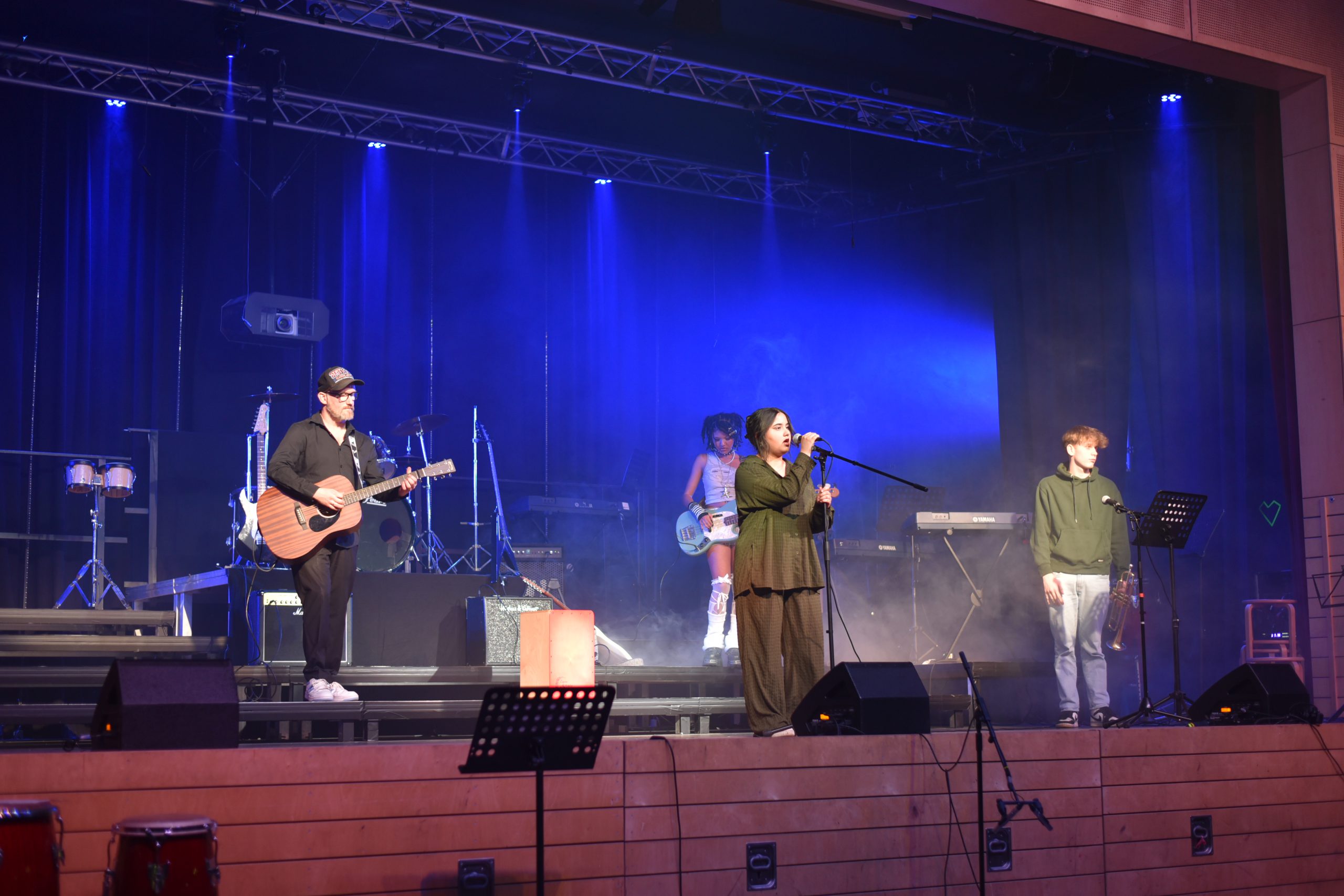Eine Gruppe von Kindern spielt ein Konzert auf der Bühne. Einige Kinder stehen und spielen Geige, während andere im Sitzen Cello spielen. Die Musiker tragen weiße Hemden und sind konzentriert in ihre Aufführung vertieft. Im Hintergrund ist ein Dirigent zu sehen, der die Musiker anleitet. Zwei Männer in Anzügen stehen auf einer Bühnenfläche, die von blauen Lichtern beleuchtet wird. Im Hintergrund sind Musikinstrumente wie Schlagzeug und Congas sichtbar. Die Atmosphäre wirkt festlich und musikalisch. Sechsköpfige Gesangsgruppe steht auf einer Bühne, während sie in Mikrofone singen. Die Mitglieder tragen unterschiedliche Outfits in Schwarz und Weiß. Im Hintergrund sind Musikinstrumente und Bühnenlichter sichtbar. Eine Gruppe von Jugendlichen steht um ein Klavier. Ein junger Mann spielt konzentriert auf dem Klavier, während andere ihn beobachten. Einige der Anwesenden tragen unterschiedliche Kleidung, darunter ein weißes T-Shirt und eine Kappe. Im Hintergrund sind weitere Personen zu erkennen, die an der Veranstaltung teilnehmen. Die Szene ist in einem leicht gedämpften Licht gehalten. Eine Gruppe von Musikern, darunter Geiger und Cellisten, spielt auf einer Bühne. Ein Dirigent leitet die Aufführung, während ein Pianist am Klavier sitzt. Im Vordergrund sind einige Musikinstrumente sichtbar, darunter Congas. Die Musiker tragen helle Oberteile und sind in einer konzentrierten Haltung während des Spiels. Ein Orchester mit vielen Musikern spielt auf einer Bühne. Ein Dirigent steht vorne und leitet die Aufführung. Im Vordergrund ist eine Pianistin zu sehen, die am Klavier spielt, während ein weiterer Musiker, der ein Instrument hält, im Hintergrund steht. Die Bühne ist beleuchtet, und das Publikum ist nicht sichtbar. Eine Gruppe von jungen Tänzern in pinken und weißen Shirts führt auf einer Bühne eine Tanzperformance auf. Im Hintergrund sind Musikinstrumente wie eine Gitarre und ein Schlagzeug sichtbar. Die Bühne ist beleuchtet, und die Atmosphäre wirkt lebhaft und festlich. Sechs Tänzerinnen und Tänzer in weißen T-Shirts und schwarzen Hosen führen eine Choreografie auf einer Bühne auf, die mit bunten Lichtern beleuchtet ist. Im Hintergrund sind Musikinstrumente wie eine Gitarre und ein Schlagzeug zu sehen. Eine Band führt auf einer Bühne auf. Im Vordergrund stehen zwei Sängerinnen mit Mikrofonen. Eine Sängerin trägt ein schwarzes Oberteil und helle Hose, die andere trägt einen grauen Pullover. Im Hintergrund sind Instrumentalisten zu sehen, darunter ein Gitarrist und ein Keyboarder. Die Bühne ist schwach beleuchtet und es gibt eine musikalische Atmosphäre. Eine Band tritt auf einer Bühne auf, umgeben von blauen Lichtern und Nebel. Ein Sänger mit Mikrofon steht in der Mitte, während ein Gitarrist links und weitere Musiker im Hintergrund spielen. Die Atmosphäre ist lebhaft und musikalisch. Eine Gruppe von Schülerinnen und Schülern steht auf einer Bühne und singt. Sie tragen überwiegend weiße Kleidung und stehen in mehreren Reihen. Im Vordergrund ist ein Pianist zu sehen, der am Klavier spielt. Ein Lehrer oder Dirigent steht vor der Gruppe und leitet sie an. Der Hintergrund ist dunkel mit blauen Lichtern. Eine Gruppe von Schülerinnen und Schülern steht auf einer Bühne. Sie tragen überwiegend weiße Kleidung und lächeln. Im Hintergrund sind musikalische Instrumente zu sehen. Die Bühne ist in blaues Licht getaucht, was eine festliche Atmosphäre schafft. Eine Gruppe von Kindern steht auf einer Bühne, gekleidet in hellen Oberteilen. Sie schauen aufmerksam nach vorne, während im Hintergrund Lichtstrahlen sichtbar sind. Eine junge Frau steht auf einer Bühne und hält ein Mikrofon in der Hand. Sie trägt ein schwarzes Kleid und eine schwarze Lederjacke. Im Hintergrund sind verschiedene Musikinstrumente, darunter Gitarren und ein Schlagzeug, zu sehen. Die Bühne ist in blaues Licht getaucht, was eine lebendige Atmosphäre schafft. Eine Gruppe von Kindern und Jugendlichen steht auf einer Bühne in einem Veranstaltungsraum. Sie tragen überwiegend weiße und bunte Kleidung und stehen in mehreren Reihen. Im Hintergrund sind Musikinstrumente und eine Bühne mit blauen Lichtern sichtbar. Ein Erwachsener spricht zu ihnen. Eine Gruppe von Personen steht auf einer Bühne, die mit Lichtern dekoriert ist. Im Hintergrund sind Musikinstrumente sichtbar. Die Personen sind in formeller Kleidung und scheinen an einer Veranstaltung oder Aufführung teilzunehmen.