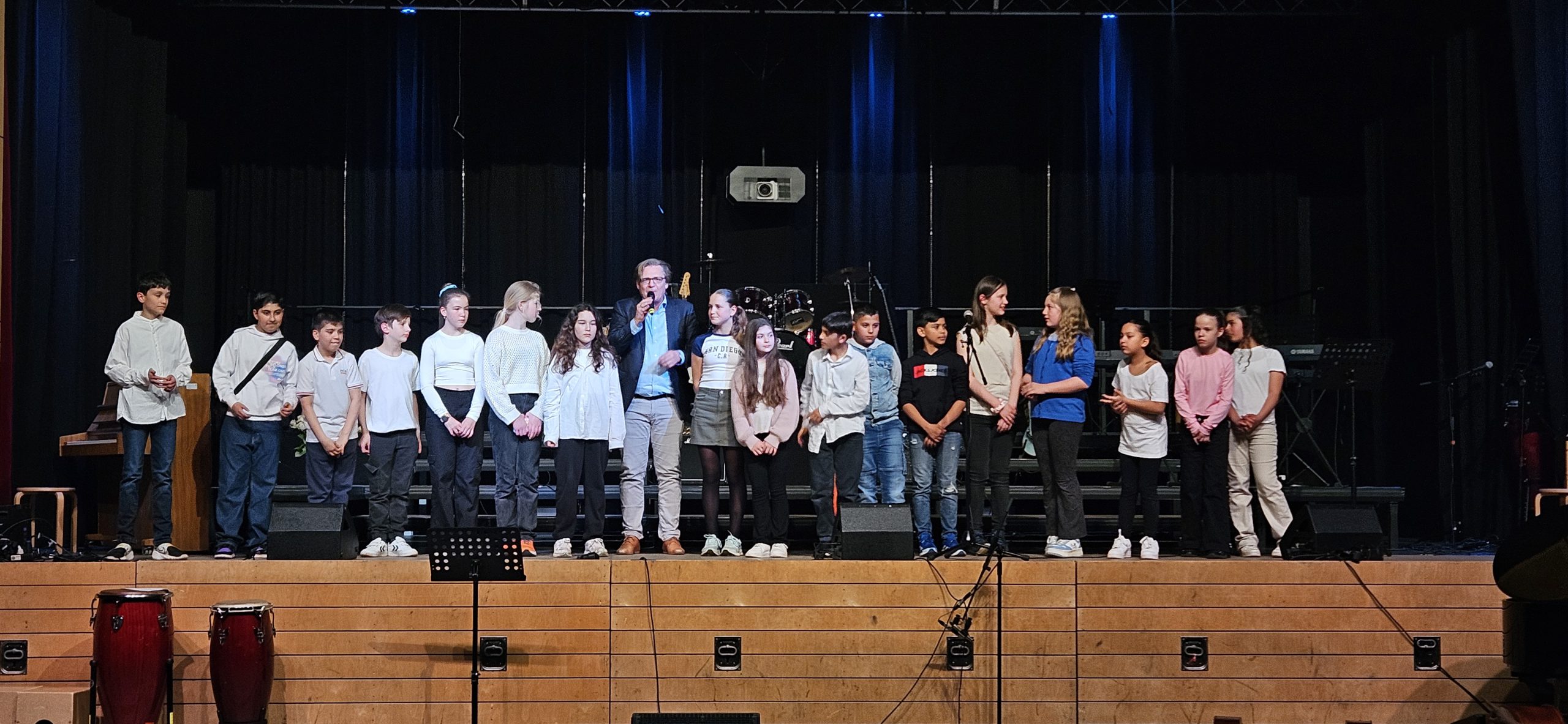 Frühlingskonzert am GyRa! Das war der Tag, an dem die Eltern ihre Kinder auf der Bühne erleben konnten, während diese ihre Instrumente und Stimmen erklingen ließen. Am Anfang waren wir sehr nervös, aber als wir erst einmal auf der Bühne standen, verschwand die Aufregung und wir hatten Spaß! Auf unseren Geigen spielten wir gemeinsam mit den Flöten und dem Ensemble: „Swing Along“, „Foggy Dew“ und „Eine kleine Nachtmusik“. Das Schönste war, dass wir auch andere Stücke von den Chören und Bands hören konnten. Besonders gut war die Tanz-AG! Es war ein fröhlicher Abend mit viel Musik!
