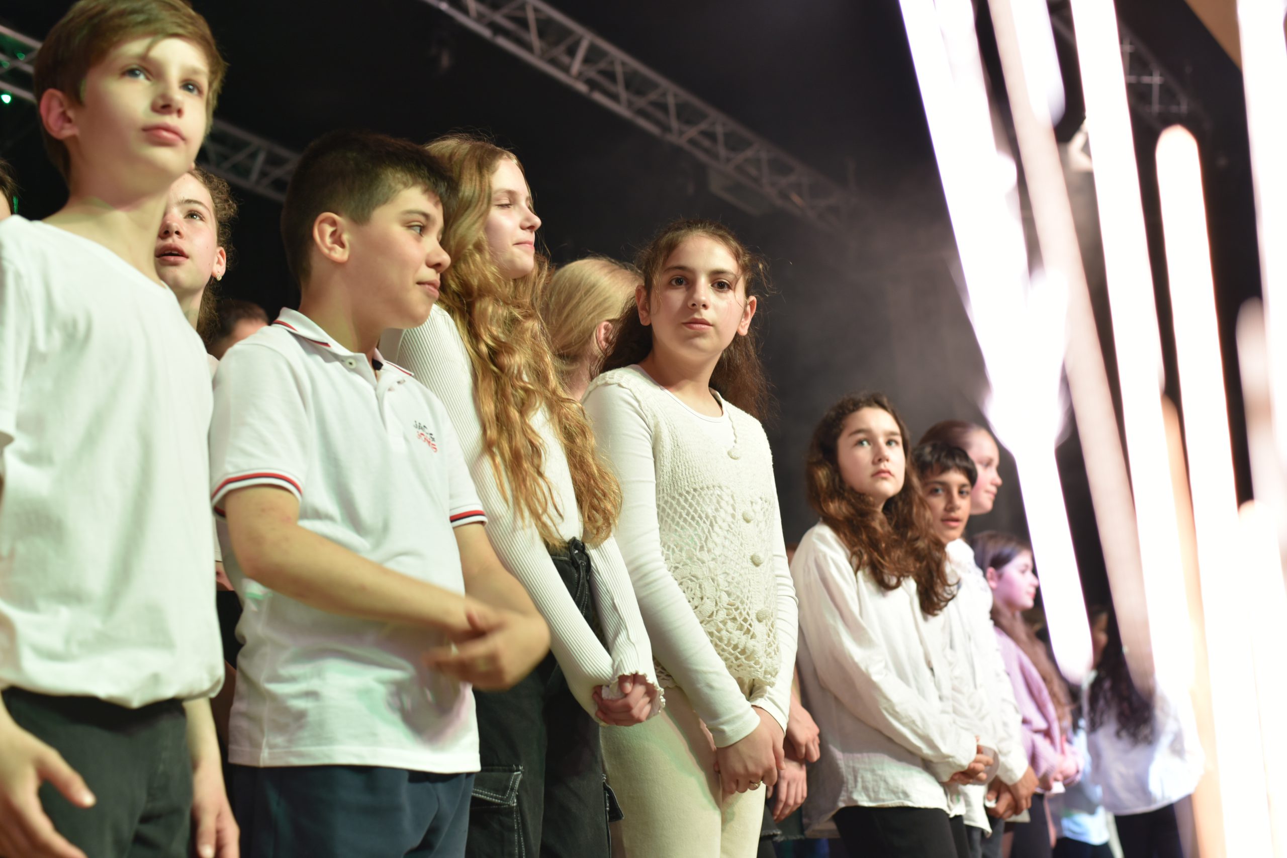 Eine Gruppe von Kindern und Jugendlichen steht auf einer Bühne in einem Veranstaltungsraum. Sie tragen überwiegend weiße und bunte Kleidung und stehen in mehreren Reihen. Im Hintergrund sind Musikinstrumente und eine Bühne mit blauen Lichtern sichtbar. Ein Erwachsener spricht zu ihnen.