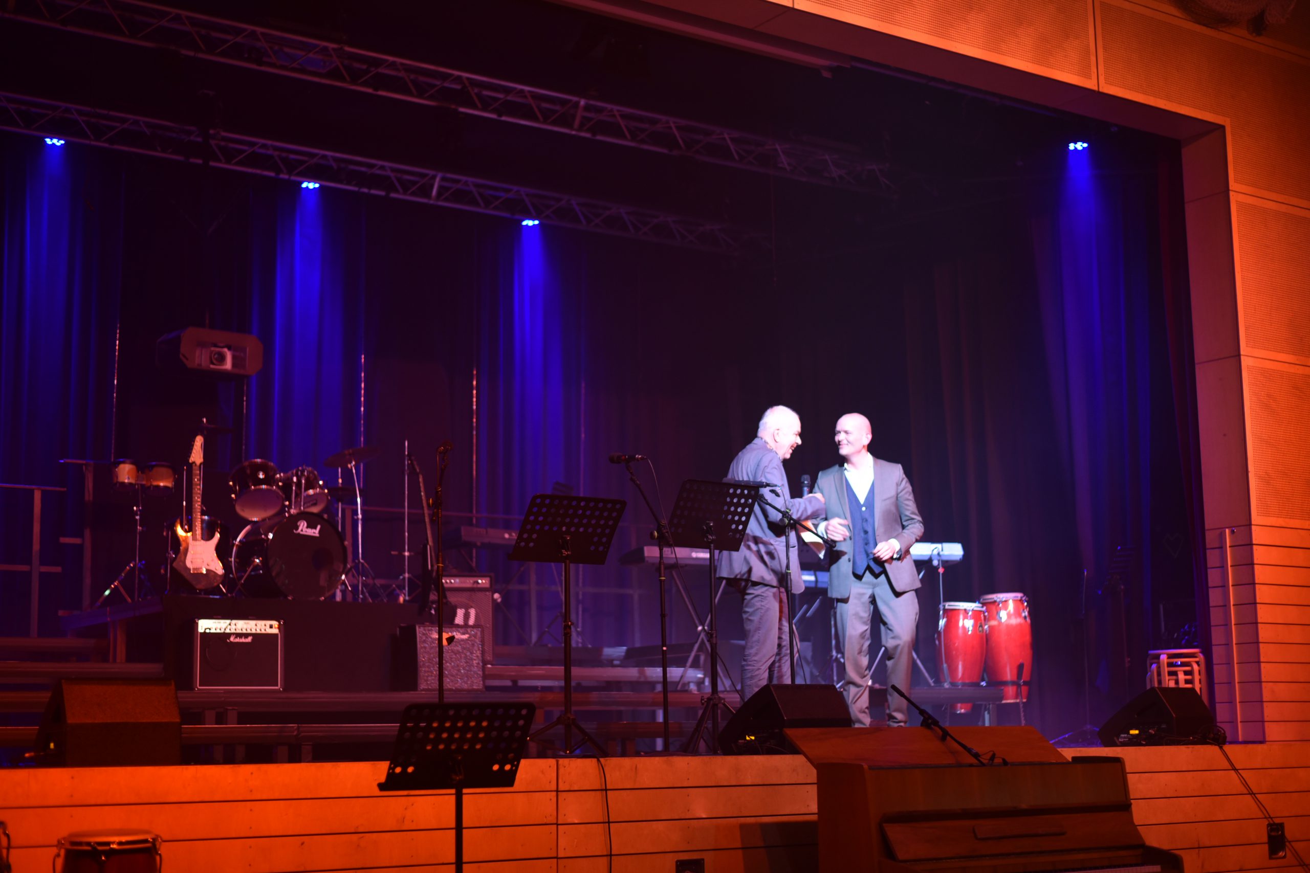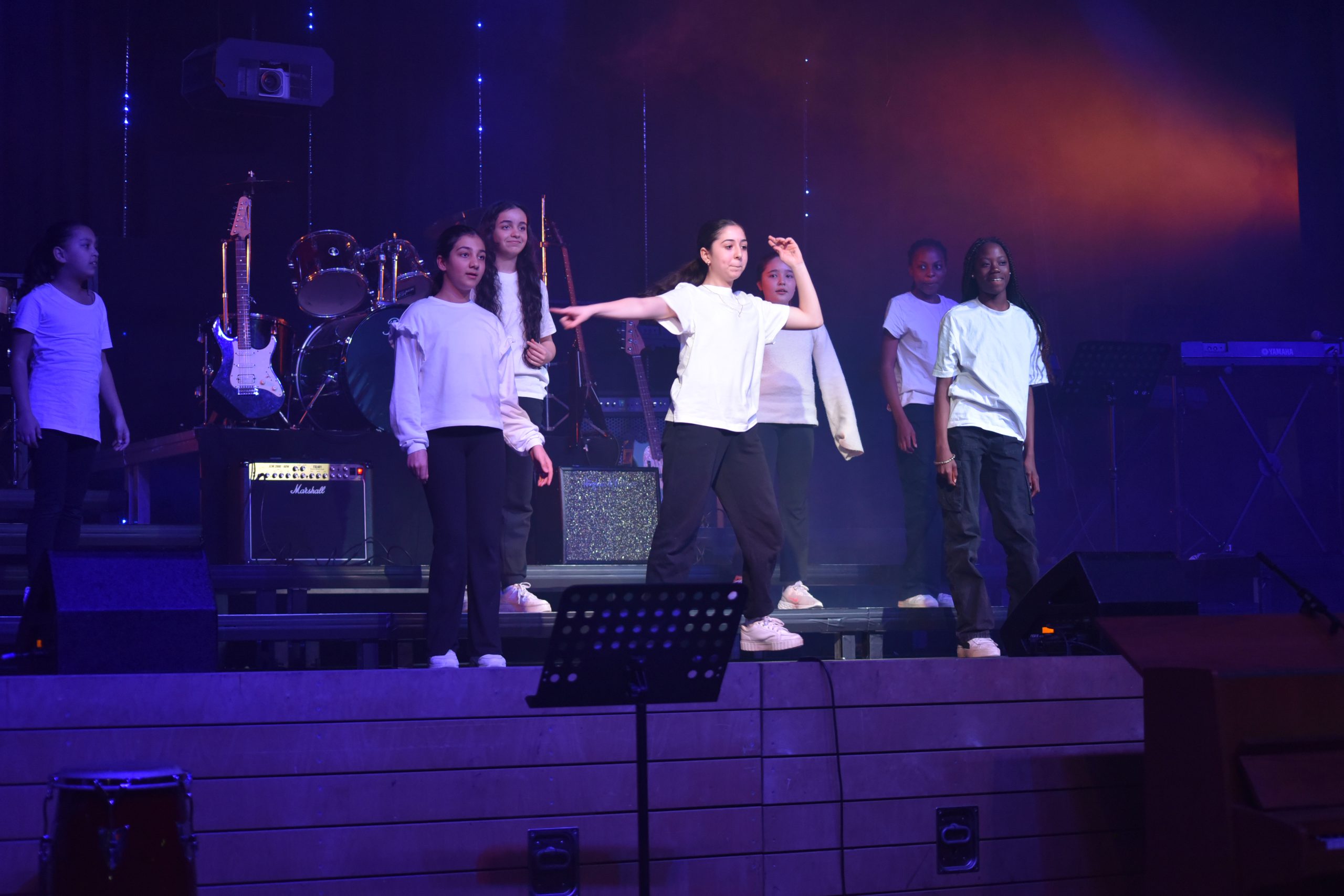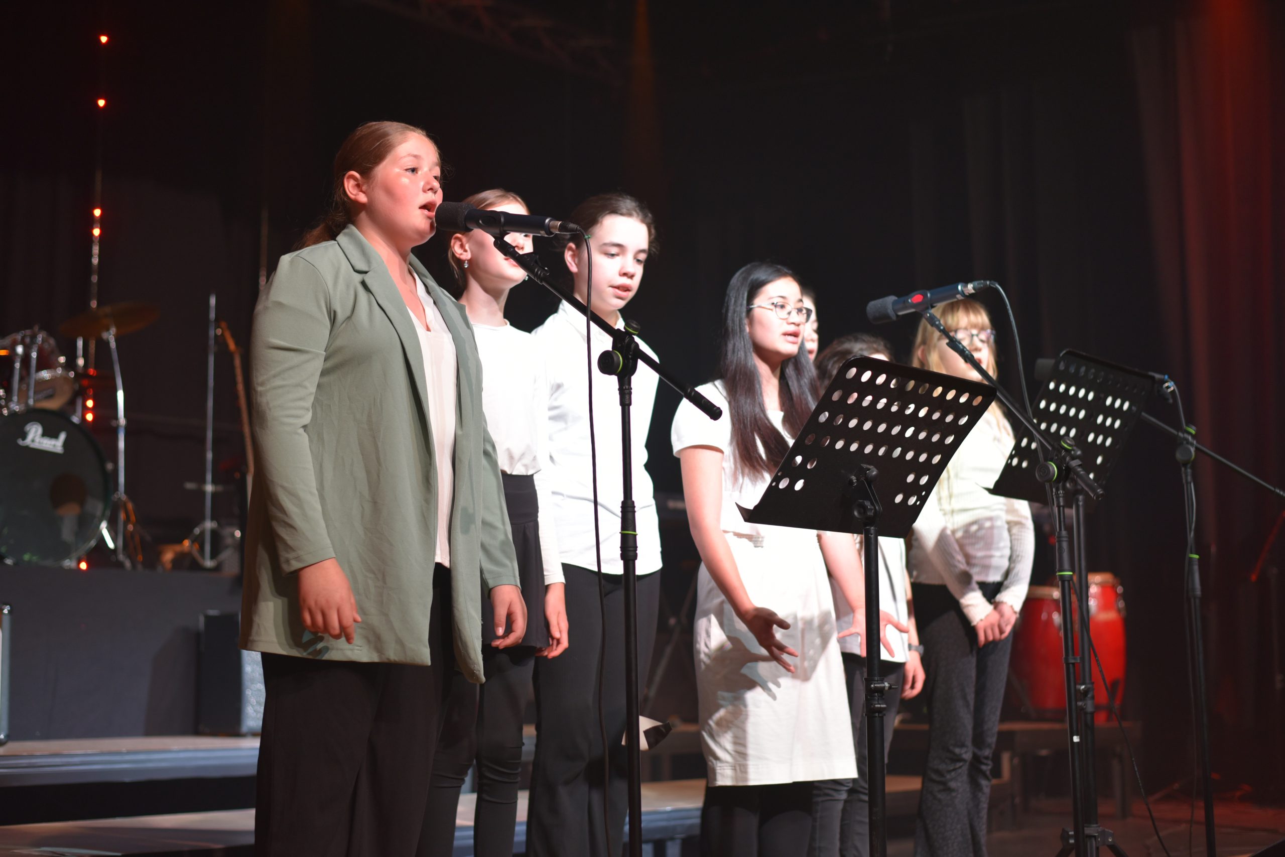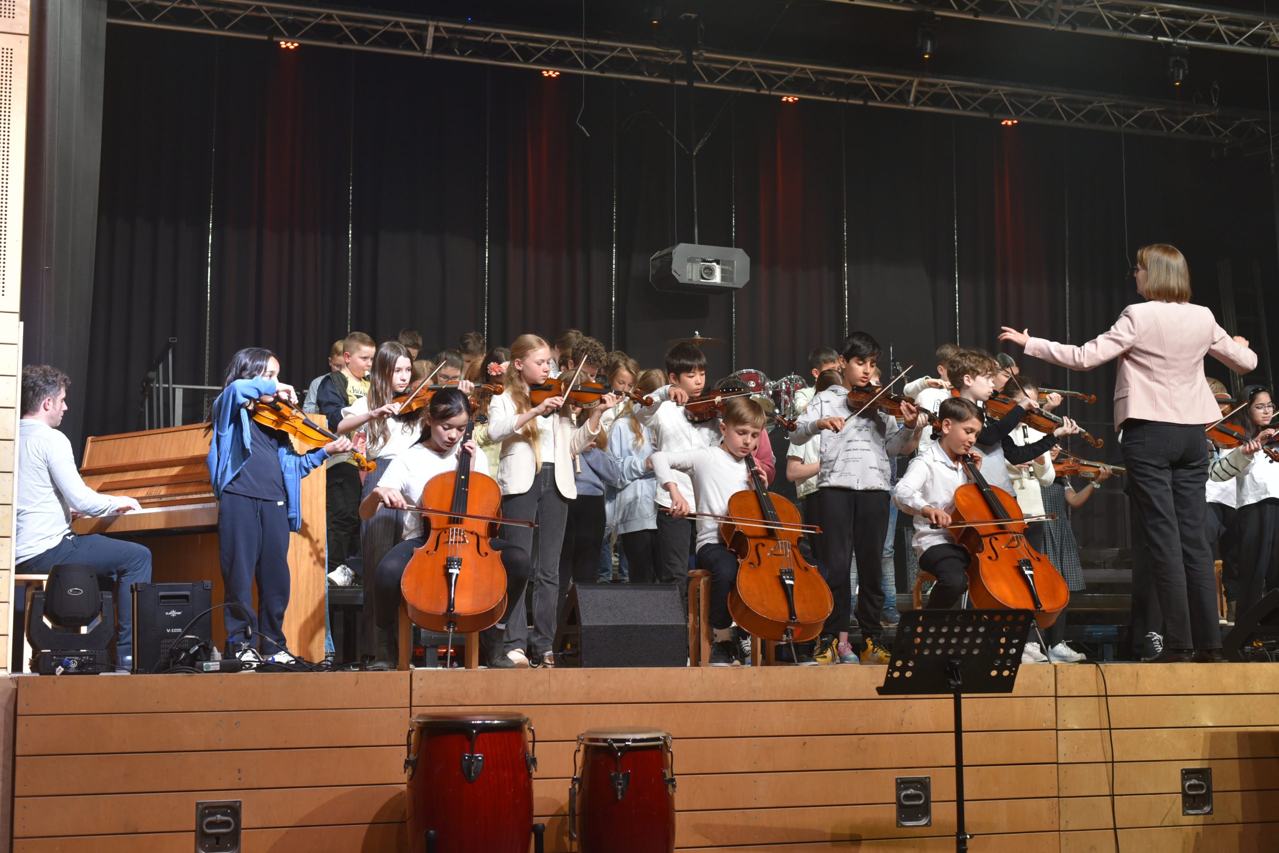 Eine Gruppe von Kindern spielt ein Konzert auf der Bühne. Einige Kinder stehen und spielen Geige, während andere im Sitzen Cello spielen. Die Musiker tragen weiße Hemden und sind konzentriert in ihre Aufführung vertieft. Im Hintergrund ist ein Dirigent zu sehen, der die Musiker anleitet. Zwei Männer in Anzügen stehen auf einer Bühnenfläche, die von blauen Lichtern beleuchtet wird. Im Hintergrund sind Musikinstrumente wie Schlagzeug und Congas sichtbar. Die Atmosphäre wirkt festlich und musikalisch. Sechsköpfige Gesangsgruppe steht auf einer Bühne, während sie in Mikrofone singen. Die Mitglieder tragen unterschiedliche Outfits in Schwarz und Weiß. Im Hintergrund sind Musikinstrumente und Bühnenlichter sichtbar. Eine Gruppe von Jugendlichen steht um ein Klavier. Ein junger Mann spielt konzentriert auf dem Klavier, während andere ihn beobachten. Einige der Anwesenden tragen unterschiedliche Kleidung, darunter ein weißes T-Shirt und eine Kappe. Im Hintergrund sind weitere Personen zu erkennen, die an der Veranstaltung teilnehmen. Die Szene ist in einem leicht gedämpften Licht gehalten. Eine Gruppe von Musikern, darunter Geiger und Cellisten, spielt auf einer Bühne. Ein Dirigent leitet die Aufführung, während ein Pianist am Klavier sitzt. Im Vordergrund sind einige Musikinstrumente sichtbar, darunter Congas. Die Musiker tragen helle Oberteile und sind in einer konzentrierten Haltung während des Spiels. Ein Orchester mit vielen Musikern spielt auf einer Bühne. Ein Dirigent steht vorne und leitet die Aufführung. Im Vordergrund ist eine Pianistin zu sehen, die am Klavier spielt, während ein weiterer Musiker, der ein Instrument hält, im Hintergrund steht. Die Bühne ist beleuchtet, und das Publikum ist nicht sichtbar. Eine Gruppe von jungen Tänzern in pinken und weißen Shirts führt auf einer Bühne eine Tanzperformance auf. Im Hintergrund sind Musikinstrumente wie eine Gitarre und ein Schlagzeug sichtbar. Die Bühne ist beleuchtet, und die Atmosphäre wirkt lebhaft und festlich. Sechs Tänzerinnen und Tänzer in weißen T-Shirts und schwarzen Hosen führen eine Choreografie auf einer Bühne auf, die mit bunten Lichtern beleuchtet ist. Im Hintergrund sind Musikinstrumente wie eine Gitarre und ein Schlagzeug zu sehen. Eine Band führt auf einer Bühne auf. Im Vordergrund stehen zwei Sängerinnen mit Mikrofonen. Eine Sängerin trägt ein schwarzes Oberteil und helle Hose, die andere trägt einen grauen Pullover. Im Hintergrund sind Instrumentalisten zu sehen, darunter ein Gitarrist und ein Keyboarder. Die Bühne ist schwach beleuchtet und es gibt eine musikalische Atmosphäre. Eine Band tritt auf einer Bühne auf, umgeben von blauen Lichtern und Nebel. Ein Sänger mit Mikrofon steht in der Mitte, während ein Gitarrist links und weitere Musiker im Hintergrund spielen. Die Atmosphäre ist lebhaft und musikalisch. Eine Gruppe von Schülerinnen und Schülern steht auf einer Bühne und singt. Sie tragen überwiegend weiße Kleidung und stehen in mehreren Reihen. Im Vordergrund ist ein Pianist zu sehen, der am Klavier spielt. Ein Lehrer oder Dirigent steht vor der Gruppe und leitet sie an. Der Hintergrund ist dunkel mit blauen Lichtern. Eine Gruppe von Schülerinnen und Schülern steht auf einer Bühne. Sie tragen überwiegend weiße Kleidung und lächeln. Im Hintergrund sind musikalische Instrumente zu sehen. Die Bühne ist in blaues Licht getaucht, was eine festliche Atmosphäre schafft. Eine Gruppe von Kindern steht auf einer Bühne, gekleidet in hellen Oberteilen. Sie schauen aufmerksam nach vorne, während im Hintergrund Lichtstrahlen sichtbar sind. Eine junge Frau steht auf einer Bühne und hält ein Mikrofon in der Hand. Sie trägt ein schwarzes Kleid und eine schwarze Lederjacke. Im Hintergrund sind verschiedene Musikinstrumente, darunter Gitarren und ein Schlagzeug, zu sehen. Die Bühne ist in blaues Licht getaucht, was eine lebendige Atmosphäre schafft. Eine Gruppe von Kindern und Jugendlichen steht auf einer Bühne in einem Veranstaltungsraum. Sie tragen überwiegend weiße und bunte Kleidung und stehen in mehreren Reihen. Im Hintergrund sind Musikinstrumente und eine Bühne mit blauen Lichtern sichtbar. Ein Erwachsener spricht zu ihnen. Eine Gruppe von Personen steht auf einer Bühne, die mit Lichtern dekoriert ist. Im Hintergrund sind Musikinstrumente sichtbar. Die Personen sind in formeller Kleidung und scheinen an einer Veranstaltung oder Aufführung teilzunehmen.