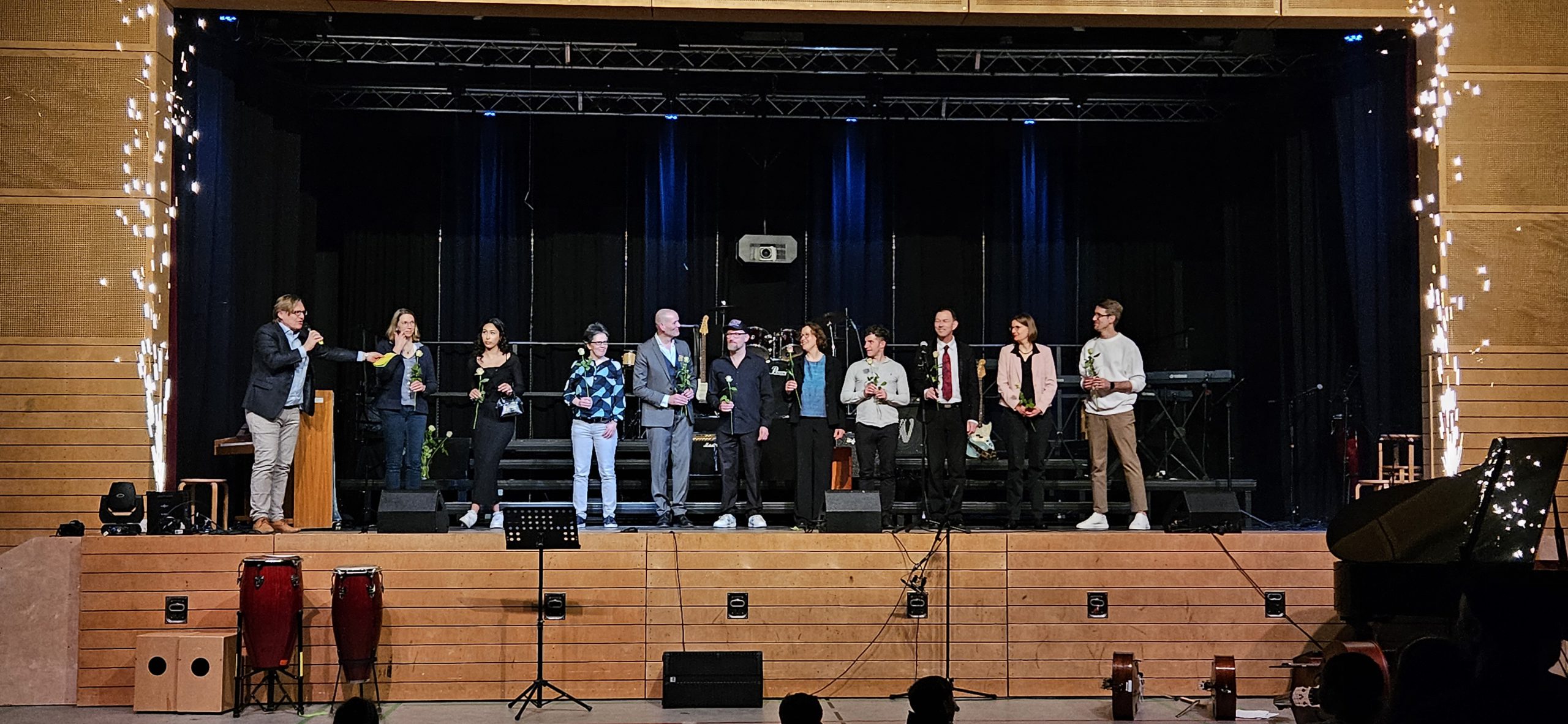 Eine Gruppe von Kindern spielt ein Konzert auf der Bühne. Einige Kinder stehen und spielen Geige, während andere im Sitzen Cello spielen. Die Musiker tragen weiße Hemden und sind konzentriert in ihre Aufführung vertieft. Im Hintergrund ist ein Dirigent zu sehen, der die Musiker anleitet. Zwei Männer in Anzügen stehen auf einer Bühnenfläche, die von blauen Lichtern beleuchtet wird. Im Hintergrund sind Musikinstrumente wie Schlagzeug und Congas sichtbar. Die Atmosphäre wirkt festlich und musikalisch. Sechsköpfige Gesangsgruppe steht auf einer Bühne, während sie in Mikrofone singen. Die Mitglieder tragen unterschiedliche Outfits in Schwarz und Weiß. Im Hintergrund sind Musikinstrumente und Bühnenlichter sichtbar. Eine Gruppe von Jugendlichen steht um ein Klavier. Ein junger Mann spielt konzentriert auf dem Klavier, während andere ihn beobachten. Einige der Anwesenden tragen unterschiedliche Kleidung, darunter ein weißes T-Shirt und eine Kappe. Im Hintergrund sind weitere Personen zu erkennen, die an der Veranstaltung teilnehmen. Die Szene ist in einem leicht gedämpften Licht gehalten. Eine Gruppe von Musikern, darunter Geiger und Cellisten, spielt auf einer Bühne. Ein Dirigent leitet die Aufführung, während ein Pianist am Klavier sitzt. Im Vordergrund sind einige Musikinstrumente sichtbar, darunter Congas. Die Musiker tragen helle Oberteile und sind in einer konzentrierten Haltung während des Spiels. Ein Orchester mit vielen Musikern spielt auf einer Bühne. Ein Dirigent steht vorne und leitet die Aufführung. Im Vordergrund ist eine Pianistin zu sehen, die am Klavier spielt, während ein weiterer Musiker, der ein Instrument hält, im Hintergrund steht. Die Bühne ist beleuchtet, und das Publikum ist nicht sichtbar. Eine Gruppe von jungen Tänzern in pinken und weißen Shirts führt auf einer Bühne eine Tanzperformance auf. Im Hintergrund sind Musikinstrumente wie eine Gitarre und ein Schlagzeug sichtbar. Die Bühne ist beleuchtet, und die Atmosphäre wirkt lebhaft und festlich. Sechs Tänzerinnen und Tänzer in weißen T-Shirts und schwarzen Hosen führen eine Choreografie auf einer Bühne auf, die mit bunten Lichtern beleuchtet ist. Im Hintergrund sind Musikinstrumente wie eine Gitarre und ein Schlagzeug zu sehen. Eine Band führt auf einer Bühne auf. Im Vordergrund stehen zwei Sängerinnen mit Mikrofonen. Eine Sängerin trägt ein schwarzes Oberteil und helle Hose, die andere trägt einen grauen Pullover. Im Hintergrund sind Instrumentalisten zu sehen, darunter ein Gitarrist und ein Keyboarder. Die Bühne ist schwach beleuchtet und es gibt eine musikalische Atmosphäre. Eine Band tritt auf einer Bühne auf, umgeben von blauen Lichtern und Nebel. Ein Sänger mit Mikrofon steht in der Mitte, während ein Gitarrist links und weitere Musiker im Hintergrund spielen. Die Atmosphäre ist lebhaft und musikalisch. Eine Gruppe von Schülerinnen und Schülern steht auf einer Bühne und singt. Sie tragen überwiegend weiße Kleidung und stehen in mehreren Reihen. Im Vordergrund ist ein Pianist zu sehen, der am Klavier spielt. Ein Lehrer oder Dirigent steht vor der Gruppe und leitet sie an. Der Hintergrund ist dunkel mit blauen Lichtern. Eine Gruppe von Schülerinnen und Schülern steht auf einer Bühne. Sie tragen überwiegend weiße Kleidung und lächeln. Im Hintergrund sind musikalische Instrumente zu sehen. Die Bühne ist in blaues Licht getaucht, was eine festliche Atmosphäre schafft. Eine Gruppe von Kindern steht auf einer Bühne, gekleidet in hellen Oberteilen. Sie schauen aufmerksam nach vorne, während im Hintergrund Lichtstrahlen sichtbar sind. Eine junge Frau steht auf einer Bühne und hält ein Mikrofon in der Hand. Sie trägt ein schwarzes Kleid und eine schwarze Lederjacke. Im Hintergrund sind verschiedene Musikinstrumente, darunter Gitarren und ein Schlagzeug, zu sehen. Die Bühne ist in blaues Licht getaucht, was eine lebendige Atmosphäre schafft. Eine Gruppe von Kindern und Jugendlichen steht auf einer Bühne in einem Veranstaltungsraum. Sie tragen überwiegend weiße und bunte Kleidung und stehen in mehreren Reihen. Im Hintergrund sind Musikinstrumente und eine Bühne mit blauen Lichtern sichtbar. Ein Erwachsener spricht zu ihnen. Eine Gruppe von Personen steht auf einer Bühne, die mit Lichtern dekoriert ist. Im Hintergrund sind Musikinstrumente sichtbar. Die Personen sind in formeller Kleidung und scheinen an einer Veranstaltung oder Aufführung teilzunehmen.