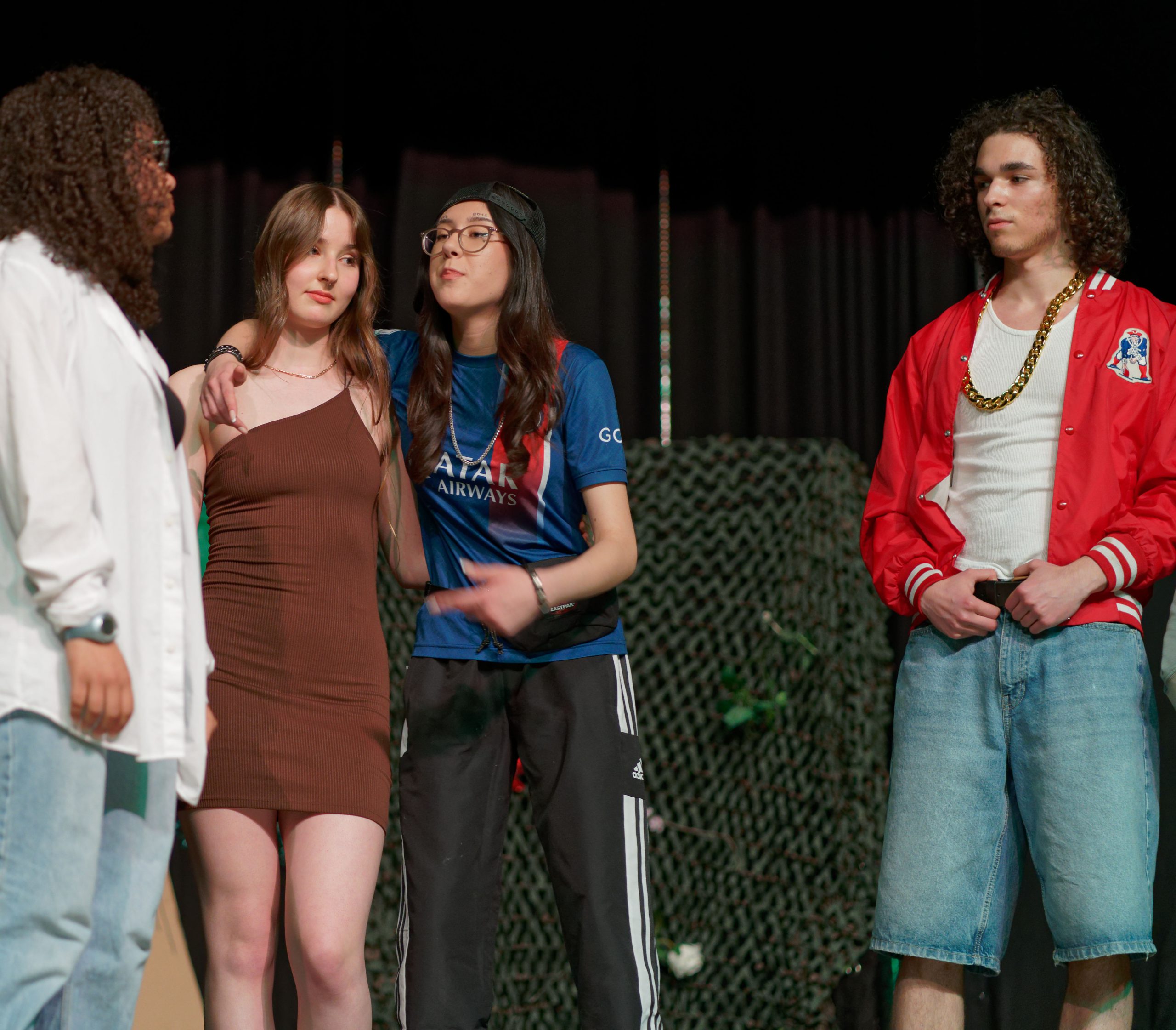 Eine Gruppe von fünf Personen steht auf einer Bühne. Sie tragen unterschiedliche Kostüme: eine Person in blauer Uniform, eine in einem braunen Kleid, eine mit langen Haaren und auffälligem Schmuck, eine in einem roten Sweatshirt und eine in einem grünen Hoodie. Die Szene vermittelt eine theatrale Atmosphäre.