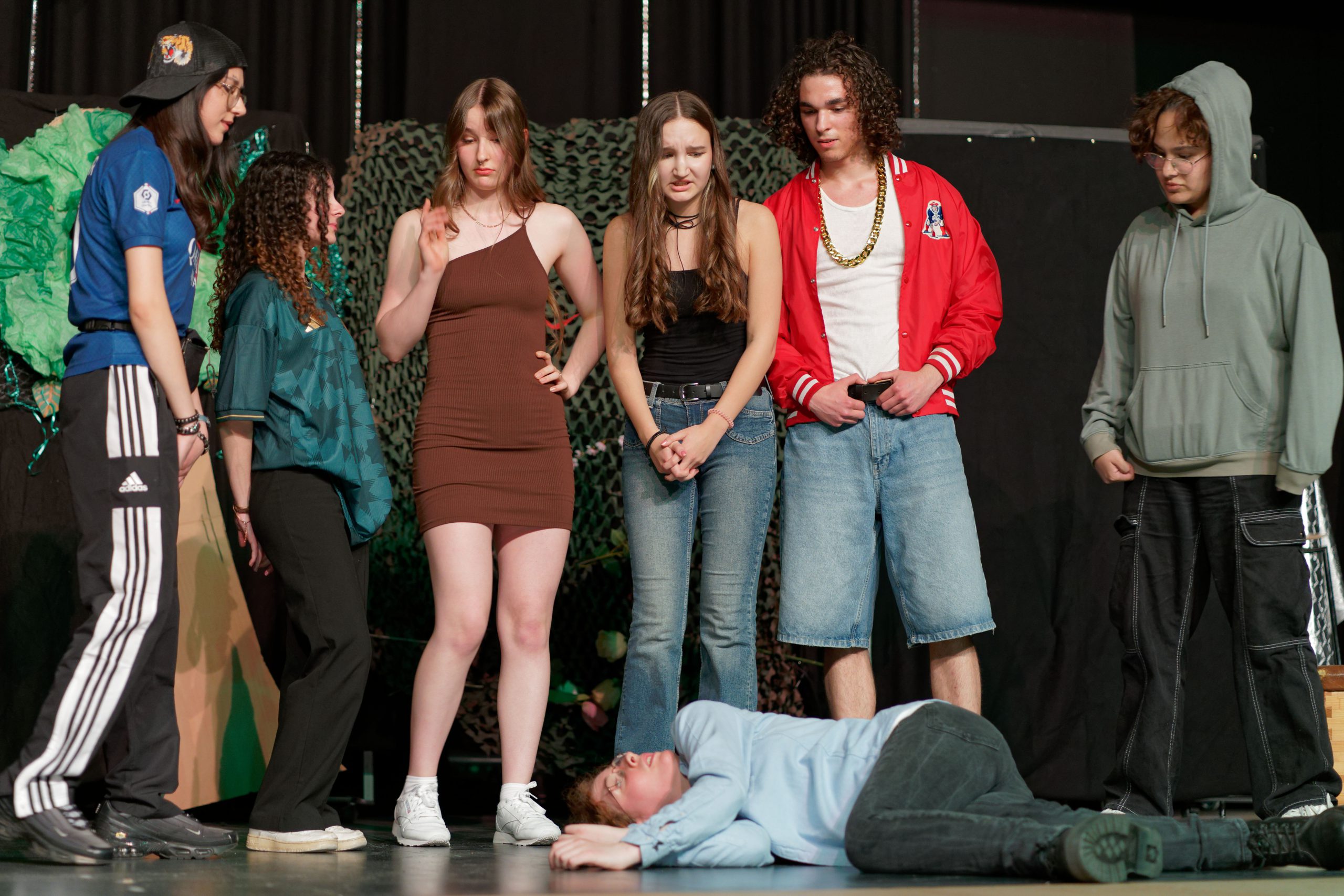Vier Jugendliche in verschiedenen Outfits stehen auf einer Bühne. Eine Person in einem grauen Hoodie zeigt eine überraschte Reaktion, während eine andere in einem weißen Laborkittel und mit Brille verwirrt aussieht. Die dritte Person in einem roten Sweatshirt scheint eine interaktive Szene zu leiten, während die vierte Person mit langen Haaren und einem schwarzen Oberteil aufmerksam zuschaut. Der Hintergrund ist dunkel, was die Bühne hervorhebt. Vier junge Menschen stehen auf einer Bühne in einem Theater. Zwei von ihnen tragen sportliche Kleidung, während die anderen lässige Outfits anhaben. Die Gruppe scheint in ein Gespräch vertieft zu sein, und die Atmosphäre wirkt freundlich und lebhaft. Im Hintergrund sind einfache Bühnenrequisiten zu sehen. Eine dramatische Szene auf der Bühne, in der eine Person in grauer Kleidung mit einer Waffe auf eine andere Person zeigt, die am Boden liegt. Eine dritte Person kniet neben der am Boden liegenden Person und scheint zu helfen oder Unterstützung zu leisten. Der Hintergrund ist dunkel und mit Vorhängen gestaltet, was die Bühne hervorhebt. Zwei Personen sitzen auf einer Bühne vor einem roten Vorhang. Die erste Person hat lockige Haare und trägt eine schwarze Bluse mit einer hellen Jacke, während die zweite Person lange, lockige Haare hat und ein helles Shirt mit einer blauen Jacke trägt. Beide scheinen in nachdenklicher Pose zu sein. Zwei Personen auf einer Bühne in einem Theaterstück. Eine Person sitzt in einem Rollstuhl und hält ein Mikrofon, während die andere Person, die einen weißen Kittel trägt, interessiert zuhört. Im Hintergrund ist ein rotes Kreuz auf einer grauen Wand sichtbar.