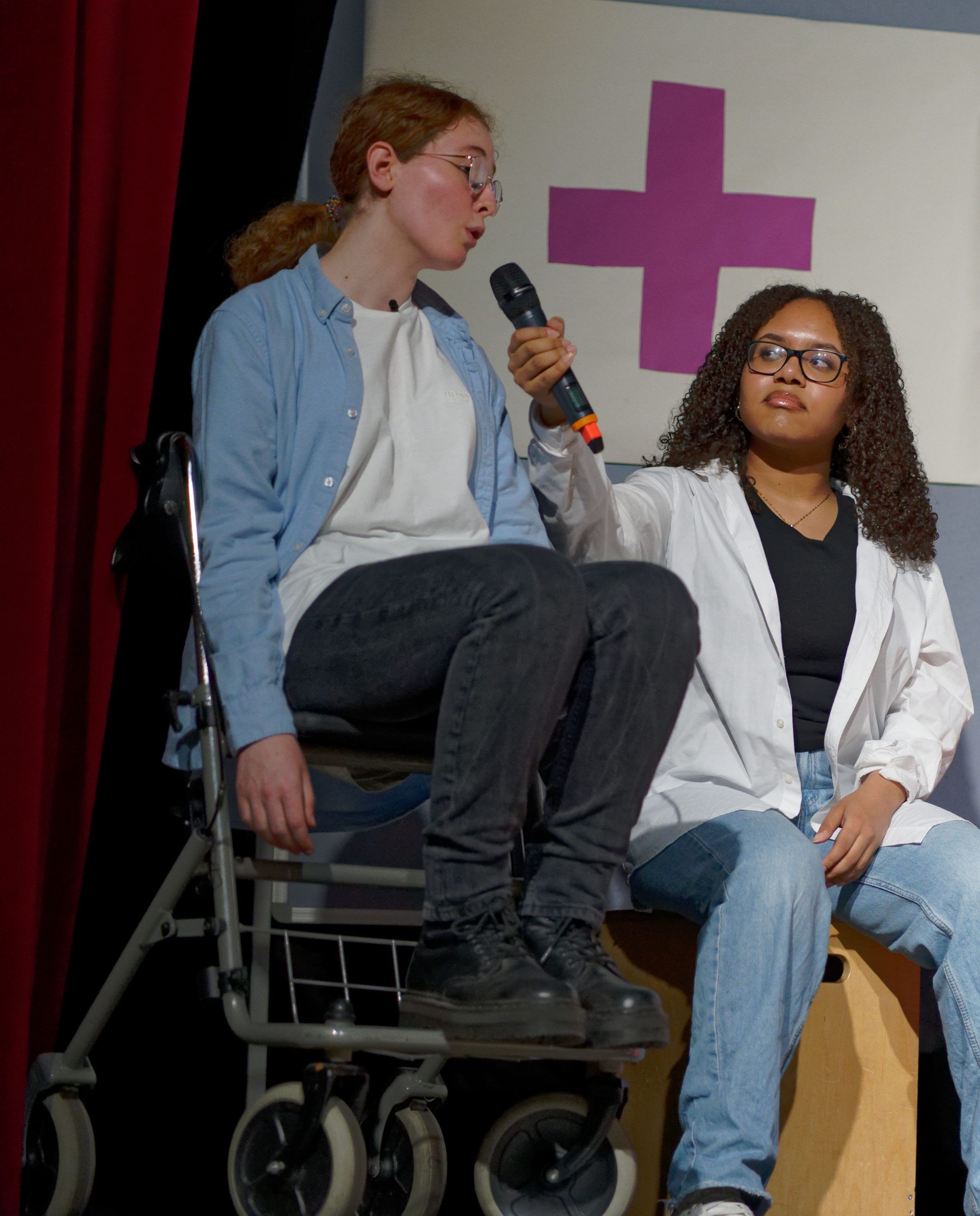 Vier Jugendliche in verschiedenen Outfits stehen auf einer Bühne. Eine Person in einem grauen Hoodie zeigt eine überraschte Reaktion, während eine andere in einem weißen Laborkittel und mit Brille verwirrt aussieht. Die dritte Person in einem roten Sweatshirt scheint eine interaktive Szene zu leiten, während die vierte Person mit langen Haaren und einem schwarzen Oberteil aufmerksam zuschaut. Der Hintergrund ist dunkel, was die Bühne hervorhebt. Vier junge Menschen stehen auf einer Bühne in einem Theater. Zwei von ihnen tragen sportliche Kleidung, während die anderen lässige Outfits anhaben. Die Gruppe scheint in ein Gespräch vertieft zu sein, und die Atmosphäre wirkt freundlich und lebhaft. Im Hintergrund sind einfache Bühnenrequisiten zu sehen. Eine dramatische Szene auf der Bühne, in der eine Person in grauer Kleidung mit einer Waffe auf eine andere Person zeigt, die am Boden liegt. Eine dritte Person kniet neben der am Boden liegenden Person und scheint zu helfen oder Unterstützung zu leisten. Der Hintergrund ist dunkel und mit Vorhängen gestaltet, was die Bühne hervorhebt. Zwei Personen sitzen auf einer Bühne vor einem roten Vorhang. Die erste Person hat lockige Haare und trägt eine schwarze Bluse mit einer hellen Jacke, während die zweite Person lange, lockige Haare hat und ein helles Shirt mit einer blauen Jacke trägt. Beide scheinen in nachdenklicher Pose zu sein. Zwei Personen auf einer Bühne in einem Theaterstück. Eine Person sitzt in einem Rollstuhl und hält ein Mikrofon, während die andere Person, die einen weißen Kittel trägt, interessiert zuhört. Im Hintergrund ist ein rotes Kreuz auf einer grauen Wand sichtbar.