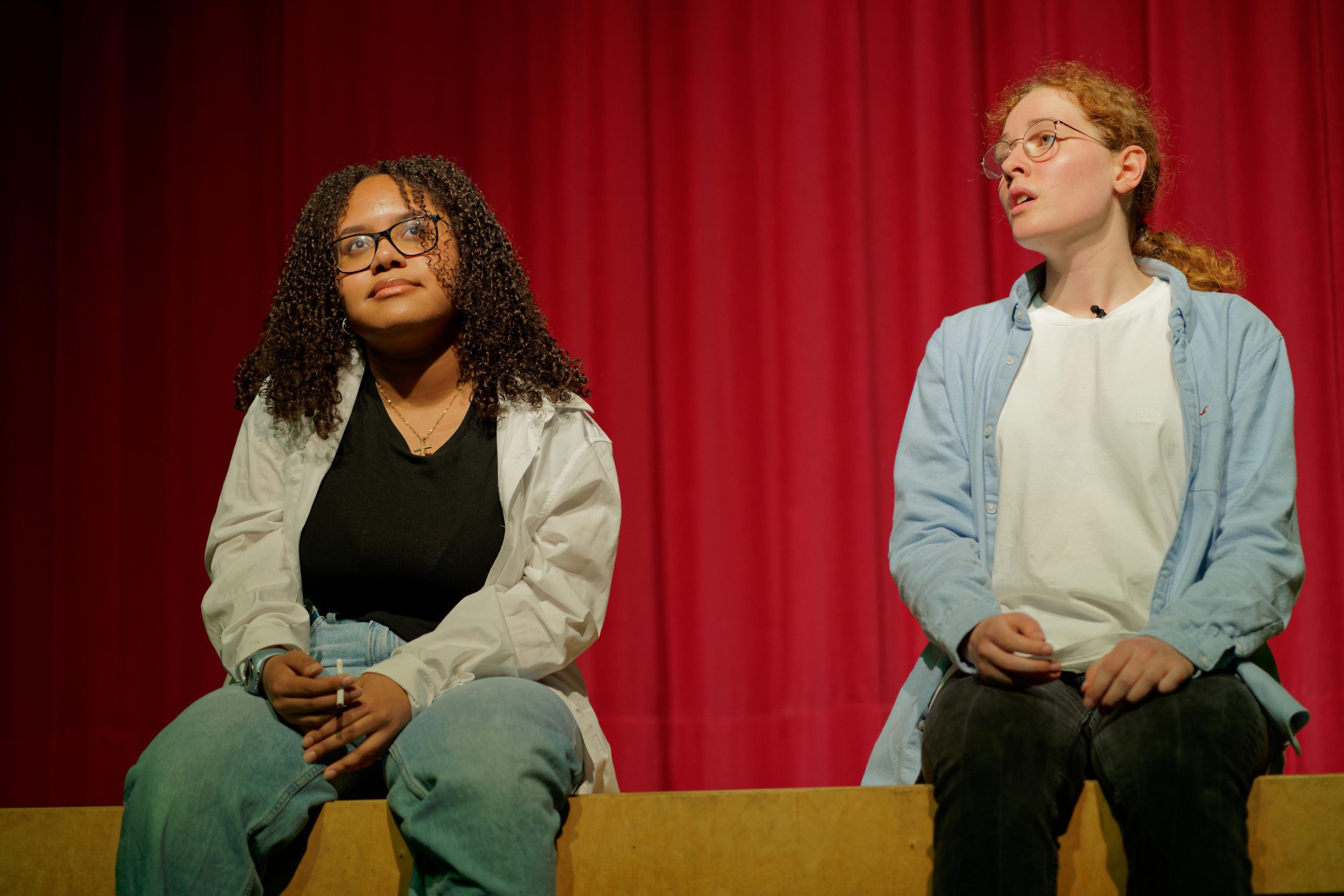 Vier Jugendliche in verschiedenen Outfits stehen auf einer Bühne. Eine Person in einem grauen Hoodie zeigt eine überraschte Reaktion, während eine andere in einem weißen Laborkittel und mit Brille verwirrt aussieht. Die dritte Person in einem roten Sweatshirt scheint eine interaktive Szene zu leiten, während die vierte Person mit langen Haaren und einem schwarzen Oberteil aufmerksam zuschaut. Der Hintergrund ist dunkel, was die Bühne hervorhebt. Vier junge Menschen stehen auf einer Bühne in einem Theater. Zwei von ihnen tragen sportliche Kleidung, während die anderen lässige Outfits anhaben. Die Gruppe scheint in ein Gespräch vertieft zu sein, und die Atmosphäre wirkt freundlich und lebhaft. Im Hintergrund sind einfache Bühnenrequisiten zu sehen. Eine dramatische Szene auf der Bühne, in der eine Person in grauer Kleidung mit einer Waffe auf eine andere Person zeigt, die am Boden liegt. Eine dritte Person kniet neben der am Boden liegenden Person und scheint zu helfen oder Unterstützung zu leisten. Der Hintergrund ist dunkel und mit Vorhängen gestaltet, was die Bühne hervorhebt. Zwei Personen sitzen auf einer Bühne vor einem roten Vorhang. Die erste Person hat lockige Haare und trägt eine schwarze Bluse mit einer hellen Jacke, während die zweite Person lange, lockige Haare hat und ein helles Shirt mit einer blauen Jacke trägt. Beide scheinen in nachdenklicher Pose zu sein. Zwei Personen auf einer Bühne in einem Theaterstück. Eine Person sitzt in einem Rollstuhl und hält ein Mikrofon, während die andere Person, die einen weißen Kittel trägt, interessiert zuhört. Im Hintergrund ist ein rotes Kreuz auf einer grauen Wand sichtbar.