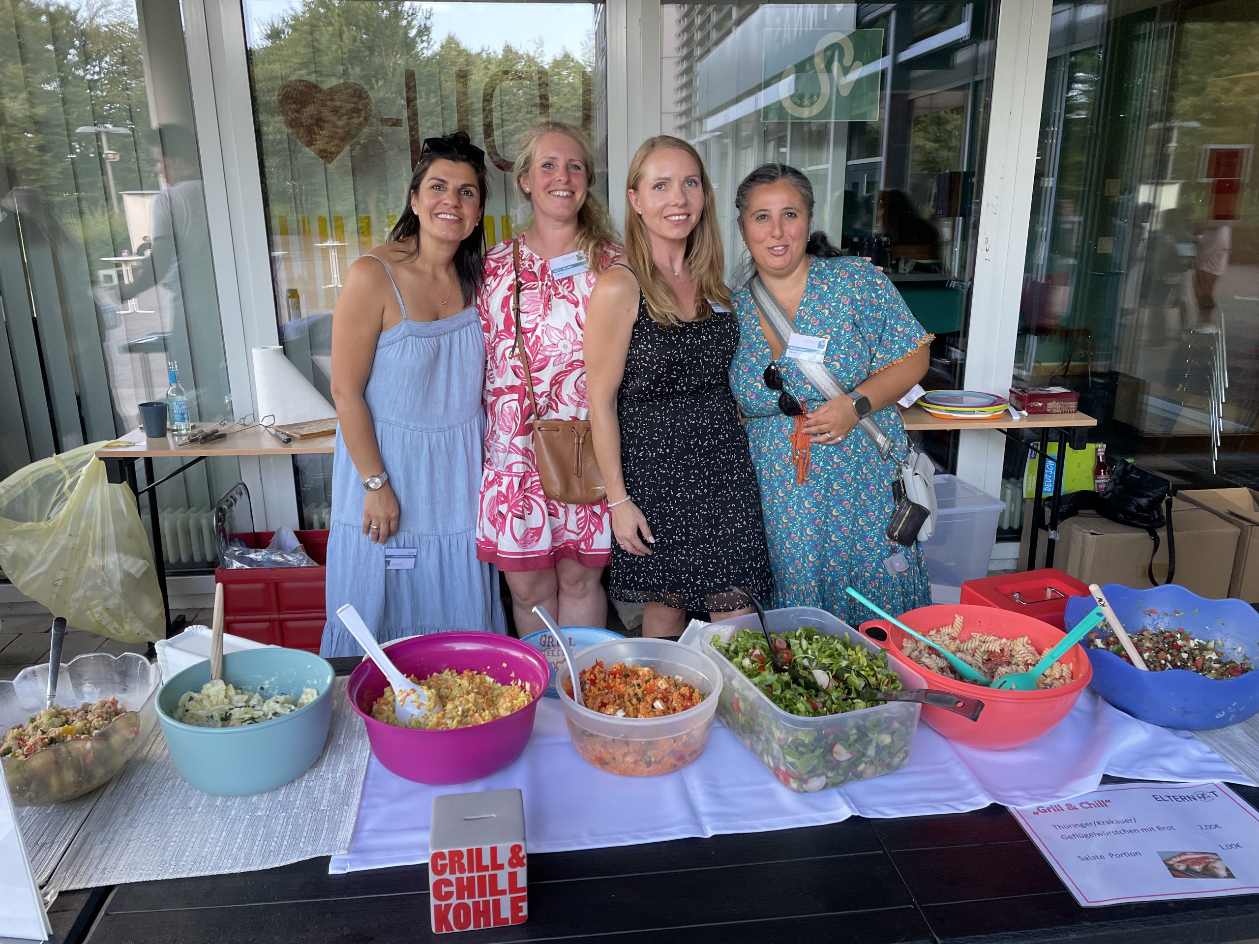 Drei Personen stehen vor einem modernen Gebäude, während eine weitere Person im Vordergrund mit grauen Haaren und einer Brille zu sehen ist. Im Hintergrund sind weitere Menschen und ein Grill zu erkennen. Es ist ein sonniger Tag. Eine Gruppe von Menschen steht an einem Tisch im Freien, um Essen zu servieren und zu genießen. Im Vordergrund sind eine Frau mit langen, lockigen Haaren und ein Junge zu sehen, die Teller mit verschiedenen Speisen halten. Weitere Personen stehen in einer Schlange und unterhalten sich. Die Szenerie wirkt freundlich und gesellig, mit einem modernen Gebäude im Hintergrund. Zwei Personen stehen neben einem Grill. Die Frau trägt ein schwarzes Kleid und hält eine Grillzange, während der Mann in einem hellen T-Shirt steht und ebenfalls eine Grillzange hält. Auf dem Grill sind Würstchen zu sehen. Im Hintergrund sind Fenster und eine Außenansicht eines Gebäudes erkennbar. Drei Schalen mit verschiedenen Salaten auf einem Tisch. Links eine Schale mit einem farbenfrohen, gekochten Salat, in der Mitte eine frische grüne Salatschale mit Tomaten und Radieschen, rechts eine Schale mit Nudelsalat. Ein Servierbesteck liegt in jeder Schale. Der Tisch ist mit einer weißen Tischdecke bedeckt. Vier Frauen stehen an einem Tisch, der mit bunten Schüsseln voller Salate und anderen Speisen gedeckt ist. Die Frauen lächeln in die Kamera und tragen sommerliche Kleidung. Im Hintergrund sind Bäume und ein Gebäude sichtbar. Ein dekoratives Tischtuch mit dem Schriftzug