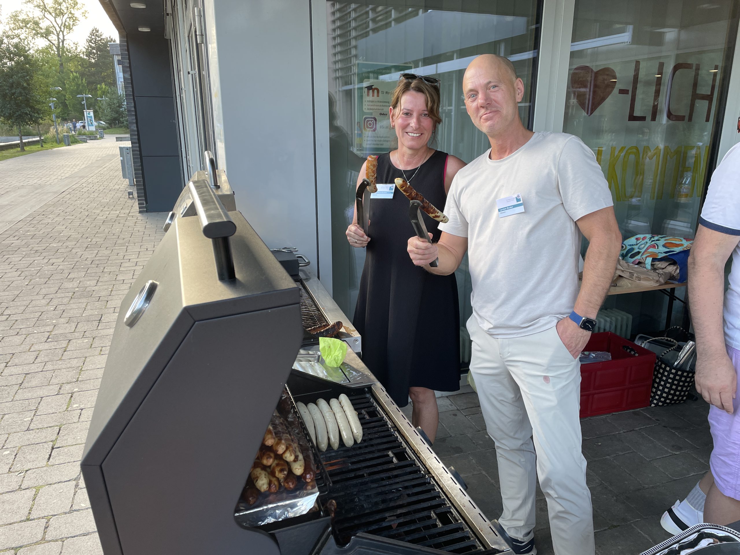 Drei Personen stehen vor einem modernen Gebäude, während eine weitere Person im Vordergrund mit grauen Haaren und einer Brille zu sehen ist. Im Hintergrund sind weitere Menschen und ein Grill zu erkennen. Es ist ein sonniger Tag. Eine Gruppe von Menschen steht an einem Tisch im Freien, um Essen zu servieren und zu genießen. Im Vordergrund sind eine Frau mit langen, lockigen Haaren und ein Junge zu sehen, die Teller mit verschiedenen Speisen halten. Weitere Personen stehen in einer Schlange und unterhalten sich. Die Szenerie wirkt freundlich und gesellig, mit einem modernen Gebäude im Hintergrund. Zwei Personen stehen neben einem Grill. Die Frau trägt ein schwarzes Kleid und hält eine Grillzange, während der Mann in einem hellen T-Shirt steht und ebenfalls eine Grillzange hält. Auf dem Grill sind Würstchen zu sehen. Im Hintergrund sind Fenster und eine Außenansicht eines Gebäudes erkennbar. Drei Schalen mit verschiedenen Salaten auf einem Tisch. Links eine Schale mit einem farbenfrohen, gekochten Salat, in der Mitte eine frische grüne Salatschale mit Tomaten und Radieschen, rechts eine Schale mit Nudelsalat. Ein Servierbesteck liegt in jeder Schale. Der Tisch ist mit einer weißen Tischdecke bedeckt. Vier Frauen stehen an einem Tisch, der mit bunten Schüsseln voller Salate und anderen Speisen gedeckt ist. Die Frauen lächeln in die Kamera und tragen sommerliche Kleidung. Im Hintergrund sind Bäume und ein Gebäude sichtbar. Ein dekoratives Tischtuch mit dem Schriftzug