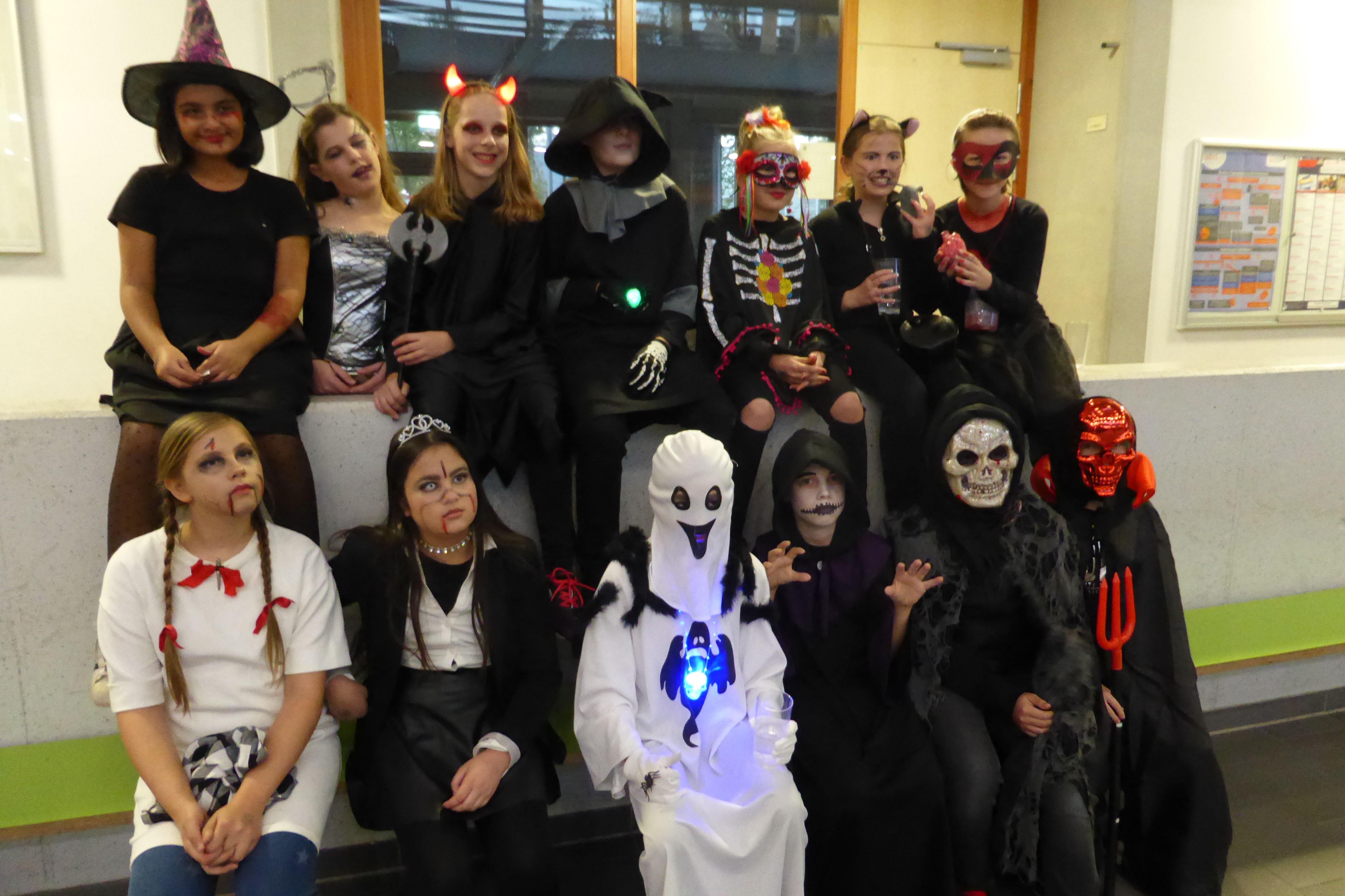 Bleibt nur zu hoffen, dass die Geister auch im nächsten Jahr wieder Lust haben, bei uns am GyRa vorbeizuschauen.Eine Gruppe von Kindern und Jugendlichen in verschiedenen Halloween-Kostümen. Sie sitzen und stehen zusammen in einem Raum mit hellen Wänden. Die Kostüme umfassen Hexen, Skelette, Geister und andere gruselige Figuren. Einige tragen Masken und Schminke, die ihre Gesichter verzieren. Die Stimmung ist festlich und verspielt. Eine Gruppe von Kindern in verschiedenen Kostümen steht in einem Raum. Einige Kinder tragen gruselige Make-up-Designs, während andere bunte oder festliche Kleidung haben. Die Kinder posieren lächelnd für das Foto, und im Hintergrund sind Fenster und eine Wand sichtbar. Drei Kinder in Halloween-Kostümen stehen vor einer Tür. Das erste Kind trägt eine Maske mit einem gruseligem Gesicht und ein schwarzes Outfit. Das zweite Kind hat eine grüne Maske und ein schwarzes Kostüm mit einem Skelettmuster. Das dritte Kind trägt eine Schädelmaske und ebenfalls ein schwarzes Skelettkostüm. Im Hintergrund sind orangefarbene Dekorationen zu sehen. Drei Kinder in Halloween-Kostümen stehen zusammen und lächeln. Sie haben gruselige Schminke im Gesicht: zwei haben weiße Gesichter mit dunklen Augen und Lippen, während das dritte Kind eine schwarze Maske trägt. Die Kinder tragen verschiedene schwarze und rote Kostüme. Im Hintergrund sind weitere Personen in Kostümen zu sehen.