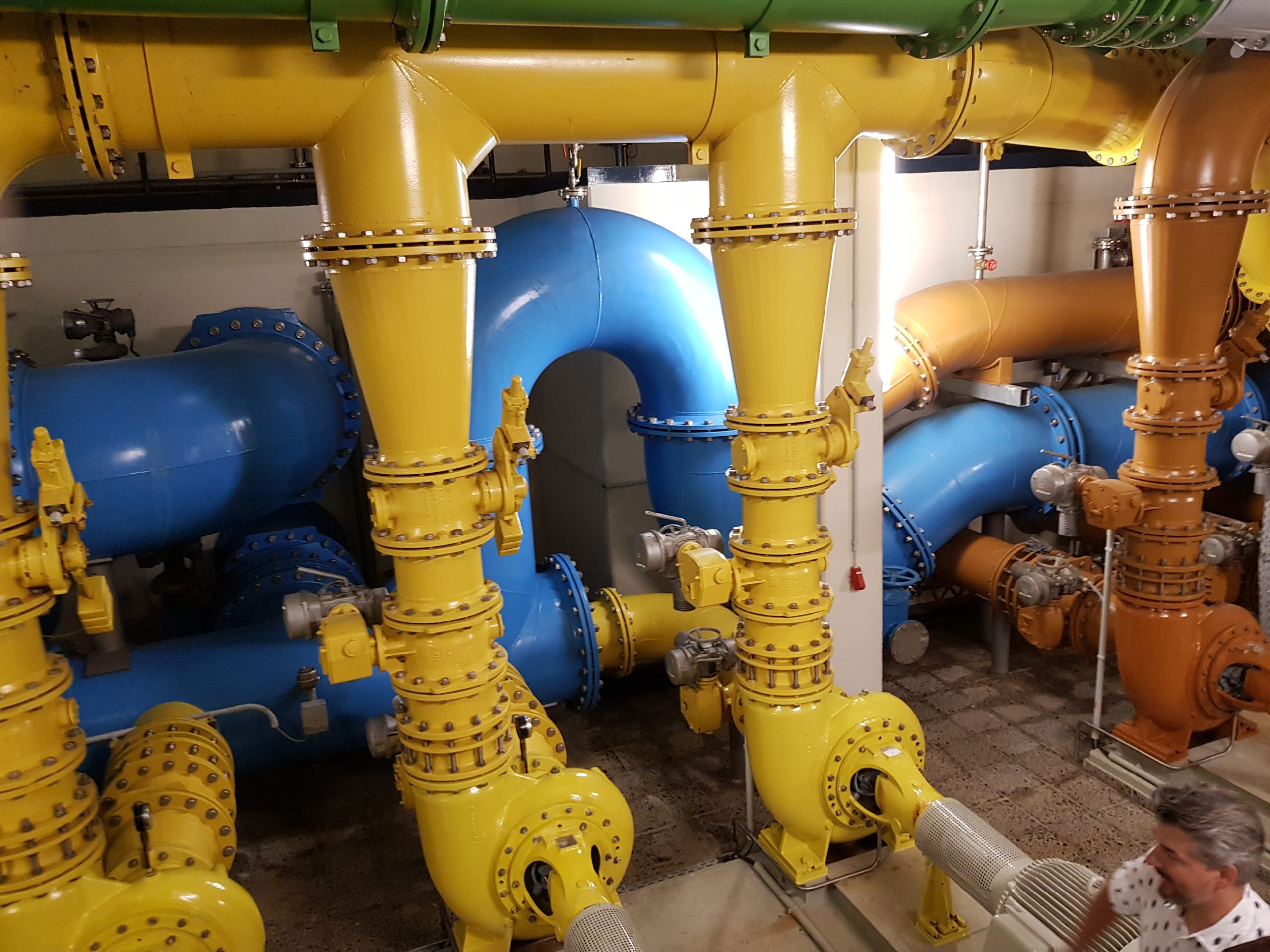 Diagramm eines Wasserwerks mit verschiedenen Komponenten und Verbindungen. Es zeigt die Anordnung von Becken, Rohren und Pumpen, sowie technische Details und Erläuterungen. In der unteren Ecke sind schematische Darstellungen von Wasserflüssen zu sehen. Farbige Rohrleitungen in einer industriellen Umgebung, darunter gelbe, blaue und orange Rohre, die miteinander verbunden sind. Im Vordergrund ist ein Teil eines menschlichen Körpers sichtbar, der an der Arbeit ist. Blick auf eine industrielle Rohrleitungsanlage mit großen, farbigen Rohren in Gelb, Blau und Orange. Im Vordergrund sind mehrere Motoren sichtbar, die zur Steuerung der Rohrsysteme dienen. Die Umgebung wirkt sauber und gut beleuchtet.