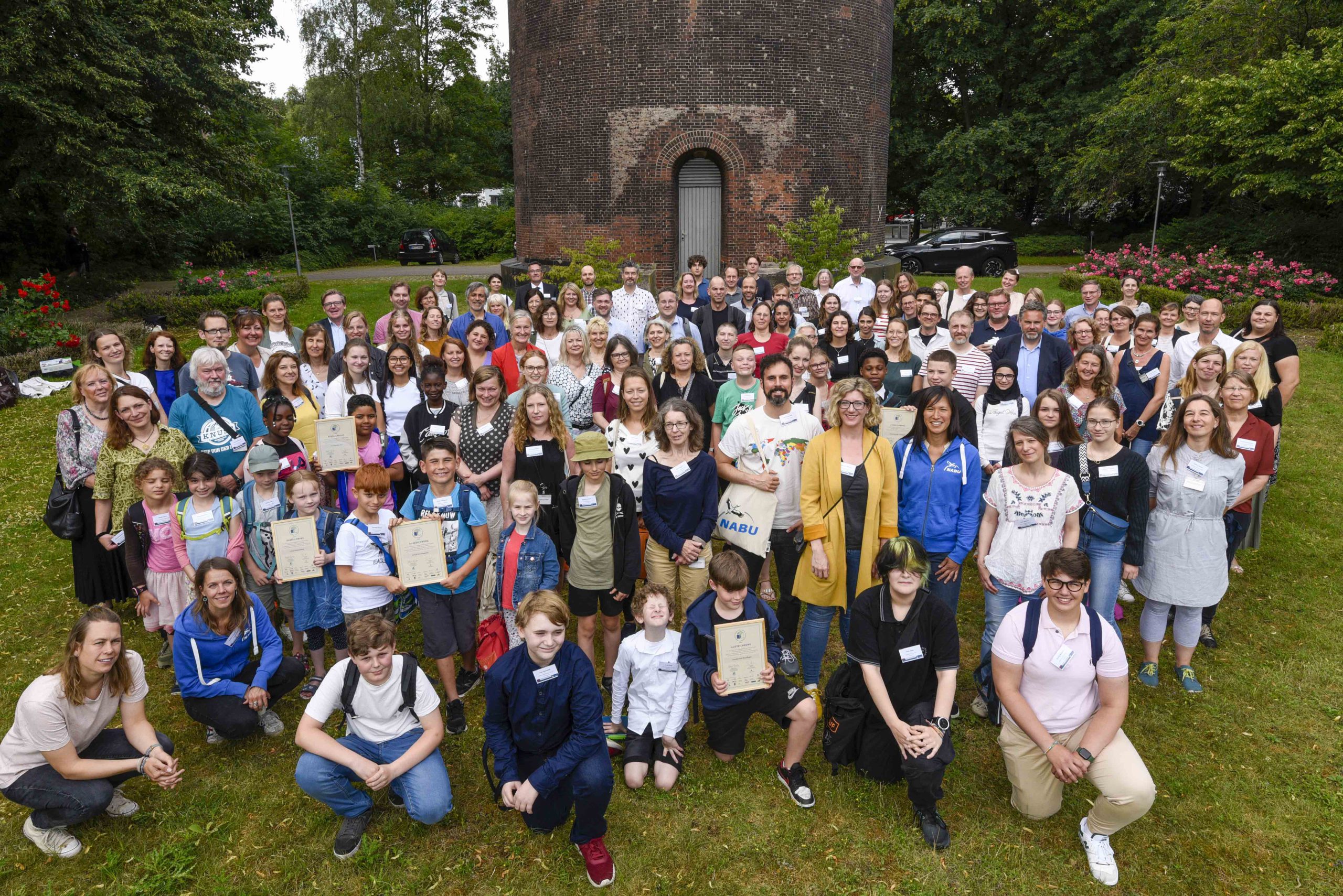 Die Teilnehmer der ausgezeichneten Umweltschulen vor dem Wasserturm Rothenburgsort (Foto: Landesinstitut für Lehrerbildung und Schulentwicklung)