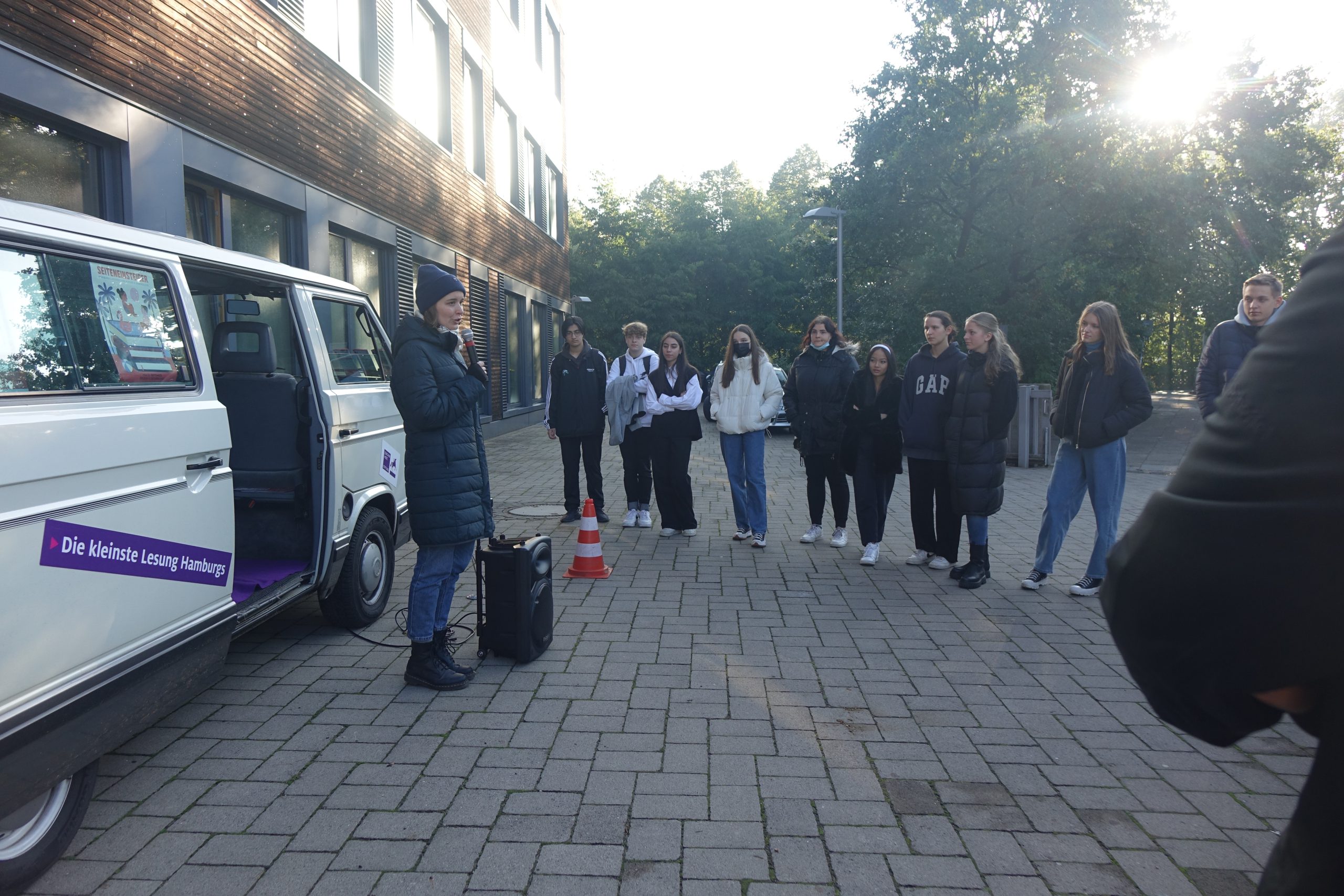 Am Freitag, den 30.9.22, hatten die zehnten Klassen die Möglichkeit, der Poetry-Slammerin Mona Harry bei der kleinsten Lesung Hamburgs auf unserem Schulhof zu lauschen. Die Schul(HOF)-Lesungen sind ein Beitrag des Hamburger Lesefestes für Kinder und Jugendliche, das jedes Jahr vielen Schüler*innen durch Lesungen und kreative Experimente einen individuellen Zugang zu Literatur und Büchern ermöglicht.