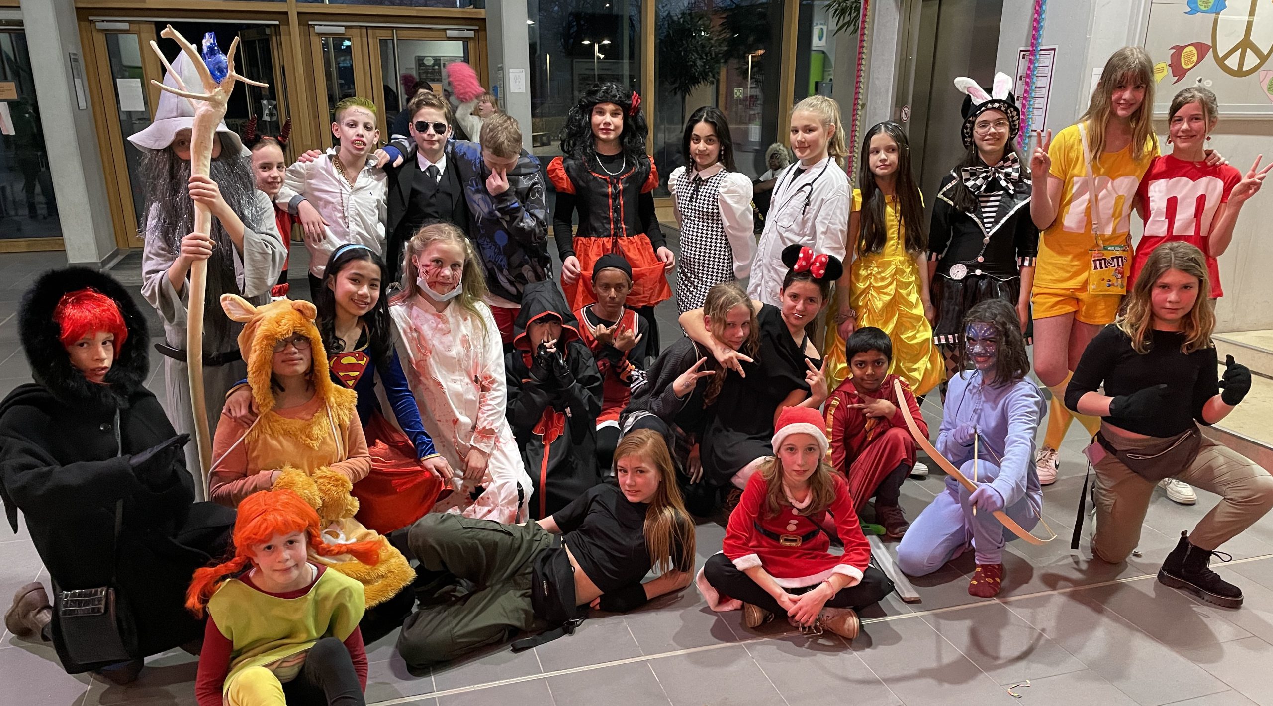 Drei Kinder in Kostümen stehen nebeneinander. Das erste Kind trägt ein rotes Basketballtrikot mit der Aufschrift Drei Kinder stehen nebeneinander in Kostümen. Das erste Kind trägt ein Superhelden-Kostüm in Blau und Rot, das zweite Kind ist in einem schwarzen Oberteil und grünen Hosen gekleidet, und das dritte Kind trägt ein historisches Kleid mit einer Haube und Brille. Im Hintergrund sind Fenster und ein Informationsblatt sichtbar. Zwei Jungen stehen lächelnd zusammen. Der Junge links trägt ein grünes Kostüm und eine grüne Mütze, die an eine Figur aus einem Videospiel erinnert. Er hält einen roten Lollipop in der Hand. Der Junge rechts trägt ein rotes Sweatshirt mit der Aufschrift Drei Kinder posieren in einem Innenraum. Ein Junge trägt einen bunten Kapuzenpullover, während der zweite Junge ein weißes Hemd und eine Kette trägt. Der dritte Junge ist im Anzug gekleidet und trägt Sonnenbrillen. Hintergrund mit verschwommenen Figuren und einer hellen Umgebung. Eine fröhliche Person mit rotem Haar, Sonnenbrille und Blumenkranz steht im Vordergrund. Im Hintergrund sind viele Kinder und Jugendliche in bunten Kostümen, die an einer Feier teilnehmen. Die Umgebung ist hell erleuchtet und dekoriert. Vier Kinder in kostümierten Outfits stehen zusammen. Ein Mädchen trägt eine bunte Maske und ein schwarzes Oberteil, ein anderes ist als Löwe verkleidet, während ein drittes Kind in einem blutigen weißen Kostüm mit Mundschutz zu sehen ist. Das vierte Kind trägt einen weißen Pullover. Sie lächeln und posieren in einer hellen Innenumgebung. Vier junge Mädchen posieren lächelnd zusammen in einem Innenraum. Ein Mädchen trägt ein schwarzes Oberteil und hat rote Teufelshörner, ein anderes trägt ein Outfit mit Minnie-Maus-Ohren, während die beiden anderen in modischer Kleidung gekleidet sind. Sie stehen eng beieinander und wirken fröhlich. Im Hintergrund sind Pflanzen und ein moderner Eingangsbereich sichtbar. Drei Jungen sitzen in einem Raum. Der Junge links trägt ein schwarzes Outfit mit roten Details und eine Mütze. Der Junge in der Mitte trägt ein graues T-Shirt und lächelt. Der Junge rechts trägt ein Superhelden-Kostüm. Auf dem Boden vor ihnen liegen einige Snacks und Getränke. Die Umgebung wirkt freundlich und ungezwungen. Gruppenszene von Kindern und Jugendlichen in bunten Kostümen, die in einer Halle posieren. Einige tragen Tierkostüme oder fantasievolle Outfits, während andere sich als bekannte Charaktere verkleidet haben. Die Gruppe steht sowohl stehend als auch sitzend zusammen und lächelt in die Kamera.