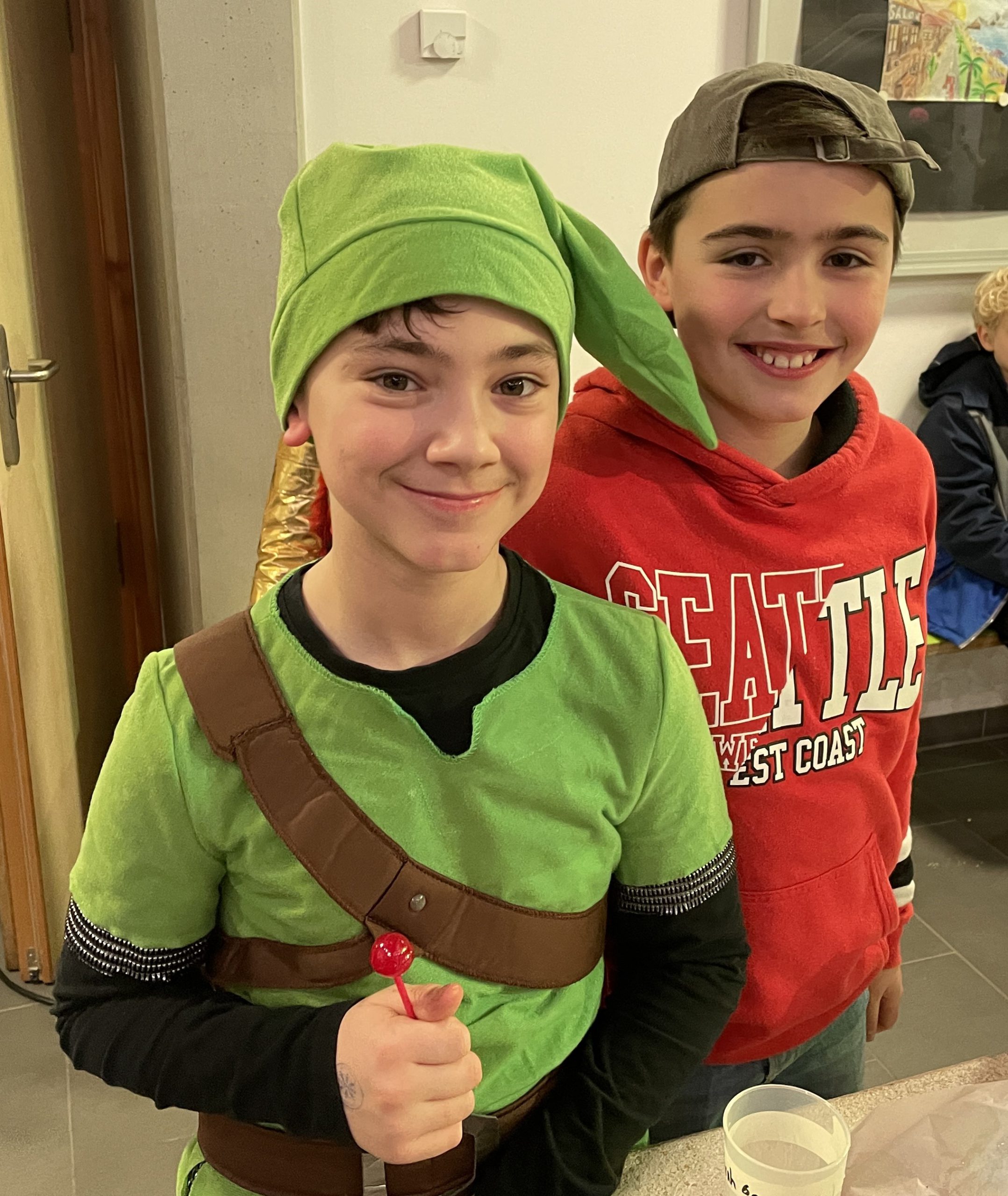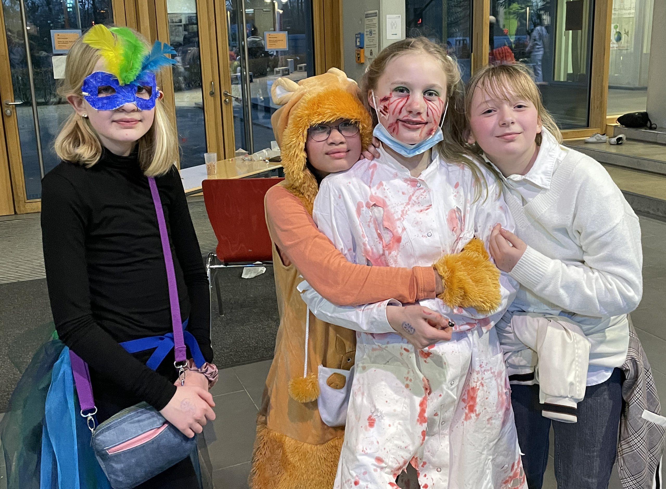 Drei Kinder in Kostümen stehen nebeneinander. Das erste Kind trägt ein rotes Basketballtrikot mit der Aufschrift Drei Kinder stehen nebeneinander in Kostümen. Das erste Kind trägt ein Superhelden-Kostüm in Blau und Rot, das zweite Kind ist in einem schwarzen Oberteil und grünen Hosen gekleidet, und das dritte Kind trägt ein historisches Kleid mit einer Haube und Brille. Im Hintergrund sind Fenster und ein Informationsblatt sichtbar. Zwei Jungen stehen lächelnd zusammen. Der Junge links trägt ein grünes Kostüm und eine grüne Mütze, die an eine Figur aus einem Videospiel erinnert. Er hält einen roten Lollipop in der Hand. Der Junge rechts trägt ein rotes Sweatshirt mit der Aufschrift Drei Kinder posieren in einem Innenraum. Ein Junge trägt einen bunten Kapuzenpullover, während der zweite Junge ein weißes Hemd und eine Kette trägt. Der dritte Junge ist im Anzug gekleidet und trägt Sonnenbrillen. Hintergrund mit verschwommenen Figuren und einer hellen Umgebung. Eine fröhliche Person mit rotem Haar, Sonnenbrille und Blumenkranz steht im Vordergrund. Im Hintergrund sind viele Kinder und Jugendliche in bunten Kostümen, die an einer Feier teilnehmen. Die Umgebung ist hell erleuchtet und dekoriert. Vier Kinder in kostümierten Outfits stehen zusammen. Ein Mädchen trägt eine bunte Maske und ein schwarzes Oberteil, ein anderes ist als Löwe verkleidet, während ein drittes Kind in einem blutigen weißen Kostüm mit Mundschutz zu sehen ist. Das vierte Kind trägt einen weißen Pullover. Sie lächeln und posieren in einer hellen Innenumgebung. Vier junge Mädchen posieren lächelnd zusammen in einem Innenraum. Ein Mädchen trägt ein schwarzes Oberteil und hat rote Teufelshörner, ein anderes trägt ein Outfit mit Minnie-Maus-Ohren, während die beiden anderen in modischer Kleidung gekleidet sind. Sie stehen eng beieinander und wirken fröhlich. Im Hintergrund sind Pflanzen und ein moderner Eingangsbereich sichtbar. Drei Jungen sitzen in einem Raum. Der Junge links trägt ein schwarzes Outfit mit roten Details und eine Mütze. Der Junge in der Mitte trägt ein graues T-Shirt und lächelt. Der Junge rechts trägt ein Superhelden-Kostüm. Auf dem Boden vor ihnen liegen einige Snacks und Getränke. Die Umgebung wirkt freundlich und ungezwungen. Gruppenszene von Kindern und Jugendlichen in bunten Kostümen, die in einer Halle posieren. Einige tragen Tierkostüme oder fantasievolle Outfits, während andere sich als bekannte Charaktere verkleidet haben. Die Gruppe steht sowohl stehend als auch sitzend zusammen und lächelt in die Kamera.