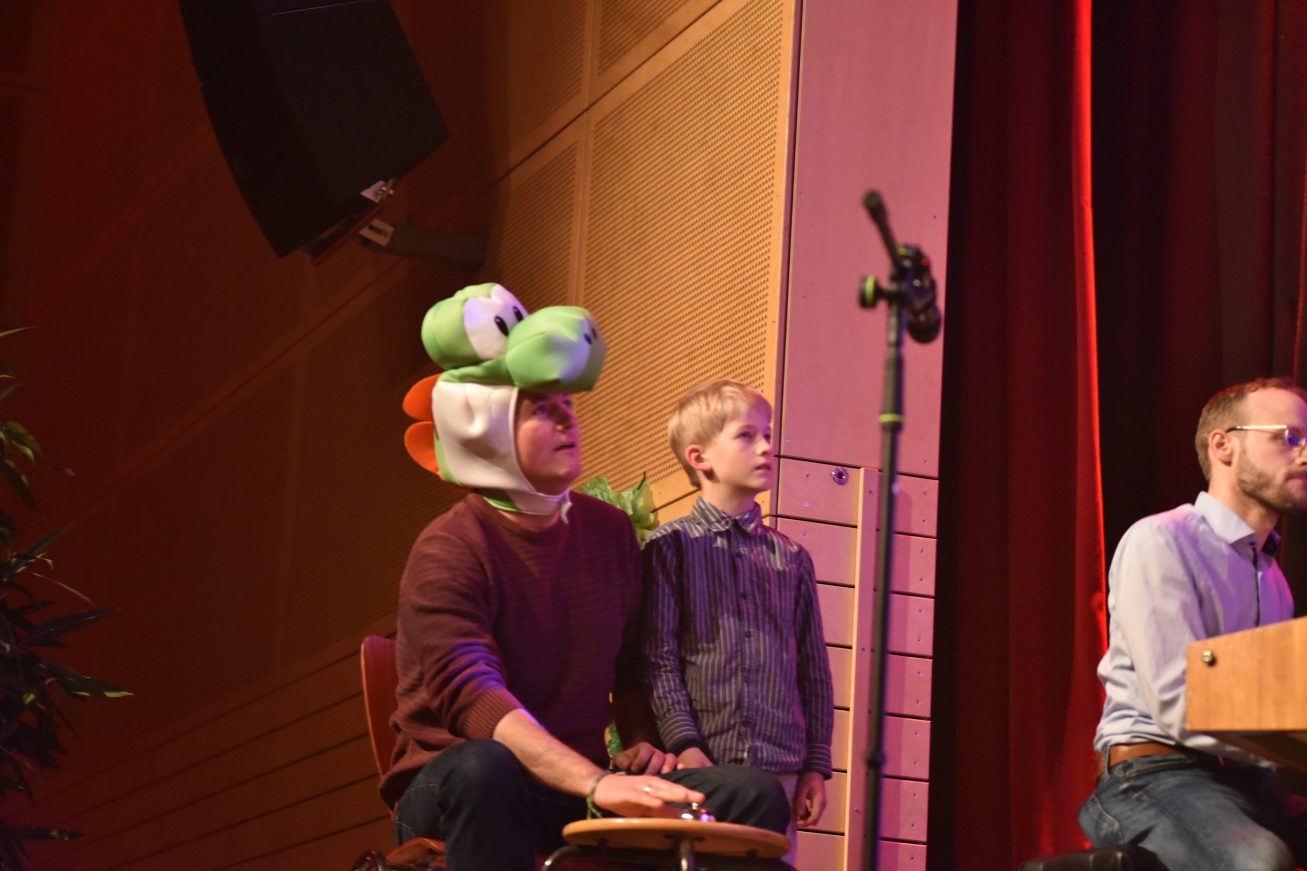 Im zweiten Konzertteil gelang dem Orchester unter der Leitung von Herrn Emde eine Verbindung von Musik und Bild. Die Filmmusik von John Williams ist schließlich für die Leinwand komponiert worden. Doch seit vielen Jahrzehnten konsumieren Schülerinnen und Schüler wie auch Erwachsene in ihrer Freizeit auch Bilder und Töne, auf die sie selbst Einfluss nehmen können. Gemeint sind Computerspiele und die dafür komponierte Musik. So wurde die Sporthalle in eine gigantische Spielekonsole verwandelt, indem der Familienvater „Sven“ aus dem Publikum zum Gameplay eines Jump’n’Run-Klassikers an einer Tischglocke solierte während das Orchester die Musik von „Super Mario“ (1985) beisteuerte. Eine Hommage an das Point’n’Click-Adventure „Monkey Island“ (1990) durfte auch nicht fehlen. Ein weiterer Ohrwurm erreichte damals die junge Gameboy-Szene auf den Schulhöfen dieser Welt: „Tetris“. Das Publikum war hier wieder aktiv, indem es Kissen in Form von Tetris-Steinen wandern ließ. Da diese Melodie in der russischen Volksliedtradition wurzelt, wurde das Tempo allmählich gesteigert. Das Publikum bejubelte im Anschluss den Pop-Rock-Chor und den 5er-Chor unter der Leitung von Herrn Krösser, dessen Sängerinnen und Sänger mit aktuellen Hits und Pop-Balladen viele zum Mitsingen brachten. Eine überzeugende Tanzdarbietung der Schülergruppe aus den Jahrgängen 5-7 unter Leitung der Abiturientin Isabel Annor schloss das Konzert ab. Dank gebührt dem 12er-Internationality-Profilkurs von Herrn Köhler, der bereits vor Einlass und während der Pause dem Publikum Speisen und Getränke anbot.