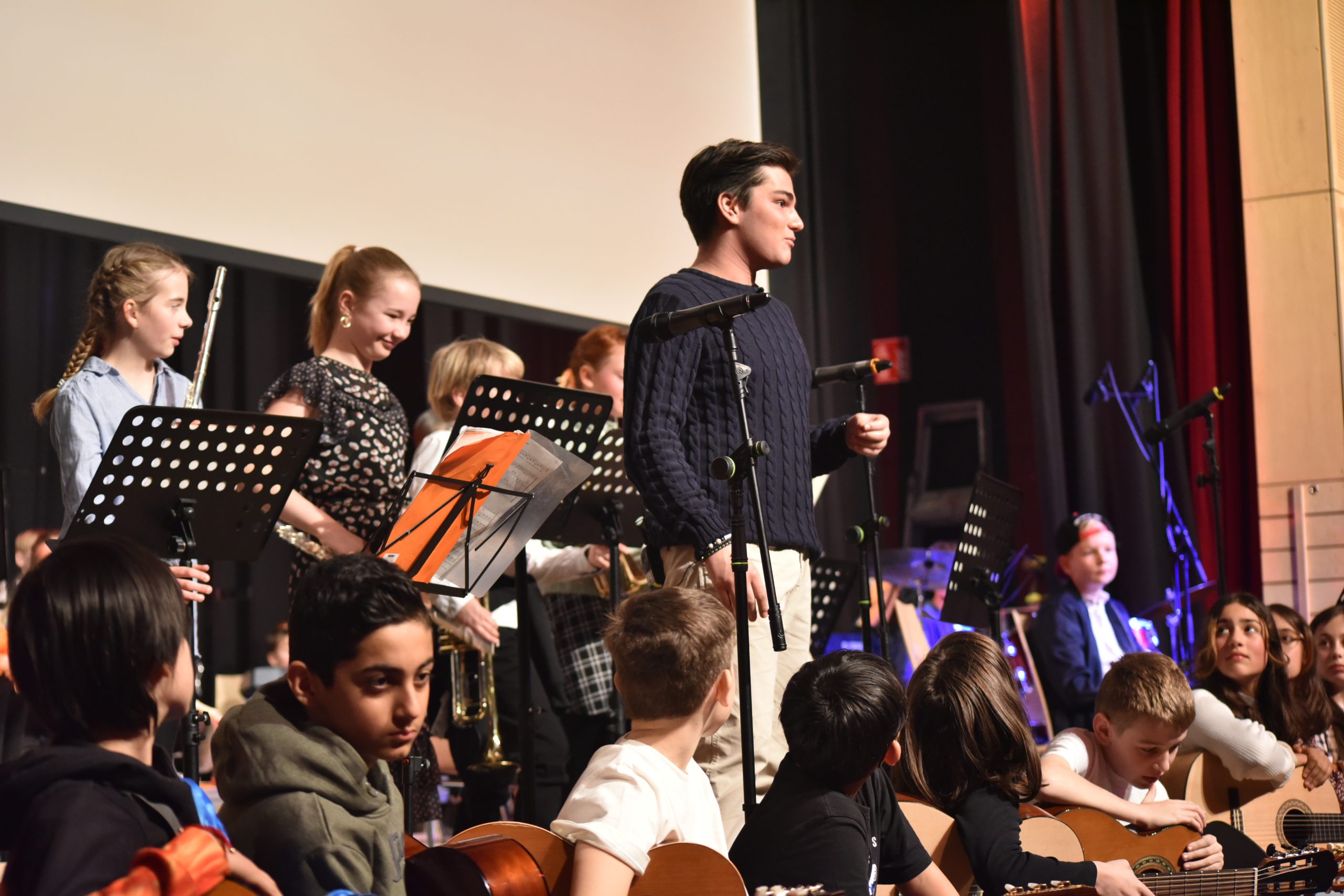 Die Gruppen und Beiträge waren in vielerlei Hinsicht abwechslungsreich. So eröffneten zunächst die Streicher unter der Leitung von Frau Rehren und Herrn Bautz und die Flöten unter der Leitung von Frau Köchlin mit klassischen und romantischen Frühlingsklängen von Charpentier und Schubert. Es folgten die Gitarren unter der Leitung von Frau Münter mit einem „Tanz der amerikanischen Ureinwohner“. Auf einem Frühlingskonzert darf natürlich das Volkslied „Im Märzen der Bauer“ nicht fehlen. Frau Münter schaffte es zudem, mit dem Pop-Song „Save your tears“ alle Instrumentalkurse zu beteiligen und als Sängerin Tara Majic (5e) zu gewinnen. Der Instrumentalkurs von Herrn Emde wagte den Spagat zwischen Europahymne und einem Hamburger Gassenhauer, bei dem das Publikum schunkelnd mitsang. Als Abschluss des ersten Konzertteils dirigierte Herr Bergemann seinen 5er-Chor mit zahlreichen internationalen Volksliedern.