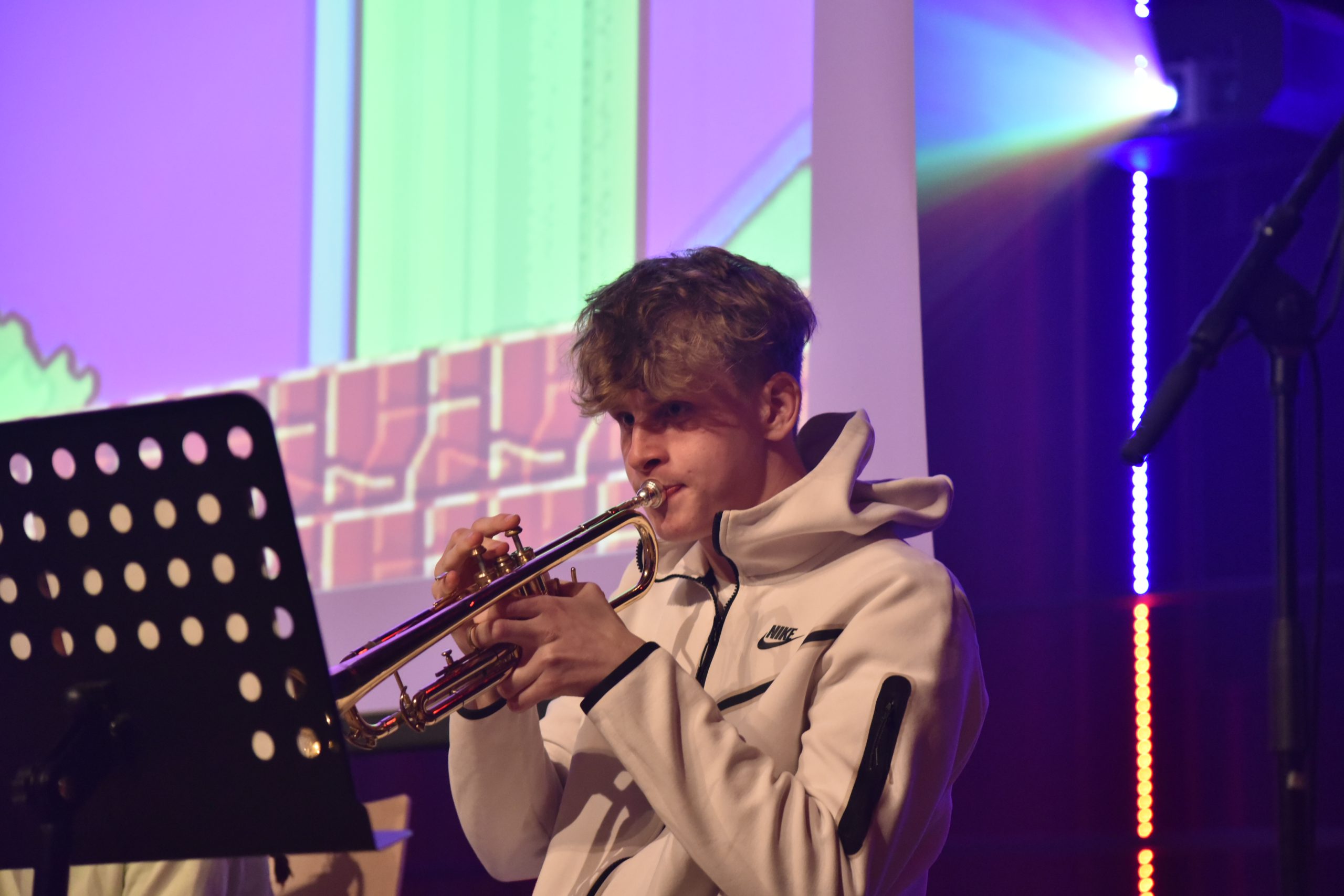 Im zweiten Konzertteil gelang dem Orchester unter der Leitung von Herrn Emde eine Verbindung von Musik und Bild. Die Filmmusik von John Williams ist schließlich für die Leinwand komponiert worden. Doch seit vielen Jahrzehnten konsumieren Schülerinnen und Schüler wie auch Erwachsene in ihrer Freizeit auch Bilder und Töne, auf die sie selbst Einfluss nehmen können. Gemeint sind Computerspiele und die dafür komponierte Musik. So wurde die Sporthalle in eine gigantische Spielekonsole verwandelt, indem der Familienvater „Sven“ aus dem Publikum zum Gameplay eines Jump’n’Run-Klassikers an einer Tischglocke solierte während das Orchester die Musik von „Super Mario“ (1985) beisteuerte. Eine Hommage an das Point’n’Click-Adventure „Monkey Island“ (1990) durfte auch nicht fehlen. Ein weiterer Ohrwurm erreichte damals die junge Gameboy-Szene auf den Schulhöfen dieser Welt: „Tetris“. Das Publikum war hier wieder aktiv, indem es Kissen in Form von Tetris-Steinen wandern ließ. Da diese Melodie in der russischen Volksliedtradition wurzelt, wurde das Tempo allmählich gesteigert. Das Publikum bejubelte im Anschluss den Pop-Rock-Chor und den 5er-Chor unter der Leitung von Herrn Krösser, dessen Sängerinnen und Sänger mit aktuellen Hits und Pop-Balladen viele zum Mitsingen brachten. Eine überzeugende Tanzdarbietung der Schülergruppe aus den Jahrgängen 5-7 unter Leitung der Abiturientin Isabel Annor schloss das Konzert ab. Dank gebührt dem 12er-Internationality-Profilkurs von Herrn Köhler, der bereits vor Einlass und während der Pause dem Publikum Speisen und Getränke anbot.