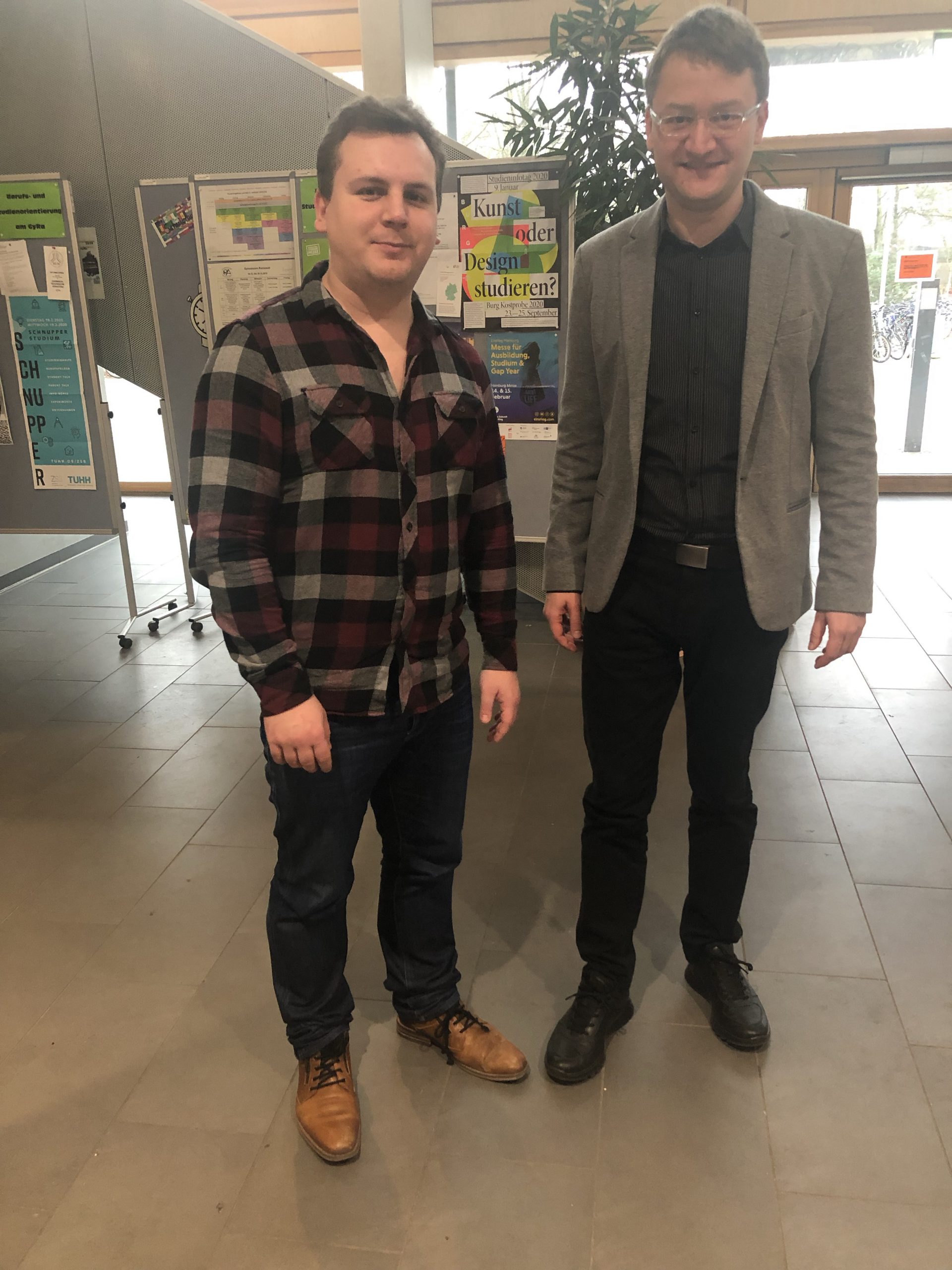 Zwei Männer stehen in einem hellen Innenraum, umgeben von Informationsplakaten. Der links stehende Mann trägt ein kariertes Hemd und Jeans, während der rechts stehende Mann einen grauen Blazer über einem schwarzen Hemd trägt. Beide schauen freundlich in die Kamera.