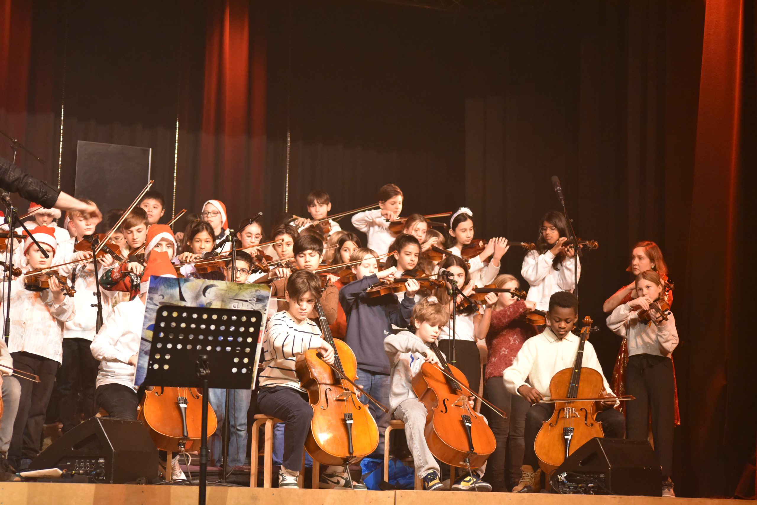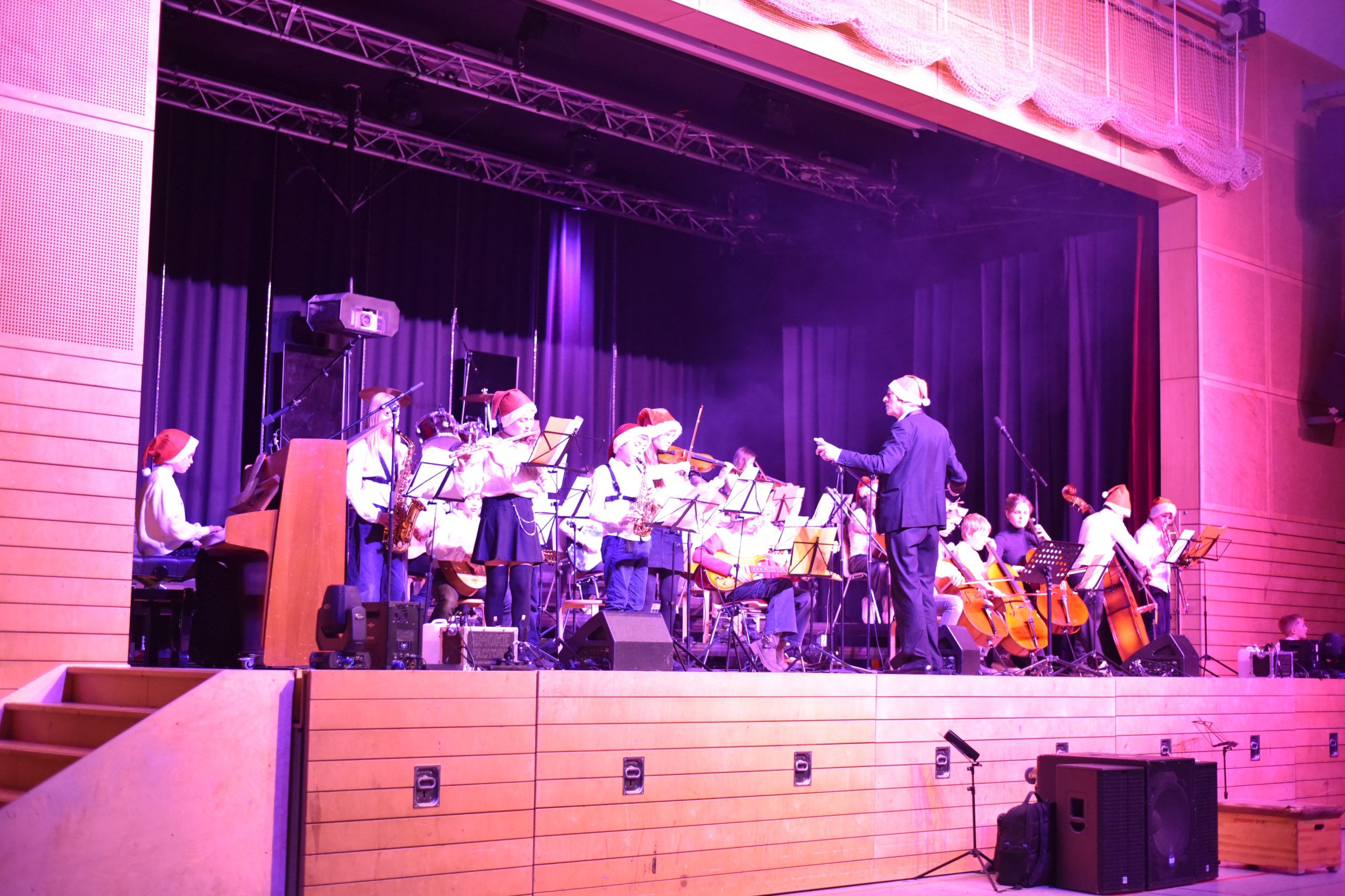 Eine Gruppe von acht Personen steht auf einer Bühne, alle halten eine Rose in der Hand. Sie tragen verschiedene Outfits, darunter ein rotes Kleid und formelle Kleidung. Im Hintergrund sind Mikrofone und Bühnenbeleuchtung sichtbar. Die Atmosphäre scheint festlich und feierlich zu sein. Ein Mann steht auf einer Kiste und singt in ein Mikrofon, während er von einem Orchester begleitet wird. Im Hintergrund sind Musiker mit Celli zu sehen. Der Mann trägt einen schwarzen Anzug und eine rote Mütze. Die Bühne ist schwach beleuchtet, was eine dramatische Atmosphäre schafft. Ein Kinderorchester steht auf der Bühne und spielt. Die Musiker tragen Weihnachtsmützen und spielen verschiedene Instrumente wie Violine und Cello. Ein Dirigent leitet das Orchester von vorne. Die Bühne ist festlich beleuchtet. Eine Gruppe von Schülern steht auf der Bühne und singt. Viele tragen Weihnachtsmützen und weiße Hemden. Einige halten Instrumente. Die Bühne ist mit bunten Lichtern beleuchtet, und im Hintergrund sind weitere Schüler zu sehen. Eine Lehrkraft steht rechts und schaut auf die Gruppe. Eine Gruppe von Kindern und Jugendlichen spielt auf der Bühne verschiedene Musikinstrumente, darunter Geigen und Celli. Im Hintergrund sind einige Musiker zu sehen, die konzentriert musizieren. Die Bühne ist schwach beleuchtet, mit rotem Licht, und ein Notenständer steht im Vordergrund. Eine Gruppe von jungen Musikern spielt auf der Bühne, während eine Lehrerin mit einem Geigenbogen dirigiert. Die Kinder tragen Weihnachtsmützen und spielen verschiedene Streichinstrumente, darunter Geigen und ein Cello. Im Hintergrund sind bunte Lichter und eine festliche Dekoration zu sehen. Eine Band tritt auf einer Bühne auf. Im Vordergrund steht eine Sängerin mit Mikrofon, während im Hintergrund eine Schlagzeugerin und zwei weitere Musiker an Gitarre und Keyboard spielen. Die Bühne ist mit Nebel und Lichtstrahlen beleuchtet. Die Musiker befinden sich auf erhöhten Podesten. Eine Gruppe von fünf Musikern steht auf einer Bühne. Zwei Sängerinnen mit Mikrofonen sind in der Mitte, während ein Musiker mit einer Cajón links und ein weiterer mit einer Gitarre rechts stehen. Ein weiterer Musiker mit einer Mütze ist im Hintergrund zu sehen. Die Bühne ist schwach beleuchtet und mit verschiedenen Musikinstrumenten ausgestattet. Drei Musikerinnen und Musiker stehen auf einer Bühne. Eine Sängerin in einem weißen Kleid hält ein Mikrofon, während eine andere Musikerin mit einer E-Gitarre spielt. Der dritte Musiker steht daneben und hat ein Mikrofon in der Hand. Die Bühne ist mit bunten Lichtern beleuchtet und im Hintergrund sind Musikinstrumente sichtbar. Es herrscht eine festliche Atmosphäre. Eine Musikband tritt auf einer Bühne auf. Im Vordergrund steht eine Sängerin mit Mikrofon, während ein Musiker auf einem Cajón sitzt. Im Hintergrund sind weitere Bandmitglieder zu sehen, die verschiedene Instrumente spielen, darunter ein Schlagzeug und eine E-Gitarre. Die Bühne ist mit bunten Lichtern beleuchtet. Eine Gruppe von Mädchen in festlicher Kleidung steht auf einer Bühne. Sie posieren fröhlich, einige machen lustige Gesten. Im Hintergrund sind farbige Lichter und eine Bühne zu sehen. Ein Orchester spielt auf einer Bühne in einem Veranstaltungsraum. Die Musikerinnen und Musiker tragen rote Hüte und spielen verschiedene Instrumente, während ein Dirigent sie anleitet. Die Bühne ist beleuchtet, und im Hintergrund sind Vorhänge zu sehen. Eine Gruppe von Schülerinnen und Schülern steht auf einer Bühne und singt. Sie tragen überwiegend helle Kleidung und sind in einer festlichen Atmosphäre mit buntem Licht beleuchtet. Im Vordergrund ist eine Person in schwarzer Kleidung zu sehen, die die Gruppe leitet. Im Hintergrund sind Instrumente und Ständer für Noten zu erkennen. Eine Gruppe von Kindern und Jugendlichen steht auf einer Bühne und singt. Im Vordergrund sitzen zwei Musiker an einem Klavier. Der Raum ist schwach beleuchtet, mit bunten Lichtstrahlen, die von der Bühne ausgehen. Die Sänger tragen überwiegend helle Kleidung, während einer der Musiker einen schwarzen Anzug und einen Hut trägt. Eine Gruppe von Kindern und Jugendlichen steht und sitzt auf einer Bühne, die musizieren und singen. Viele tragen Weihnachtsmützen und T-Shirts. Einige halten Gitarren, während andere im Hintergrund stehen und mitspielen. Die Bühne ist festlich dekoriert, und es gibt ein leichtes Nebellicht.