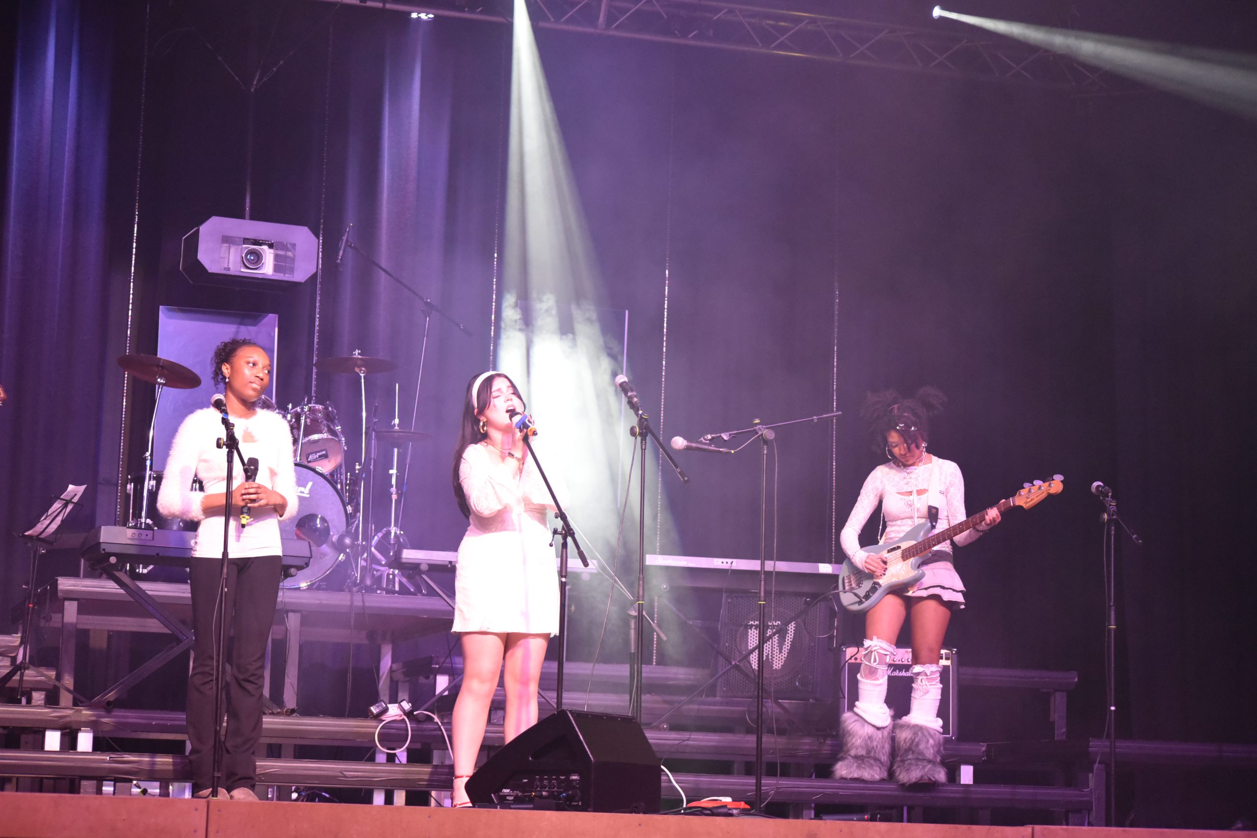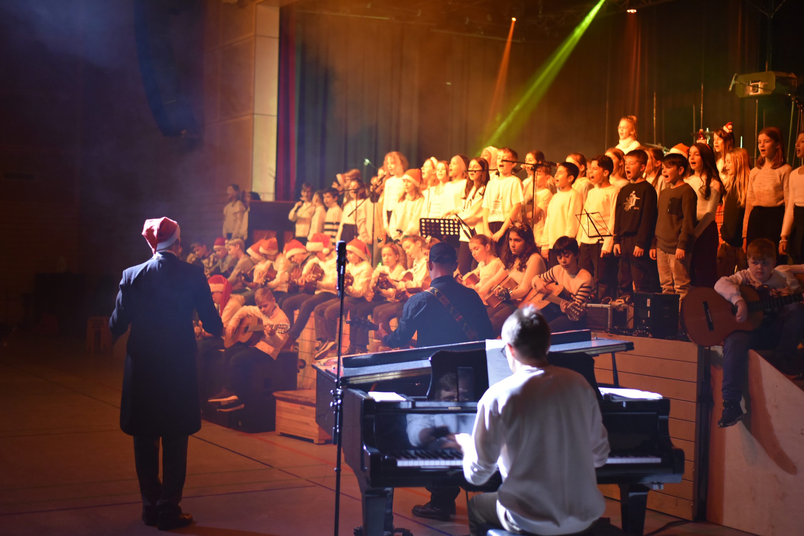 Eine Gruppe von Schülern steht auf der Bühne und singt. Viele tragen Weihnachtsmützen und weiße Hemden. Einige halten Instrumente. Die Bühne ist mit bunten Lichtern beleuchtet, und im Hintergrund sind weitere Schüler zu sehen. Eine Lehrkraft steht rechts und schaut auf die Gruppe.