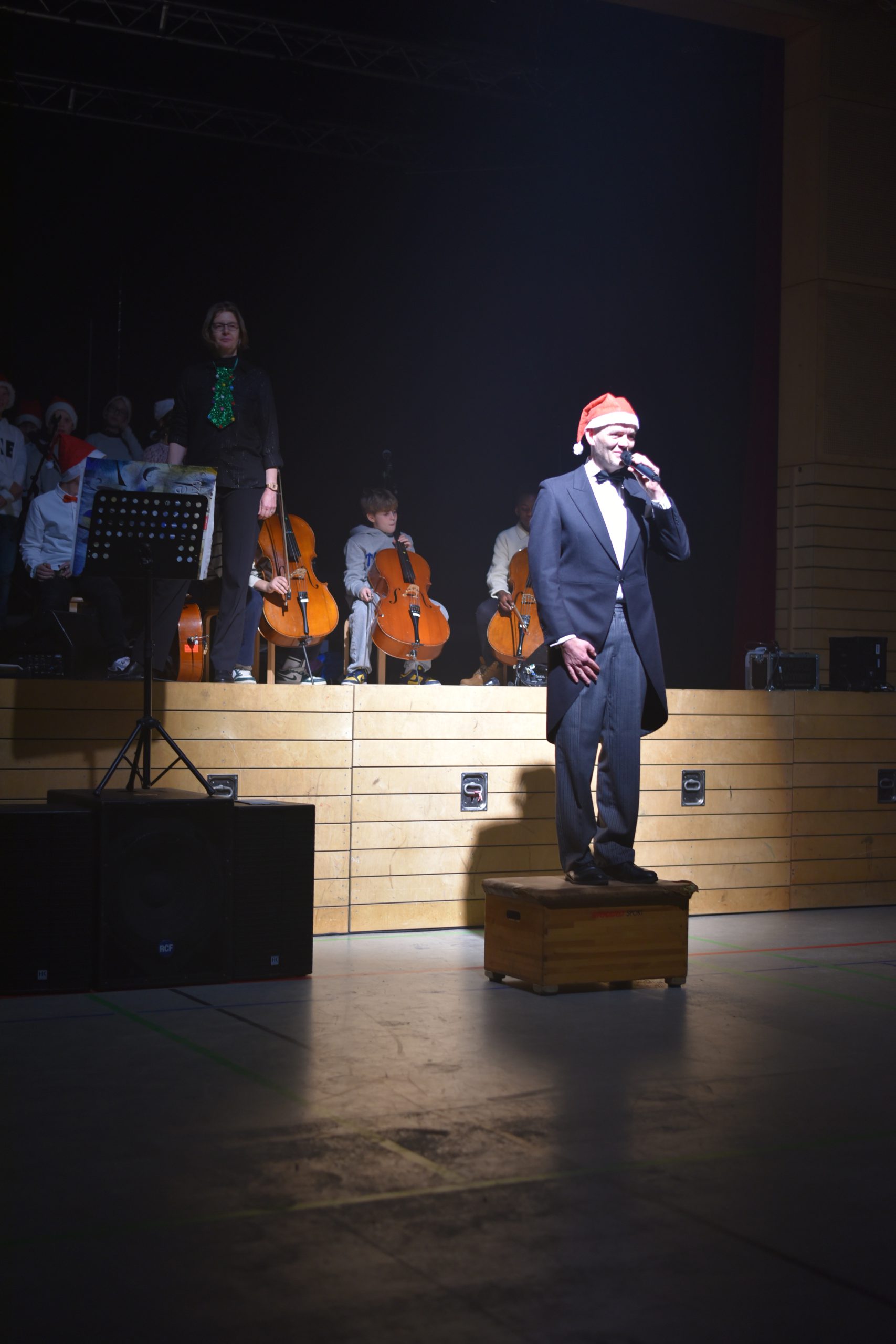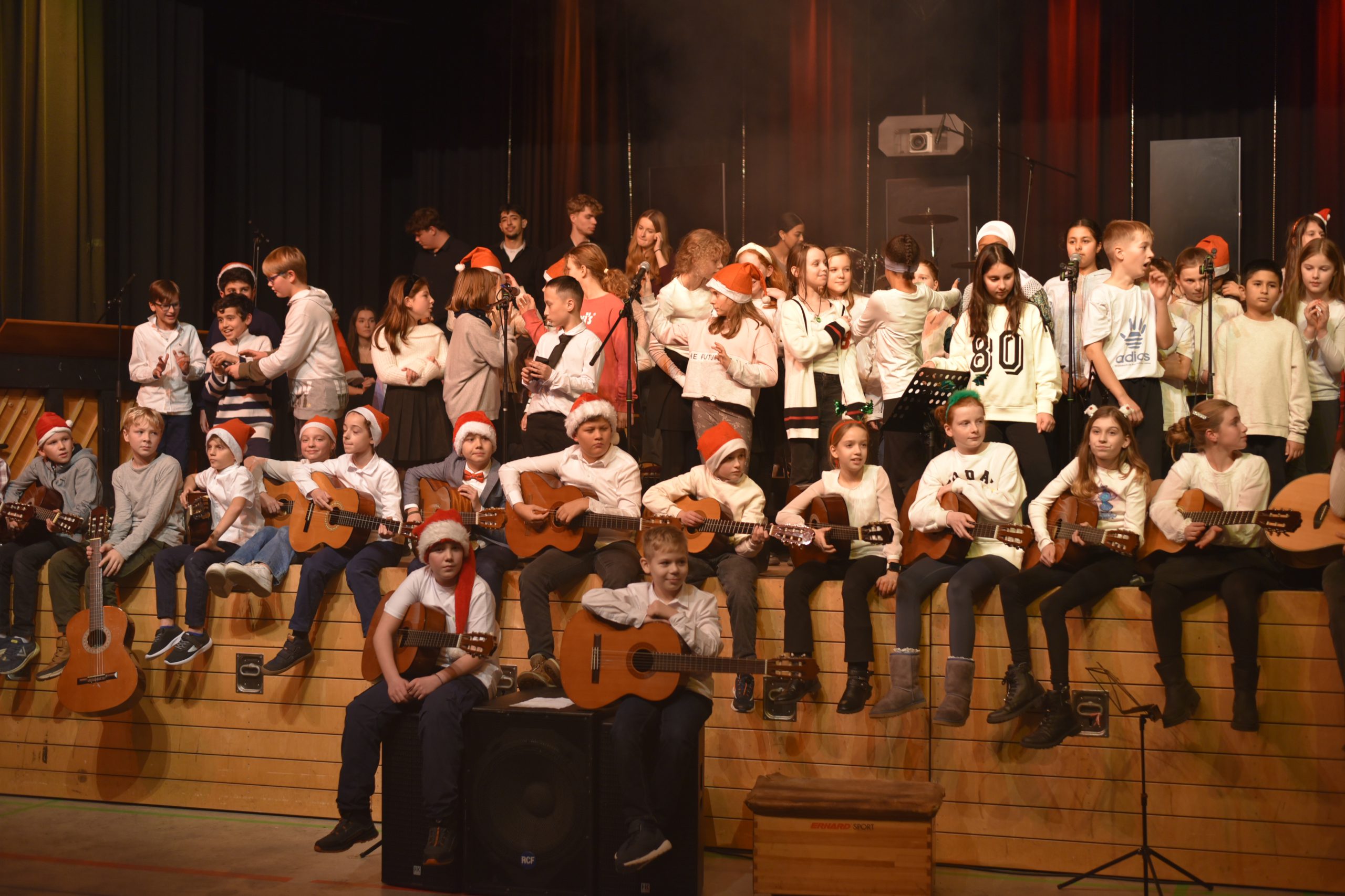 Eine Gruppe von acht Personen steht auf einer Bühne, alle halten eine Rose in der Hand. Sie tragen verschiedene Outfits, darunter ein rotes Kleid und formelle Kleidung. Im Hintergrund sind Mikrofone und Bühnenbeleuchtung sichtbar. Die Atmosphäre scheint festlich und feierlich zu sein. Ein Mann steht auf einer Kiste und singt in ein Mikrofon, während er von einem Orchester begleitet wird. Im Hintergrund sind Musiker mit Celli zu sehen. Der Mann trägt einen schwarzen Anzug und eine rote Mütze. Die Bühne ist schwach beleuchtet, was eine dramatische Atmosphäre schafft. Ein Kinderorchester steht auf der Bühne und spielt. Die Musiker tragen Weihnachtsmützen und spielen verschiedene Instrumente wie Violine und Cello. Ein Dirigent leitet das Orchester von vorne. Die Bühne ist festlich beleuchtet. Eine Gruppe von Schülern steht auf der Bühne und singt. Viele tragen Weihnachtsmützen und weiße Hemden. Einige halten Instrumente. Die Bühne ist mit bunten Lichtern beleuchtet, und im Hintergrund sind weitere Schüler zu sehen. Eine Lehrkraft steht rechts und schaut auf die Gruppe. Eine Gruppe von Kindern und Jugendlichen spielt auf der Bühne verschiedene Musikinstrumente, darunter Geigen und Celli. Im Hintergrund sind einige Musiker zu sehen, die konzentriert musizieren. Die Bühne ist schwach beleuchtet, mit rotem Licht, und ein Notenständer steht im Vordergrund. Eine Gruppe von jungen Musikern spielt auf der Bühne, während eine Lehrerin mit einem Geigenbogen dirigiert. Die Kinder tragen Weihnachtsmützen und spielen verschiedene Streichinstrumente, darunter Geigen und ein Cello. Im Hintergrund sind bunte Lichter und eine festliche Dekoration zu sehen. Eine Band tritt auf einer Bühne auf. Im Vordergrund steht eine Sängerin mit Mikrofon, während im Hintergrund eine Schlagzeugerin und zwei weitere Musiker an Gitarre und Keyboard spielen. Die Bühne ist mit Nebel und Lichtstrahlen beleuchtet. Die Musiker befinden sich auf erhöhten Podesten. Eine Gruppe von fünf Musikern steht auf einer Bühne. Zwei Sängerinnen mit Mikrofonen sind in der Mitte, während ein Musiker mit einer Cajón links und ein weiterer mit einer Gitarre rechts stehen. Ein weiterer Musiker mit einer Mütze ist im Hintergrund zu sehen. Die Bühne ist schwach beleuchtet und mit verschiedenen Musikinstrumenten ausgestattet. Drei Musikerinnen und Musiker stehen auf einer Bühne. Eine Sängerin in einem weißen Kleid hält ein Mikrofon, während eine andere Musikerin mit einer E-Gitarre spielt. Der dritte Musiker steht daneben und hat ein Mikrofon in der Hand. Die Bühne ist mit bunten Lichtern beleuchtet und im Hintergrund sind Musikinstrumente sichtbar. Es herrscht eine festliche Atmosphäre. Eine Musikband tritt auf einer Bühne auf. Im Vordergrund steht eine Sängerin mit Mikrofon, während ein Musiker auf einem Cajón sitzt. Im Hintergrund sind weitere Bandmitglieder zu sehen, die verschiedene Instrumente spielen, darunter ein Schlagzeug und eine E-Gitarre. Die Bühne ist mit bunten Lichtern beleuchtet. Eine Gruppe von Mädchen in festlicher Kleidung steht auf einer Bühne. Sie posieren fröhlich, einige machen lustige Gesten. Im Hintergrund sind farbige Lichter und eine Bühne zu sehen. Ein Orchester spielt auf einer Bühne in einem Veranstaltungsraum. Die Musikerinnen und Musiker tragen rote Hüte und spielen verschiedene Instrumente, während ein Dirigent sie anleitet. Die Bühne ist beleuchtet, und im Hintergrund sind Vorhänge zu sehen. Eine Gruppe von Schülerinnen und Schülern steht auf einer Bühne und singt. Sie tragen überwiegend helle Kleidung und sind in einer festlichen Atmosphäre mit buntem Licht beleuchtet. Im Vordergrund ist eine Person in schwarzer Kleidung zu sehen, die die Gruppe leitet. Im Hintergrund sind Instrumente und Ständer für Noten zu erkennen. Eine Gruppe von Kindern und Jugendlichen steht auf einer Bühne und singt. Im Vordergrund sitzen zwei Musiker an einem Klavier. Der Raum ist schwach beleuchtet, mit bunten Lichtstrahlen, die von der Bühne ausgehen. Die Sänger tragen überwiegend helle Kleidung, während einer der Musiker einen schwarzen Anzug und einen Hut trägt. Eine Gruppe von Kindern und Jugendlichen steht und sitzt auf einer Bühne, die musizieren und singen. Viele tragen Weihnachtsmützen und T-Shirts. Einige halten Gitarren, während andere im Hintergrund stehen und mitspielen. Die Bühne ist festlich dekoriert, und es gibt ein leichtes Nebellicht.