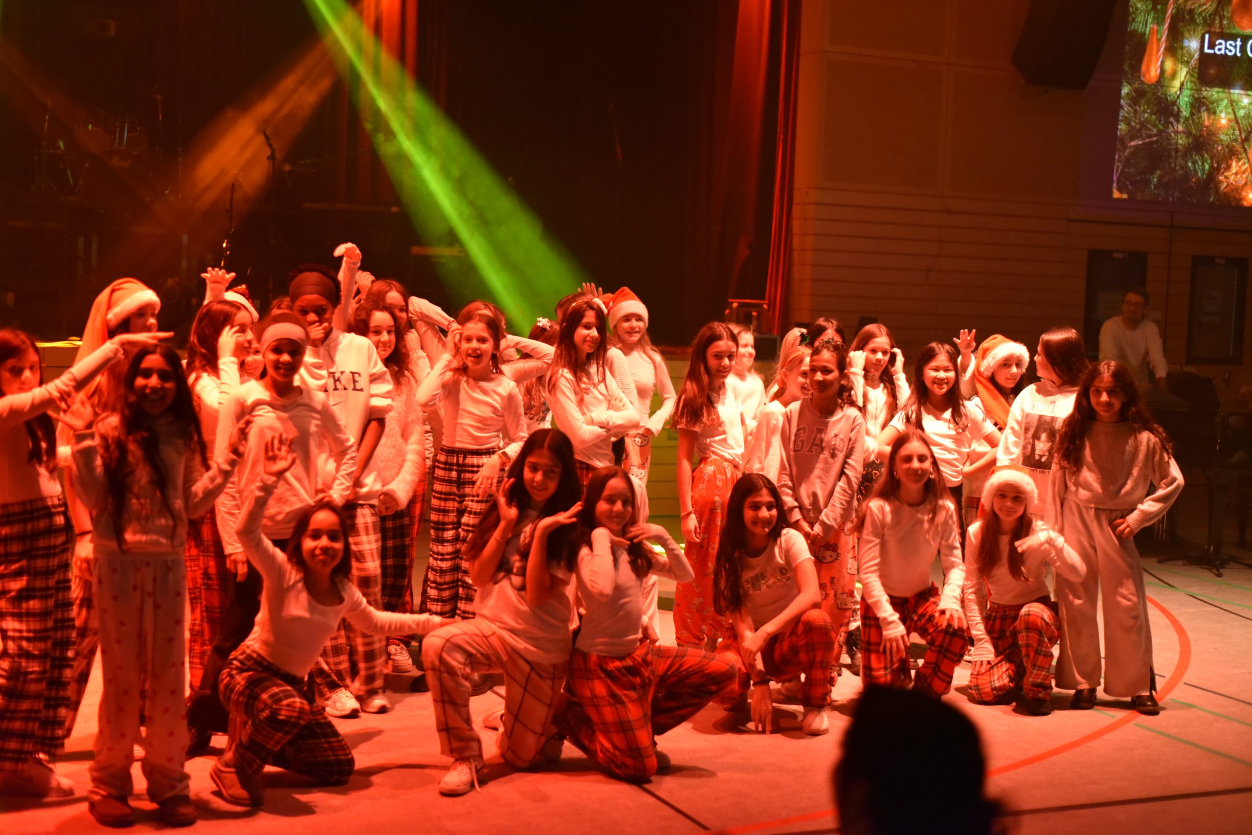 Eine Gruppe von Schülern steht auf der Bühne und singt. Viele tragen Weihnachtsmützen und weiße Hemden. Einige halten Instrumente. Die Bühne ist mit bunten Lichtern beleuchtet, und im Hintergrund sind weitere Schüler zu sehen. Eine Lehrkraft steht rechts und schaut auf die Gruppe.