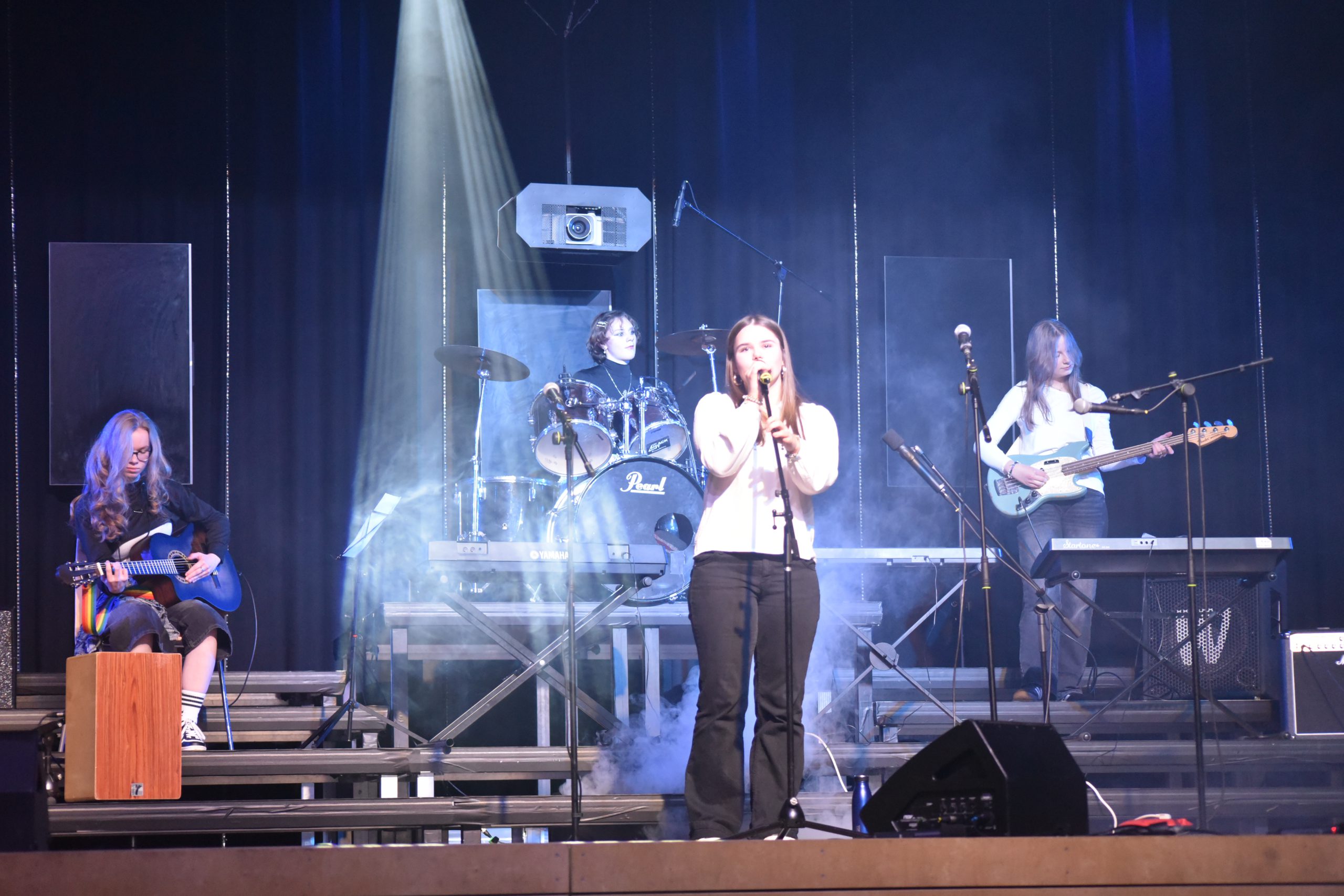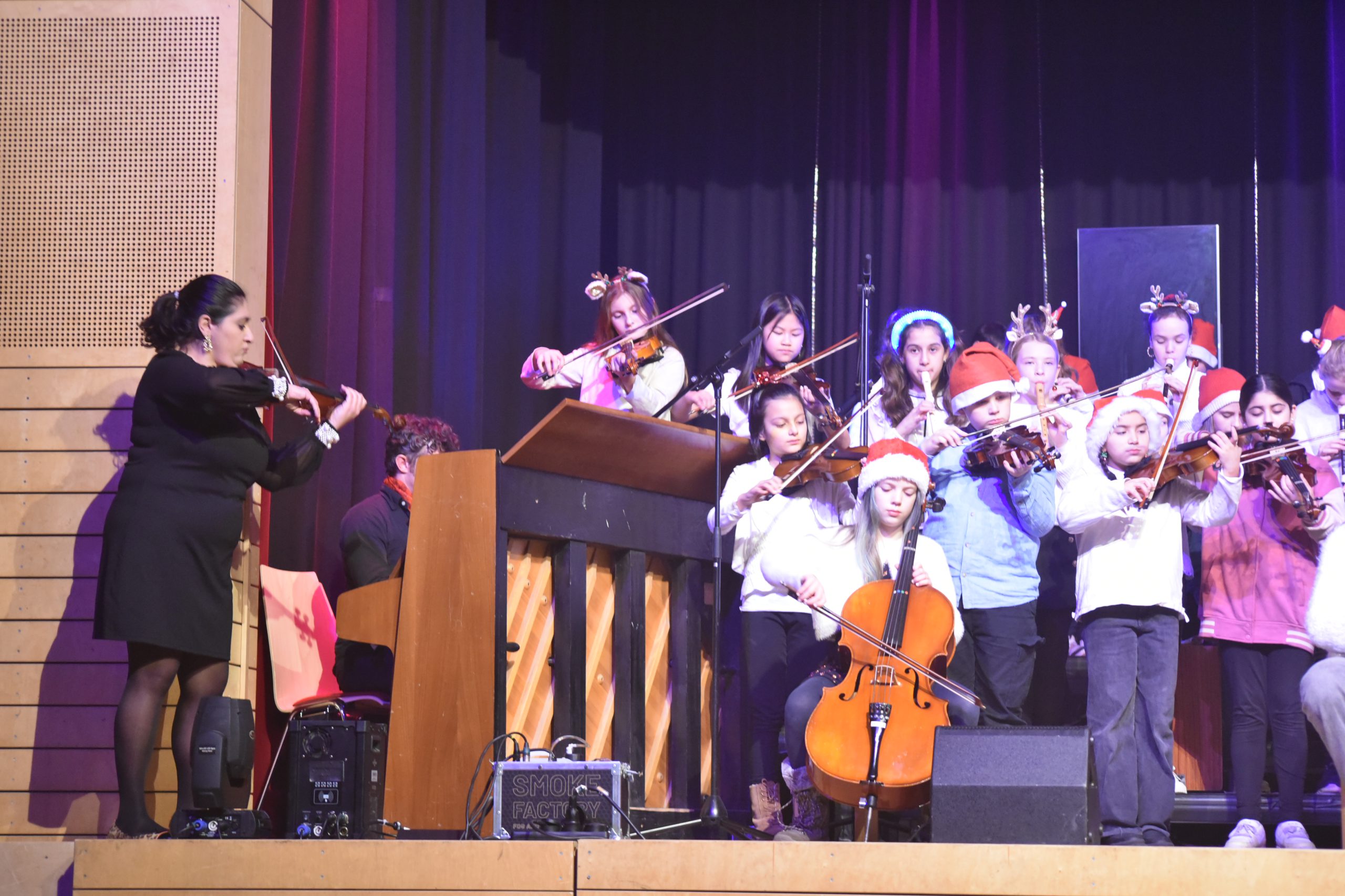 Eine Gruppe von acht Personen steht auf einer Bühne, alle halten eine Rose in der Hand. Sie tragen verschiedene Outfits, darunter ein rotes Kleid und formelle Kleidung. Im Hintergrund sind Mikrofone und Bühnenbeleuchtung sichtbar. Die Atmosphäre scheint festlich und feierlich zu sein. Ein Mann steht auf einer Kiste und singt in ein Mikrofon, während er von einem Orchester begleitet wird. Im Hintergrund sind Musiker mit Celli zu sehen. Der Mann trägt einen schwarzen Anzug und eine rote Mütze. Die Bühne ist schwach beleuchtet, was eine dramatische Atmosphäre schafft. Ein Kinderorchester steht auf der Bühne und spielt. Die Musiker tragen Weihnachtsmützen und spielen verschiedene Instrumente wie Violine und Cello. Ein Dirigent leitet das Orchester von vorne. Die Bühne ist festlich beleuchtet. Eine Gruppe von Schülern steht auf der Bühne und singt. Viele tragen Weihnachtsmützen und weiße Hemden. Einige halten Instrumente. Die Bühne ist mit bunten Lichtern beleuchtet, und im Hintergrund sind weitere Schüler zu sehen. Eine Lehrkraft steht rechts und schaut auf die Gruppe. Eine Gruppe von Kindern und Jugendlichen spielt auf der Bühne verschiedene Musikinstrumente, darunter Geigen und Celli. Im Hintergrund sind einige Musiker zu sehen, die konzentriert musizieren. Die Bühne ist schwach beleuchtet, mit rotem Licht, und ein Notenständer steht im Vordergrund. Eine Gruppe von jungen Musikern spielt auf der Bühne, während eine Lehrerin mit einem Geigenbogen dirigiert. Die Kinder tragen Weihnachtsmützen und spielen verschiedene Streichinstrumente, darunter Geigen und ein Cello. Im Hintergrund sind bunte Lichter und eine festliche Dekoration zu sehen. Eine Band tritt auf einer Bühne auf. Im Vordergrund steht eine Sängerin mit Mikrofon, während im Hintergrund eine Schlagzeugerin und zwei weitere Musiker an Gitarre und Keyboard spielen. Die Bühne ist mit Nebel und Lichtstrahlen beleuchtet. Die Musiker befinden sich auf erhöhten Podesten. Eine Gruppe von fünf Musikern steht auf einer Bühne. Zwei Sängerinnen mit Mikrofonen sind in der Mitte, während ein Musiker mit einer Cajón links und ein weiterer mit einer Gitarre rechts stehen. Ein weiterer Musiker mit einer Mütze ist im Hintergrund zu sehen. Die Bühne ist schwach beleuchtet und mit verschiedenen Musikinstrumenten ausgestattet. Drei Musikerinnen und Musiker stehen auf einer Bühne. Eine Sängerin in einem weißen Kleid hält ein Mikrofon, während eine andere Musikerin mit einer E-Gitarre spielt. Der dritte Musiker steht daneben und hat ein Mikrofon in der Hand. Die Bühne ist mit bunten Lichtern beleuchtet und im Hintergrund sind Musikinstrumente sichtbar. Es herrscht eine festliche Atmosphäre. Eine Musikband tritt auf einer Bühne auf. Im Vordergrund steht eine Sängerin mit Mikrofon, während ein Musiker auf einem Cajón sitzt. Im Hintergrund sind weitere Bandmitglieder zu sehen, die verschiedene Instrumente spielen, darunter ein Schlagzeug und eine E-Gitarre. Die Bühne ist mit bunten Lichtern beleuchtet. Eine Gruppe von Mädchen in festlicher Kleidung steht auf einer Bühne. Sie posieren fröhlich, einige machen lustige Gesten. Im Hintergrund sind farbige Lichter und eine Bühne zu sehen. Ein Orchester spielt auf einer Bühne in einem Veranstaltungsraum. Die Musikerinnen und Musiker tragen rote Hüte und spielen verschiedene Instrumente, während ein Dirigent sie anleitet. Die Bühne ist beleuchtet, und im Hintergrund sind Vorhänge zu sehen. Eine Gruppe von Schülerinnen und Schülern steht auf einer Bühne und singt. Sie tragen überwiegend helle Kleidung und sind in einer festlichen Atmosphäre mit buntem Licht beleuchtet. Im Vordergrund ist eine Person in schwarzer Kleidung zu sehen, die die Gruppe leitet. Im Hintergrund sind Instrumente und Ständer für Noten zu erkennen. Eine Gruppe von Kindern und Jugendlichen steht auf einer Bühne und singt. Im Vordergrund sitzen zwei Musiker an einem Klavier. Der Raum ist schwach beleuchtet, mit bunten Lichtstrahlen, die von der Bühne ausgehen. Die Sänger tragen überwiegend helle Kleidung, während einer der Musiker einen schwarzen Anzug und einen Hut trägt. Eine Gruppe von Kindern und Jugendlichen steht und sitzt auf einer Bühne, die musizieren und singen. Viele tragen Weihnachtsmützen und T-Shirts. Einige halten Gitarren, während andere im Hintergrund stehen und mitspielen. Die Bühne ist festlich dekoriert, und es gibt ein leichtes Nebellicht.