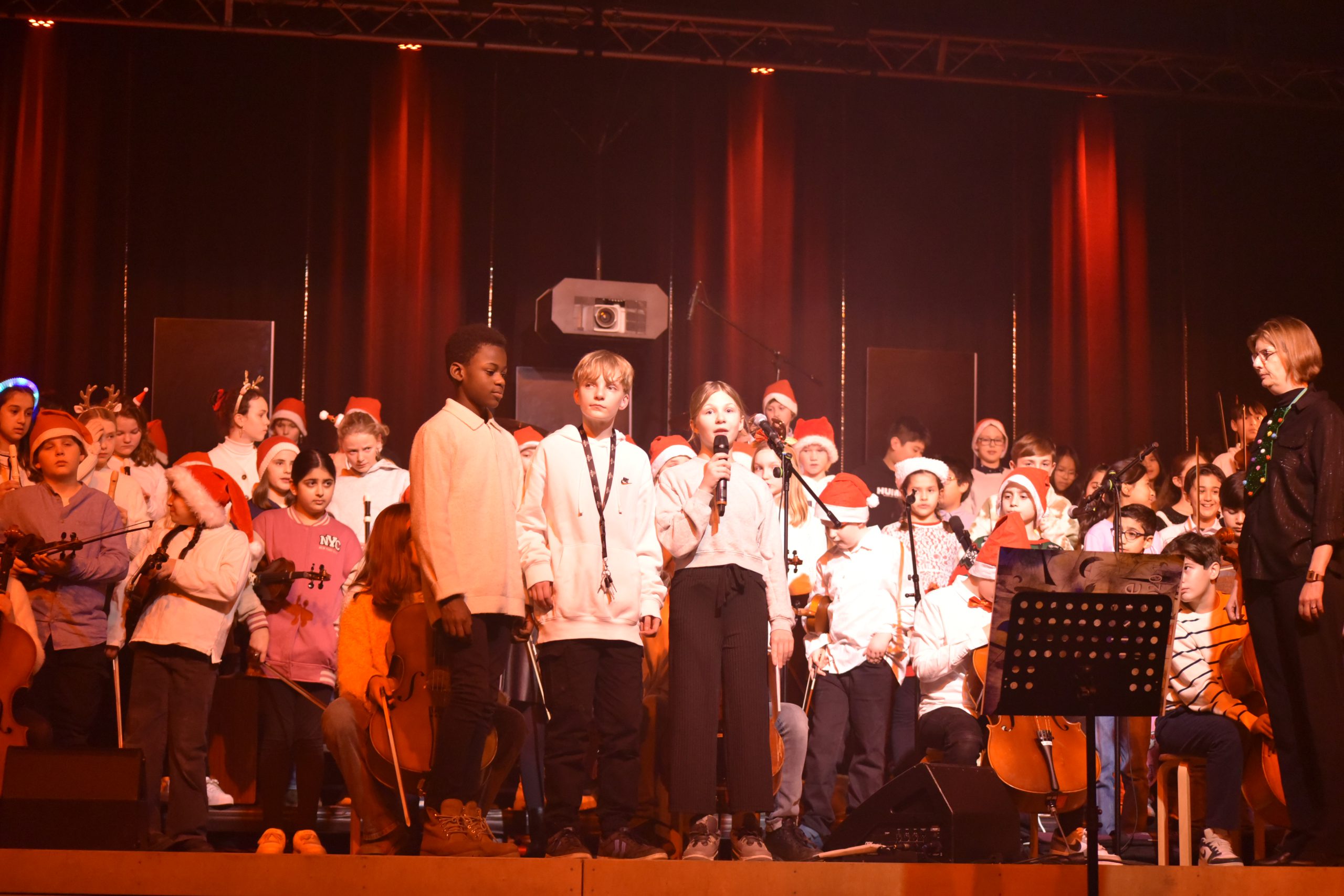 Eine Gruppe von acht Personen steht auf einer Bühne, alle halten eine Rose in der Hand. Sie tragen verschiedene Outfits, darunter ein rotes Kleid und formelle Kleidung. Im Hintergrund sind Mikrofone und Bühnenbeleuchtung sichtbar. Die Atmosphäre scheint festlich und feierlich zu sein. Ein Mann steht auf einer Kiste und singt in ein Mikrofon, während er von einem Orchester begleitet wird. Im Hintergrund sind Musiker mit Celli zu sehen. Der Mann trägt einen schwarzen Anzug und eine rote Mütze. Die Bühne ist schwach beleuchtet, was eine dramatische Atmosphäre schafft. Ein Kinderorchester steht auf der Bühne und spielt. Die Musiker tragen Weihnachtsmützen und spielen verschiedene Instrumente wie Violine und Cello. Ein Dirigent leitet das Orchester von vorne. Die Bühne ist festlich beleuchtet. Eine Gruppe von Schülern steht auf der Bühne und singt. Viele tragen Weihnachtsmützen und weiße Hemden. Einige halten Instrumente. Die Bühne ist mit bunten Lichtern beleuchtet, und im Hintergrund sind weitere Schüler zu sehen. Eine Lehrkraft steht rechts und schaut auf die Gruppe. Eine Gruppe von Kindern und Jugendlichen spielt auf der Bühne verschiedene Musikinstrumente, darunter Geigen und Celli. Im Hintergrund sind einige Musiker zu sehen, die konzentriert musizieren. Die Bühne ist schwach beleuchtet, mit rotem Licht, und ein Notenständer steht im Vordergrund. Eine Gruppe von jungen Musikern spielt auf der Bühne, während eine Lehrerin mit einem Geigenbogen dirigiert. Die Kinder tragen Weihnachtsmützen und spielen verschiedene Streichinstrumente, darunter Geigen und ein Cello. Im Hintergrund sind bunte Lichter und eine festliche Dekoration zu sehen. Eine Band tritt auf einer Bühne auf. Im Vordergrund steht eine Sängerin mit Mikrofon, während im Hintergrund eine Schlagzeugerin und zwei weitere Musiker an Gitarre und Keyboard spielen. Die Bühne ist mit Nebel und Lichtstrahlen beleuchtet. Die Musiker befinden sich auf erhöhten Podesten. Eine Gruppe von fünf Musikern steht auf einer Bühne. Zwei Sängerinnen mit Mikrofonen sind in der Mitte, während ein Musiker mit einer Cajón links und ein weiterer mit einer Gitarre rechts stehen. Ein weiterer Musiker mit einer Mütze ist im Hintergrund zu sehen. Die Bühne ist schwach beleuchtet und mit verschiedenen Musikinstrumenten ausgestattet. Drei Musikerinnen und Musiker stehen auf einer Bühne. Eine Sängerin in einem weißen Kleid hält ein Mikrofon, während eine andere Musikerin mit einer E-Gitarre spielt. Der dritte Musiker steht daneben und hat ein Mikrofon in der Hand. Die Bühne ist mit bunten Lichtern beleuchtet und im Hintergrund sind Musikinstrumente sichtbar. Es herrscht eine festliche Atmosphäre. Eine Musikband tritt auf einer Bühne auf. Im Vordergrund steht eine Sängerin mit Mikrofon, während ein Musiker auf einem Cajón sitzt. Im Hintergrund sind weitere Bandmitglieder zu sehen, die verschiedene Instrumente spielen, darunter ein Schlagzeug und eine E-Gitarre. Die Bühne ist mit bunten Lichtern beleuchtet. Eine Gruppe von Mädchen in festlicher Kleidung steht auf einer Bühne. Sie posieren fröhlich, einige machen lustige Gesten. Im Hintergrund sind farbige Lichter und eine Bühne zu sehen. Ein Orchester spielt auf einer Bühne in einem Veranstaltungsraum. Die Musikerinnen und Musiker tragen rote Hüte und spielen verschiedene Instrumente, während ein Dirigent sie anleitet. Die Bühne ist beleuchtet, und im Hintergrund sind Vorhänge zu sehen. Eine Gruppe von Schülerinnen und Schülern steht auf einer Bühne und singt. Sie tragen überwiegend helle Kleidung und sind in einer festlichen Atmosphäre mit buntem Licht beleuchtet. Im Vordergrund ist eine Person in schwarzer Kleidung zu sehen, die die Gruppe leitet. Im Hintergrund sind Instrumente und Ständer für Noten zu erkennen. Eine Gruppe von Kindern und Jugendlichen steht auf einer Bühne und singt. Im Vordergrund sitzen zwei Musiker an einem Klavier. Der Raum ist schwach beleuchtet, mit bunten Lichtstrahlen, die von der Bühne ausgehen. Die Sänger tragen überwiegend helle Kleidung, während einer der Musiker einen schwarzen Anzug und einen Hut trägt. Eine Gruppe von Kindern und Jugendlichen steht und sitzt auf einer Bühne, die musizieren und singen. Viele tragen Weihnachtsmützen und T-Shirts. Einige halten Gitarren, während andere im Hintergrund stehen und mitspielen. Die Bühne ist festlich dekoriert, und es gibt ein leichtes Nebellicht.