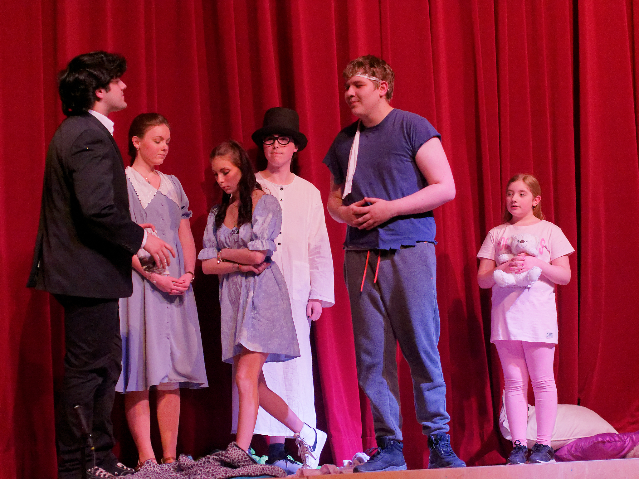 Und diesen Moment haben die Darsteller genossen und den Zuschauern einen sehr kurzweiligen und witzigen Theaterabend geboten. Mit der Fee Tinkerbell und Peter Pan in einer glitzernden Diskojacke, der seinen Schatten bei der Familie Darling verliert, beginnt die bekannte Geschichte von James Matthew Barrie. Die Familie Darling samt dem „Kindermädchen“ Nana, einem knuffigen Hund, stellt sich vor – gespielt wird bis dahin auf der Vorbühne bei geschlossenem Vorhang. Als Peter Pan zurückkehrt, um seinen Schatten zu holen, bemerken ihn die Kinder der Familie Darling, insbesondere die selbstbewusste Wendy, die sich sofort ein wenig in den verlorenen Jungen verliebt. Er überzeugt die Kinder, ihn ins Niemalsland zu begleiten, wo er mit den Verlorenen Jungs lebt, um dem Erwachsenwerden zu entkommen. Nun beginnt das eigentliche Spektakel: Der Vorhang öffnet sich und dem Zuschauer bietet sich ein fantasievolles Bühnenbild, welches den Darstellern, die zum Teil in neuen Rollen auftreten, unter anderem als Kulisse für rasante Schlauchbootfahrten, gezielte Bogenschüsse, wilde Verfolgungsjagden und spielerische Schwertkämpfe dient. Unterstützt wird dieses Szenario durch eine wirklich gelungene Musikauswahl, die von Kate Bushs Klassiker „Wutherings Heights“ bis hin zu Ruth B.´s Hit „Lost Boy“ reicht. Nachdem der beeindruckende Captain Hook, begleitet von einem genialen Smee („Ja, Chef!“) und einem charmanten Starkey, wie immer in dieser Geschichte von Peter Pan und den Verlorenen Jungs sowie der gewieften Tinkerbell besiegt worden ist und die Kinder der Familie Darling gerettet worden sind, endet dieser schwungvolle Theaterabend im Hause der Darlings, die ihre Tür auch den Verlorenen Jungs öffnet – denn am Ende sehnt sich doch jeder nach einem Ort, den er Zuhause nennen kann, auch ein noch so cooler Peter Pan in grünglitzernder Diskojacke.