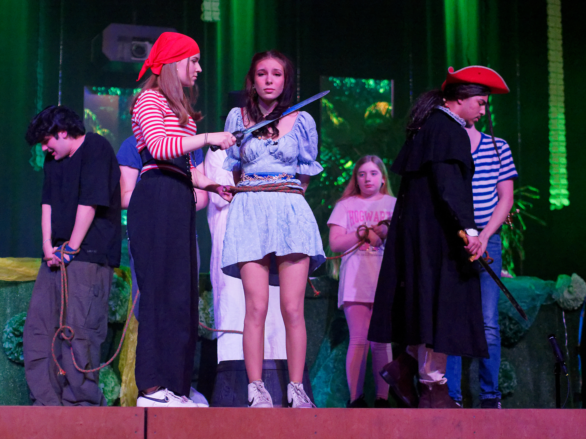 Und diesen Moment haben die Darsteller genossen und den Zuschauern einen sehr kurzweiligen und witzigen Theaterabend geboten. Mit der Fee Tinkerbell und Peter Pan in einer glitzernden Diskojacke, der seinen Schatten bei der Familie Darling verliert, beginnt die bekannte Geschichte von James Matthew Barrie. Die Familie Darling samt dem „Kindermädchen“ Nana, einem knuffigen Hund, stellt sich vor – gespielt wird bis dahin auf der Vorbühne bei geschlossenem Vorhang. Als Peter Pan zurückkehrt, um seinen Schatten zu holen, bemerken ihn die Kinder der Familie Darling, insbesondere die selbstbewusste Wendy, die sich sofort ein wenig in den verlorenen Jungen verliebt. Er überzeugt die Kinder, ihn ins Niemalsland zu begleiten, wo er mit den Verlorenen Jungs lebt, um dem Erwachsenwerden zu entkommen. Nun beginnt das eigentliche Spektakel: Der Vorhang öffnet sich und dem Zuschauer bietet sich ein fantasievolles Bühnenbild, welches den Darstellern, die zum Teil in neuen Rollen auftreten, unter anderem als Kulisse für rasante Schlauchbootfahrten, gezielte Bogenschüsse, wilde Verfolgungsjagden und spielerische Schwertkämpfe dient. Unterstützt wird dieses Szenario durch eine wirklich gelungene Musikauswahl, die von Kate Bushs Klassiker „Wutherings Heights“ bis hin zu Ruth B.´s Hit „Lost Boy“ reicht. Nachdem der beeindruckende Captain Hook, begleitet von einem genialen Smee („Ja, Chef!“) und einem charmanten Starkey, wie immer in dieser Geschichte von Peter Pan und den Verlorenen Jungs sowie der gewieften Tinkerbell besiegt worden ist und die Kinder der Familie Darling gerettet worden sind, endet dieser schwungvolle Theaterabend im Hause der Darlings, die ihre Tür auch den Verlorenen Jungs öffnet – denn am Ende sehnt sich doch jeder nach einem Ort, den er Zuhause nennen kann, auch ein noch so cooler Peter Pan in grünglitzernder Diskojacke.