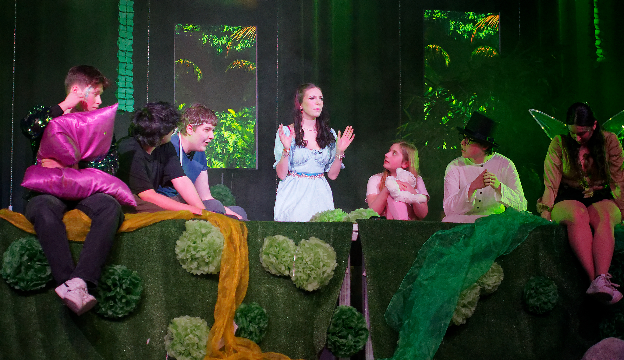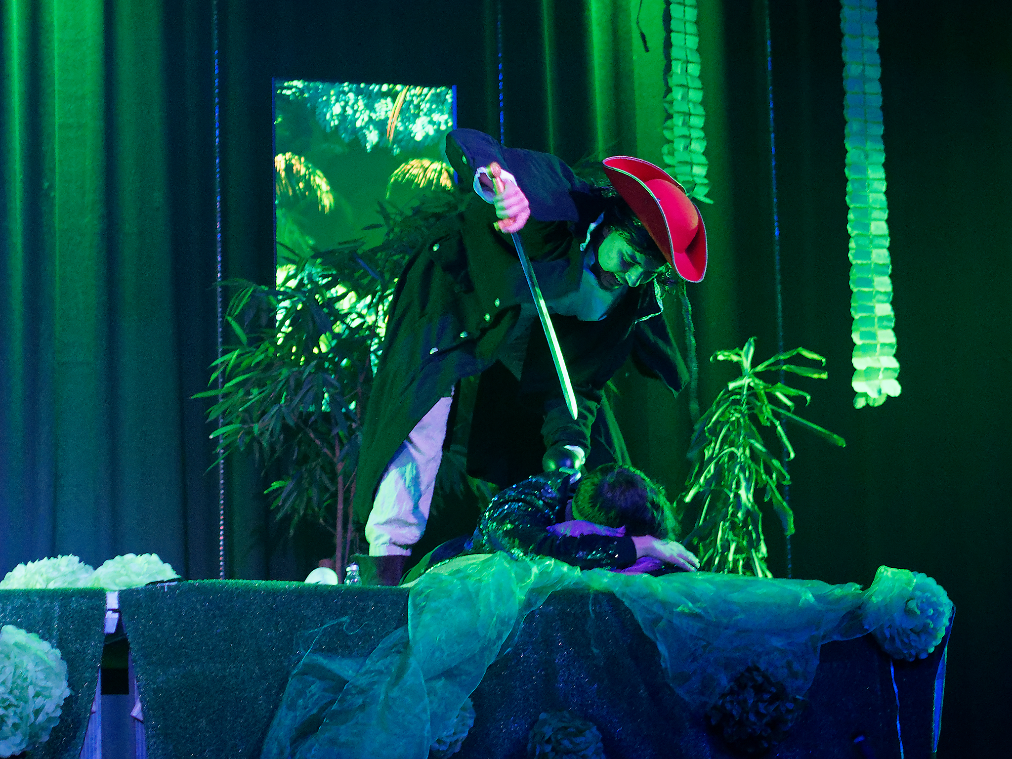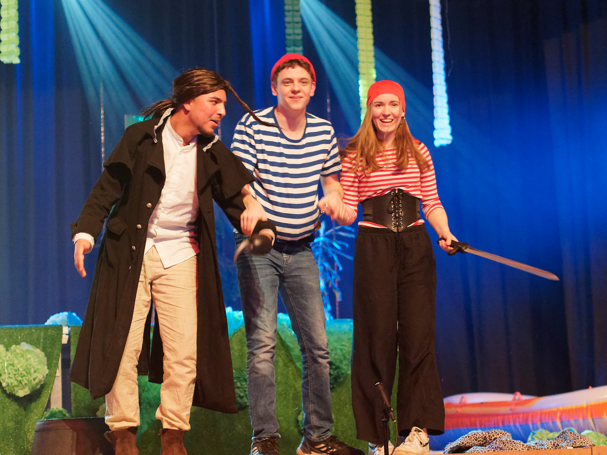 Und diesen Moment haben die Darsteller genossen und den Zuschauern einen sehr kurzweiligen und witzigen Theaterabend geboten. Mit der Fee Tinkerbell und Peter Pan in einer glitzernden Diskojacke, der seinen Schatten bei der Familie Darling verliert, beginnt die bekannte Geschichte von James Matthew Barrie. Die Familie Darling samt dem „Kindermädchen“ Nana, einem knuffigen Hund, stellt sich vor – gespielt wird bis dahin auf der Vorbühne bei geschlossenem Vorhang. Als Peter Pan zurückkehrt, um seinen Schatten zu holen, bemerken ihn die Kinder der Familie Darling, insbesondere die selbstbewusste Wendy, die sich sofort ein wenig in den verlorenen Jungen verliebt. Er überzeugt die Kinder, ihn ins Niemalsland zu begleiten, wo er mit den Verlorenen Jungs lebt, um dem Erwachsenwerden zu entkommen. Nun beginnt das eigentliche Spektakel: Der Vorhang öffnet sich und dem Zuschauer bietet sich ein fantasievolles Bühnenbild, welches den Darstellern, die zum Teil in neuen Rollen auftreten, unter anderem als Kulisse für rasante Schlauchbootfahrten, gezielte Bogenschüsse, wilde Verfolgungsjagden und spielerische Schwertkämpfe dient. Unterstützt wird dieses Szenario durch eine wirklich gelungene Musikauswahl, die von Kate Bushs Klassiker „Wutherings Heights“ bis hin zu Ruth B.´s Hit „Lost Boy“ reicht. Nachdem der beeindruckende Captain Hook, begleitet von einem genialen Smee („Ja, Chef!“) und einem charmanten Starkey, wie immer in dieser Geschichte von Peter Pan und den Verlorenen Jungs sowie der gewieften Tinkerbell besiegt worden ist und die Kinder der Familie Darling gerettet worden sind, endet dieser schwungvolle Theaterabend im Hause der Darlings, die ihre Tür auch den Verlorenen Jungs öffnet – denn am Ende sehnt sich doch jeder nach einem Ort, den er Zuhause nennen kann, auch ein noch so cooler Peter Pan in grünglitzernder Diskojacke.