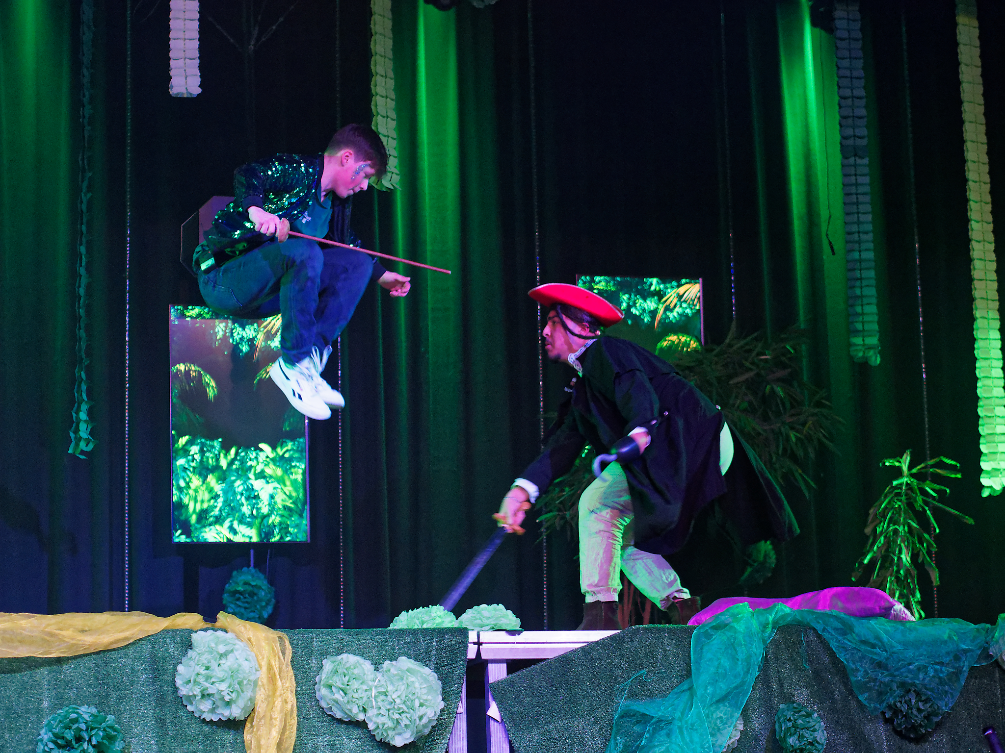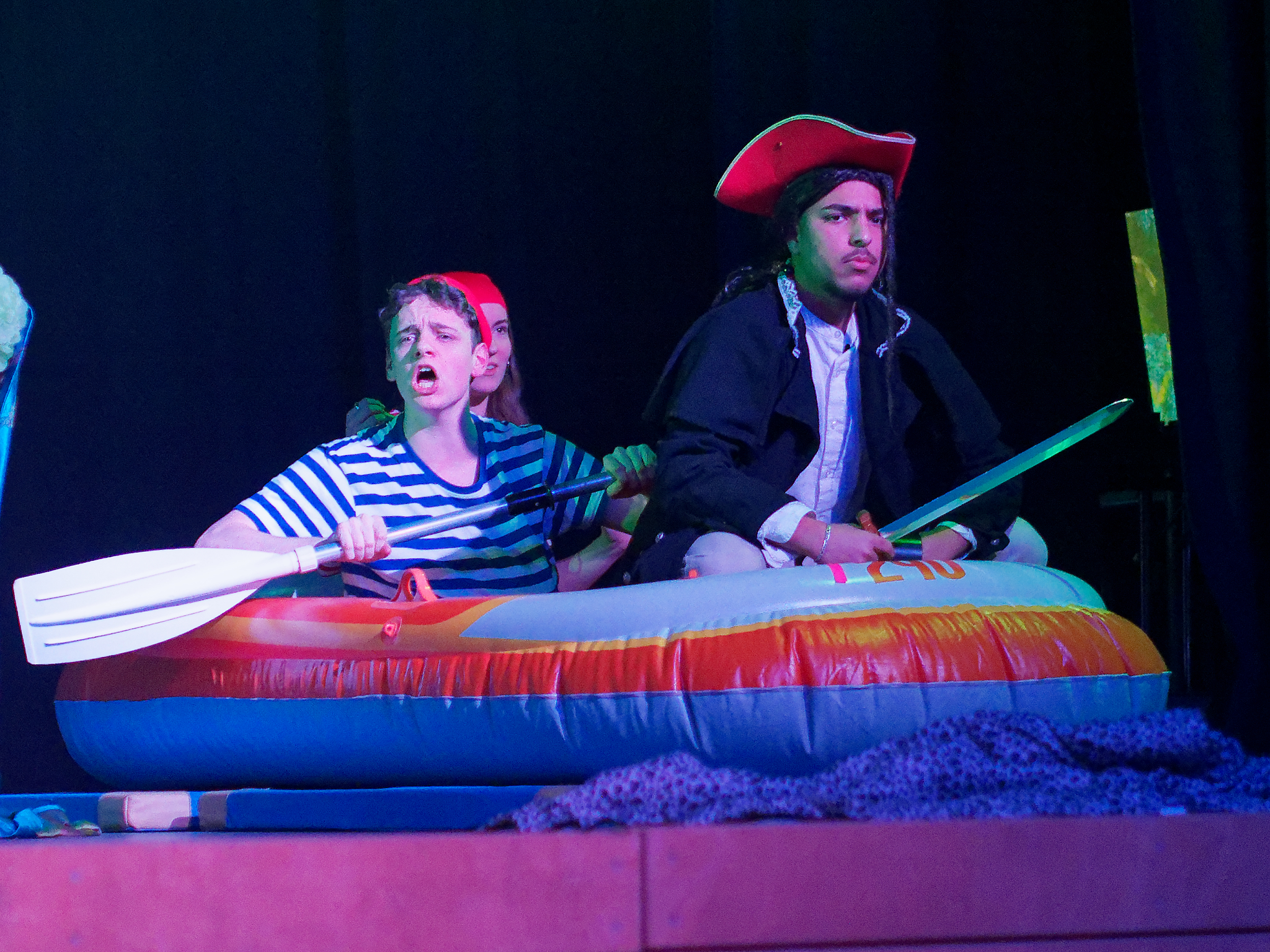 Und diesen Moment haben die Darsteller genossen und den Zuschauern einen sehr kurzweiligen und witzigen Theaterabend geboten. Mit der Fee Tinkerbell und Peter Pan in einer glitzernden Diskojacke, der seinen Schatten bei der Familie Darling verliert, beginnt die bekannte Geschichte von James Matthew Barrie. Die Familie Darling samt dem „Kindermädchen“ Nana, einem knuffigen Hund, stellt sich vor – gespielt wird bis dahin auf der Vorbühne bei geschlossenem Vorhang. Als Peter Pan zurückkehrt, um seinen Schatten zu holen, bemerken ihn die Kinder der Familie Darling, insbesondere die selbstbewusste Wendy, die sich sofort ein wenig in den verlorenen Jungen verliebt. Er überzeugt die Kinder, ihn ins Niemalsland zu begleiten, wo er mit den Verlorenen Jungs lebt, um dem Erwachsenwerden zu entkommen. Nun beginnt das eigentliche Spektakel: Der Vorhang öffnet sich und dem Zuschauer bietet sich ein fantasievolles Bühnenbild, welches den Darstellern, die zum Teil in neuen Rollen auftreten, unter anderem als Kulisse für rasante Schlauchbootfahrten, gezielte Bogenschüsse, wilde Verfolgungsjagden und spielerische Schwertkämpfe dient. Unterstützt wird dieses Szenario durch eine wirklich gelungene Musikauswahl, die von Kate Bushs Klassiker „Wutherings Heights“ bis hin zu Ruth B.´s Hit „Lost Boy“ reicht. Nachdem der beeindruckende Captain Hook, begleitet von einem genialen Smee („Ja, Chef!“) und einem charmanten Starkey, wie immer in dieser Geschichte von Peter Pan und den Verlorenen Jungs sowie der gewieften Tinkerbell besiegt worden ist und die Kinder der Familie Darling gerettet worden sind, endet dieser schwungvolle Theaterabend im Hause der Darlings, die ihre Tür auch den Verlorenen Jungs öffnet – denn am Ende sehnt sich doch jeder nach einem Ort, den er Zuhause nennen kann, auch ein noch so cooler Peter Pan in grünglitzernder Diskojacke.