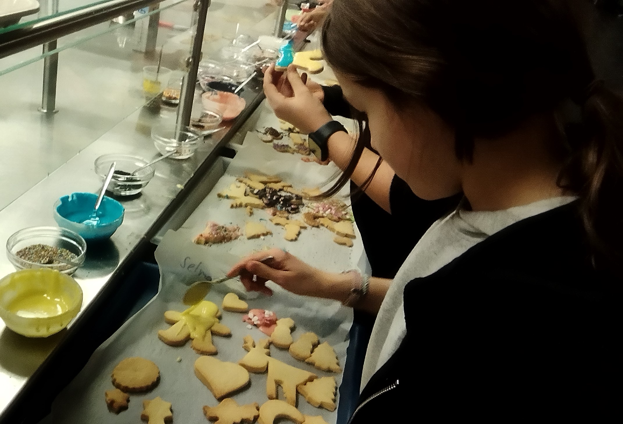 Am Mittwoch, den 14.12., haben wir am Nachmittag gemeinsam mit dem Ganztag und ca. 20 Fünft- und Sechstklässlern in der Mensa Plätzchen gebacken. Nach einer wilden Mehlschlacht fiel das Kekse backen noch viel leichter, nur das Aufräumen wurde zum Graus. Am Ende hatten wir viele leckere und bunt verzierte Kekse und nach dem Naschen blieben tatsächlich noch einige für die nächsten Tage übrig.