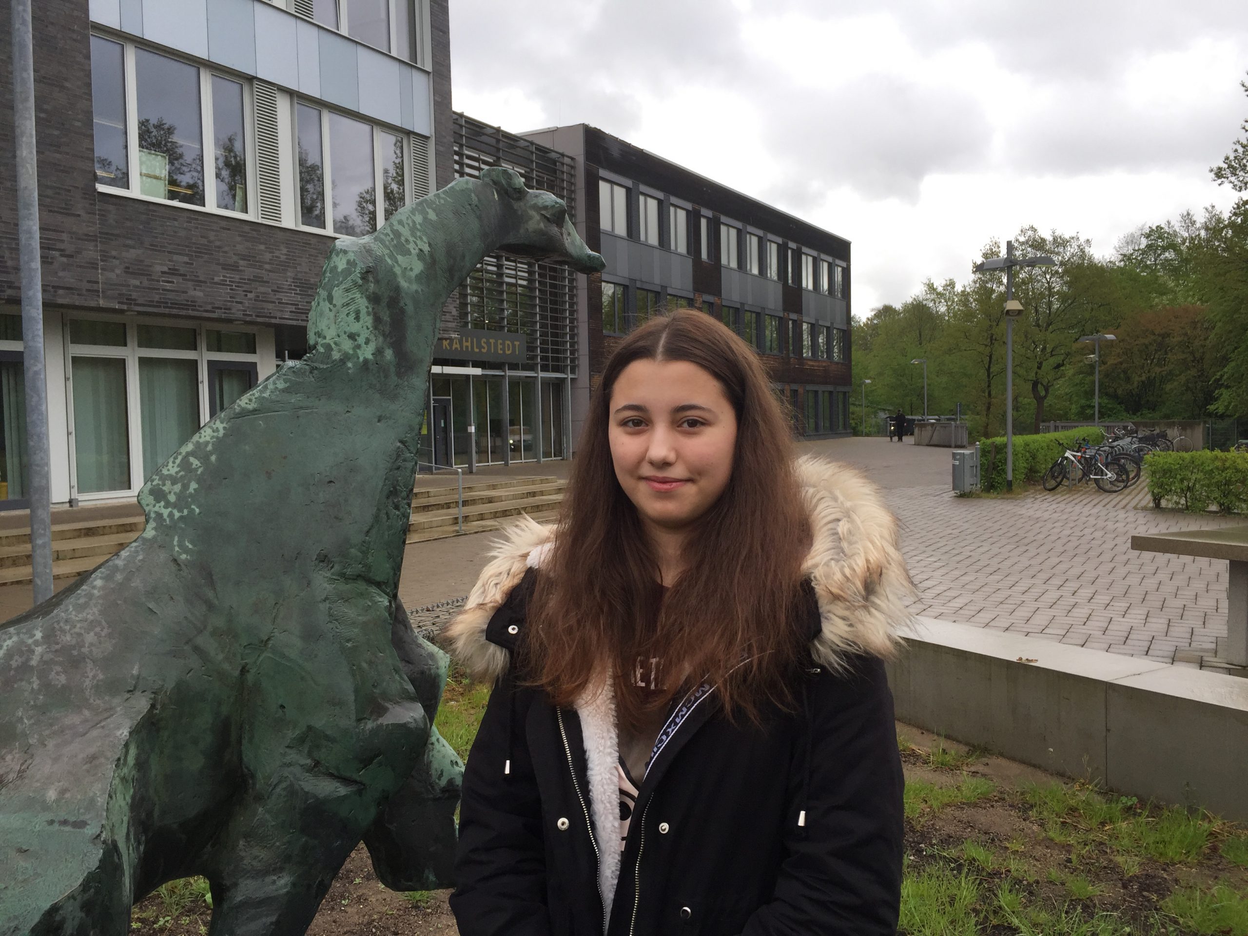 Eine junge Frau mit langen, braunen Haaren steht vor einer Skulptur eines Pferdes, in einem urbanen Umfeld. Im Hintergrund sind moderne Gebäude und ein gepflasterter Weg sichtbar. Der Himmel ist bewölkt. Die Frau trägt eine schwarze Jacke mit einem weißen Innenfutter.