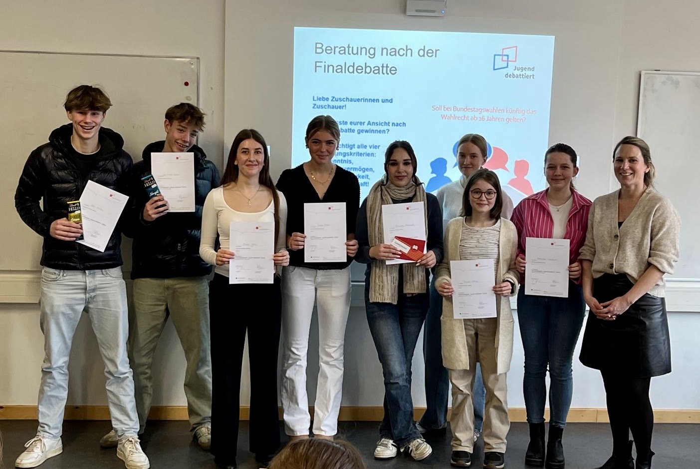 De jury's, bestaande uit zes leerlingen uit leerjaar 10 en 11 en twee leraren, beraadden na de debatten onder de criteria Kennis van zaken, Gespreksvaardigheid, Overtuigingskracht en Uitdrukkingsvermogen en maakten hun beslissingen niet licht. In het schoolfinale haalden Yasminka Alahmad (9e), Janina Evers (9e), Emma Jozic (9e) en Fiona Korth (9c) de finale. Ze leverden zich woordgewandt een aspectrijke slag uitwisseling van standpunten over de vraag of bij Bundestagsverkiezingen het kiesrecht in de toekomst vanaf 16 jaar zou moeten gelden.