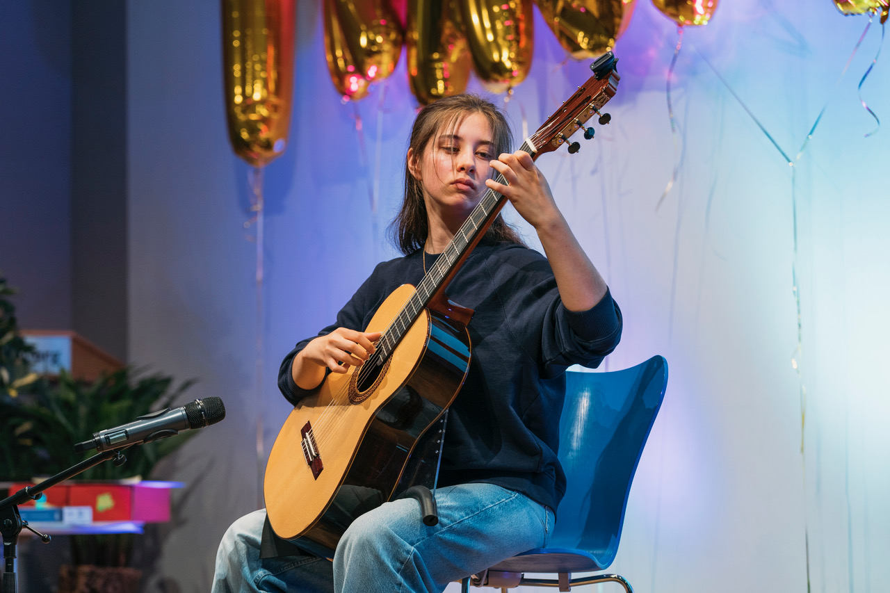 Bei der Preisverleihung am 2. Juli 2024, die im großen Veranstaltungssaal der Zentralbibliothek am Hühnerposten stattfand, spielte Iva Andrejic (9b) ihre eigene Komposition noch einmal live und verzauberte das Publikum mit allen Registern ihres Könnens. Basierend auf einer gleichbleibenden Tonfolge im Bass, entfaltet sich die Dream Rhapsody in schnelleren und nachdenklicheren Abschnitten, wie Iva selbst beschreibt: