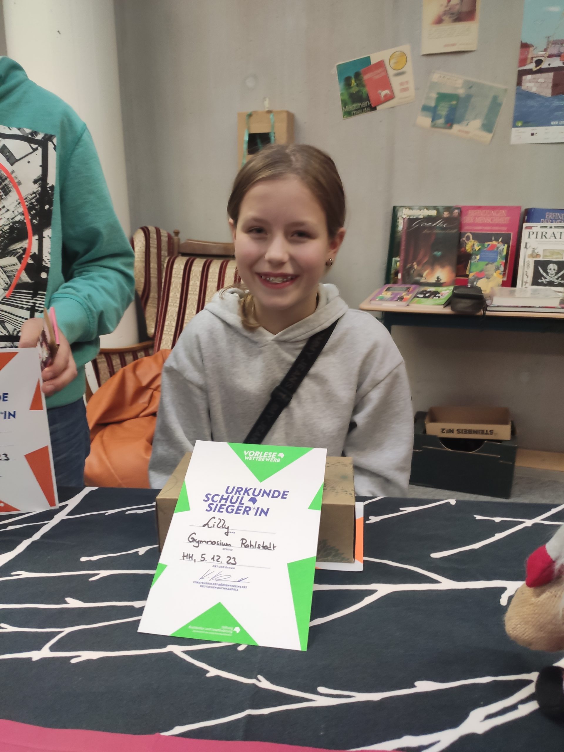 Ferdinand Krüger hatte letztes Jahr den Schulentscheid gewonnen, Frau Wiesner managt seit Jahren das Lesecoaching und unser FSJler Gregor ist den sechsten Klassen vor allem durch die Reise nach Sylt und den Ganztag gut bekannt! Diese hochkarätige Jury sollte nun den Sieger oder die Siegerin festlegen!