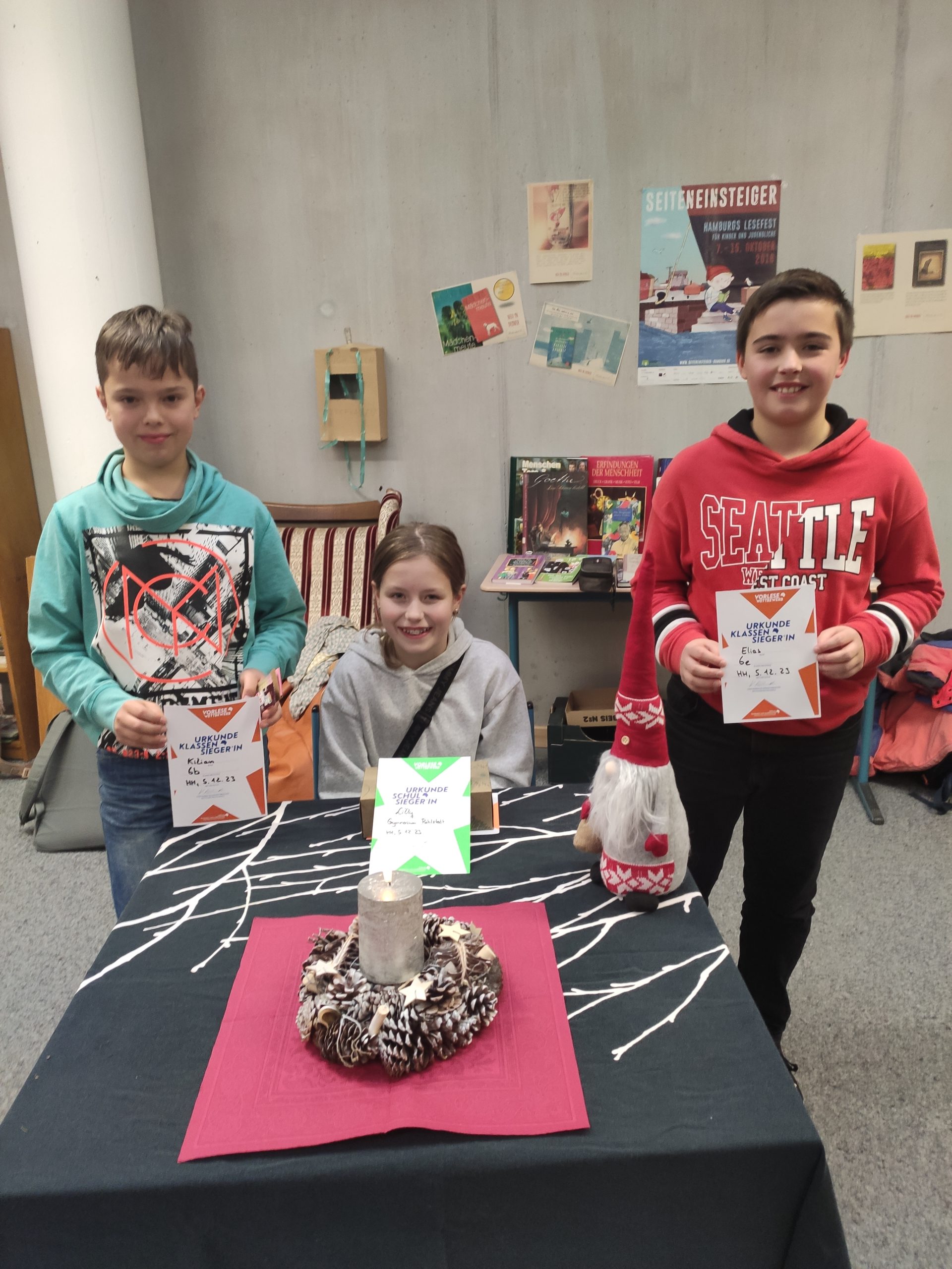 Wie jedes Jahr im Dezember fand an unserer Schule der « Vorlesewettbewerb » statt. Zunächst wurde im Deutschunterricht aller sechsten Klassen der Klassensieger und die Klassensiegerin gefunden und diese traten dann am 5.12 zum Schulentscheid an. In der weihnachtlich geschmückten Bücherei wartete die Jury bereits gespannt auf die Kandidatinnen und Kandidaten: