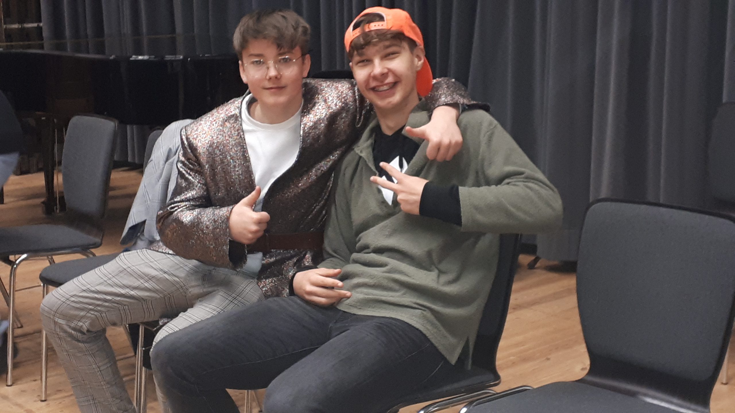 Blick auf eine leere Bühne in einem Theater mit einer dunklen Hintergrundwand. Die Zuschauerbereiche sind sichtbar, mit Holzverkleidung und Stufen. Die Beleuchtung ist gedämpft, und es sind keine Personen auf der Bühne oder im Publikum zu sehen. Zwei junge Männer sitzen in einem Raum auf Stühlen. Der erste trägt eine schimmernde Jacke und gibt einen Daumen hoch, während der zweite in einem grauen Hoodie mit einer orangefarbenen Mütze sitzt und ein Peace-Zeichen zeigt. Im Hintergrund sind dunkle Vorhänge und Stühle sichtbar.Fotos: Anton Bunge, Philip Schröder, Wilhelm Reske