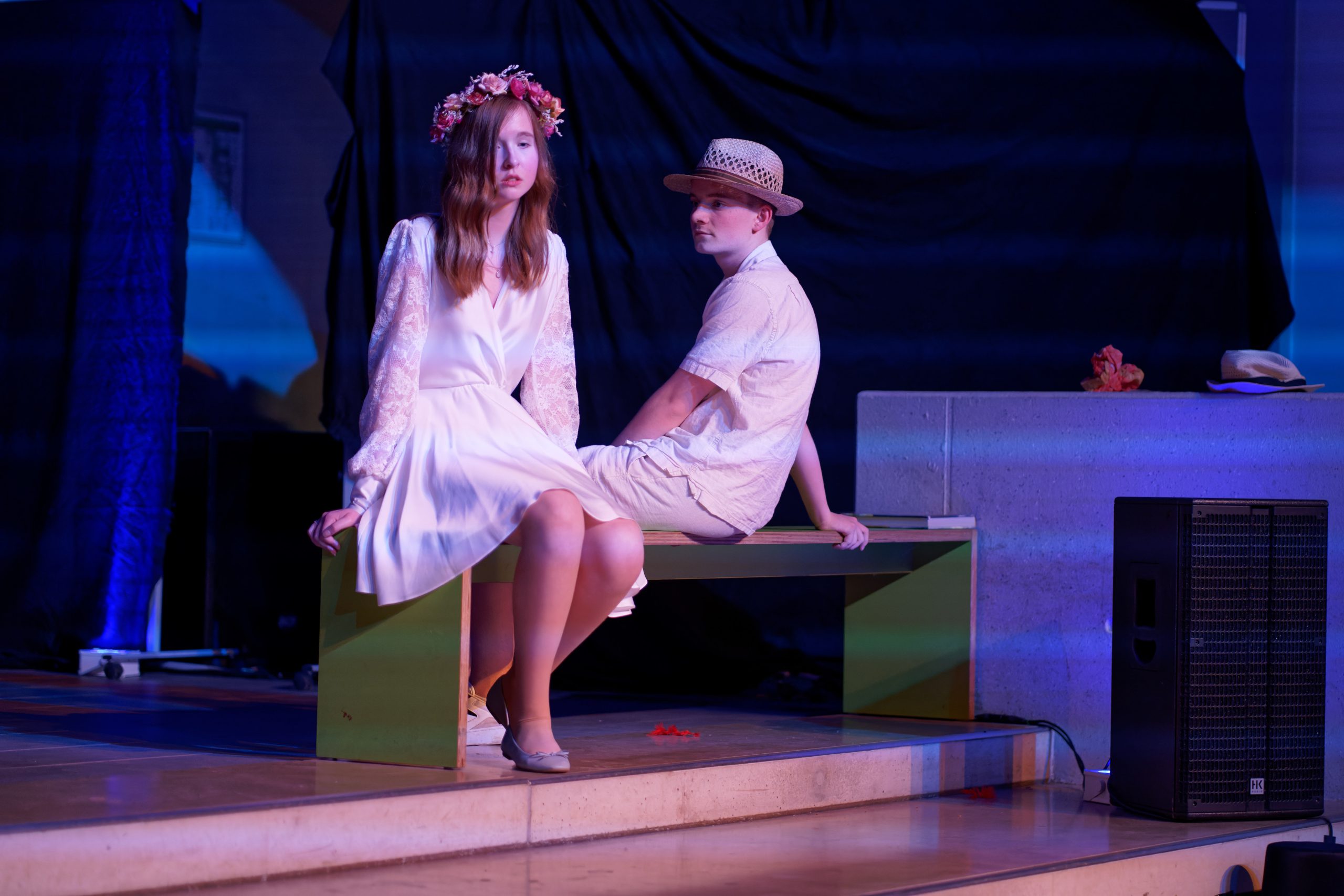 Zwei Frauen auf einer Bühne: Eine steht links in schwarzer Kleidung und schaut die andere an, die in einem weißen Kleid mit Blumenkranz auf einem grauen Stuhl sitzt. Der Hintergrund ist dunkel.